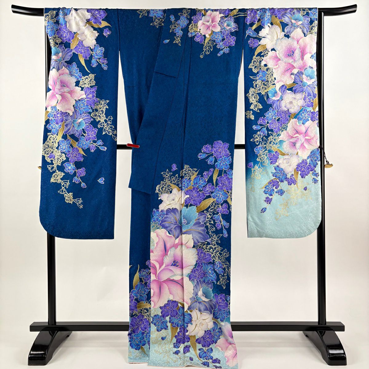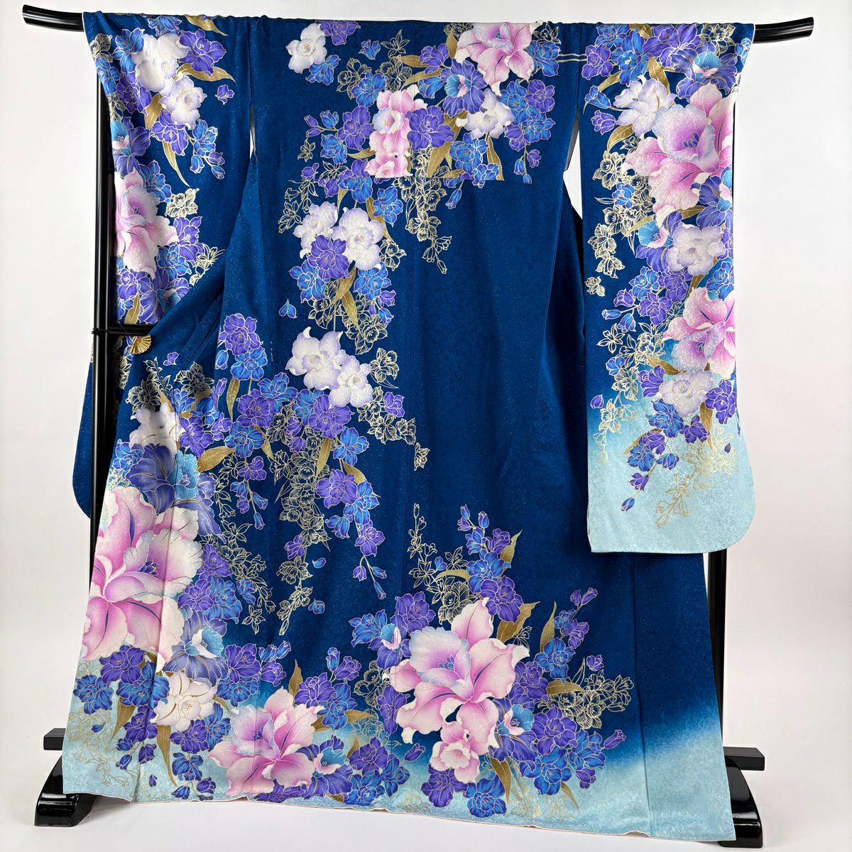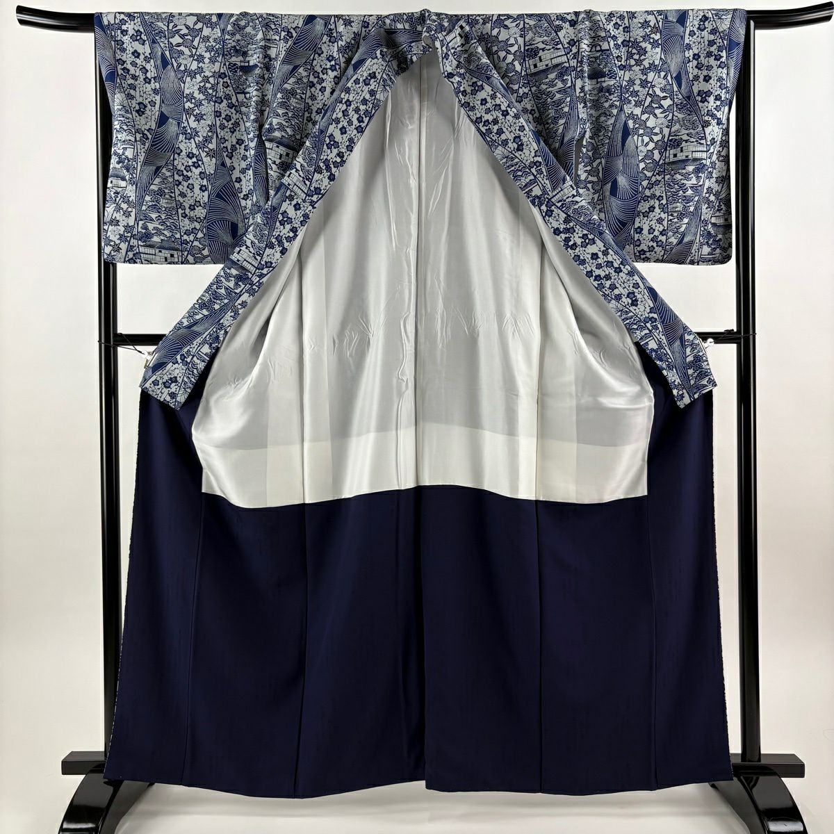 振袖 身丈172.5cm 裄丈71cm L 袷 草花 銀通し 箔 藍色 正絹 逸品