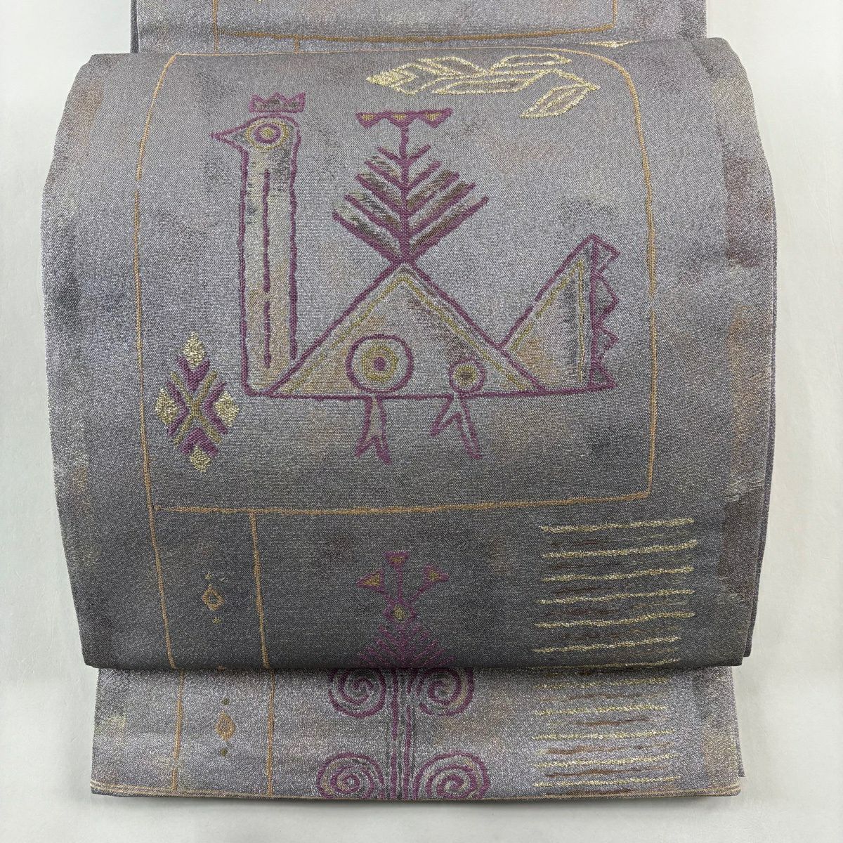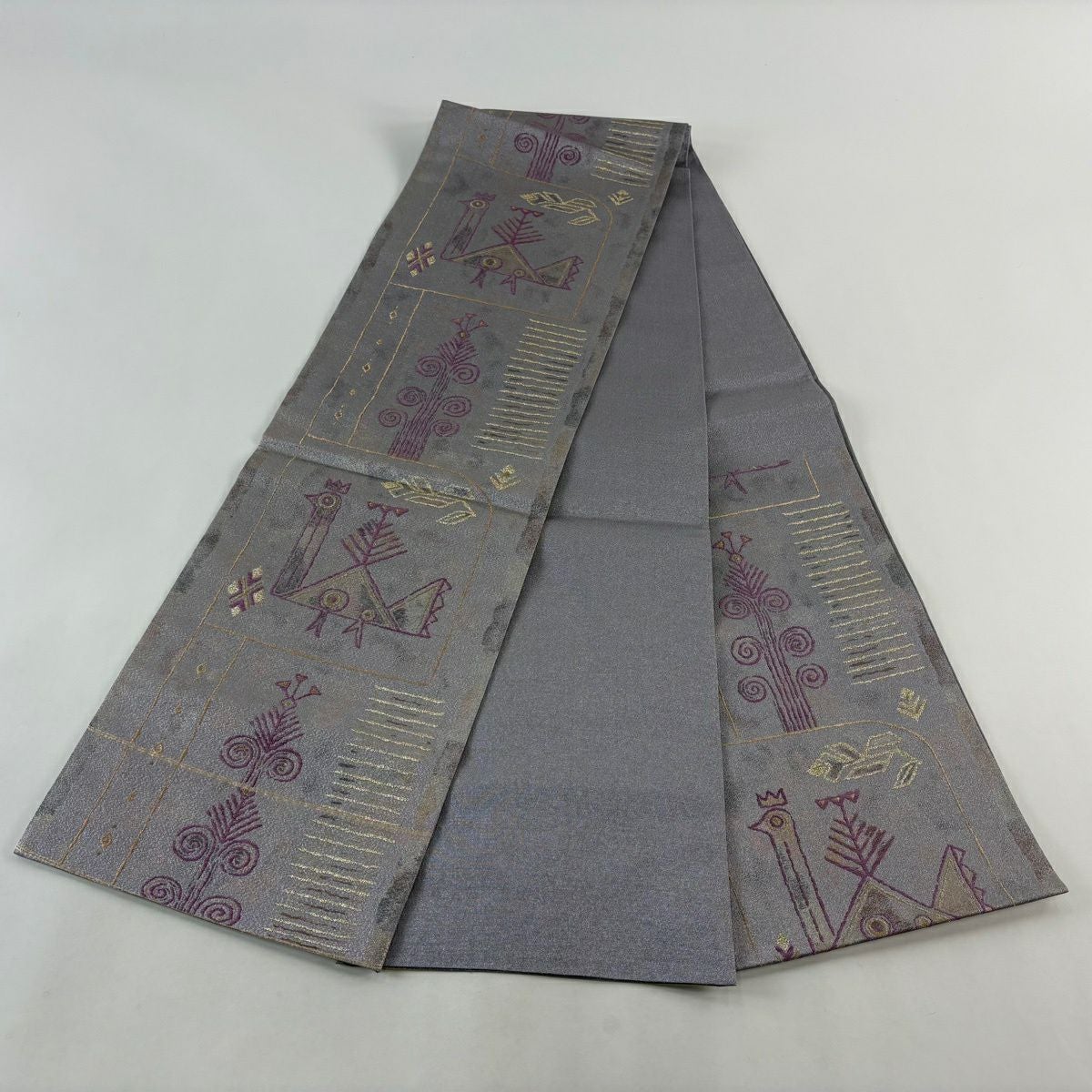 【美品】 袋帯 逸品 落款あり 牛首紬地 草花 金彩 染め分け 薄紫 全通 正絹