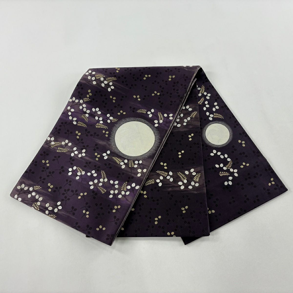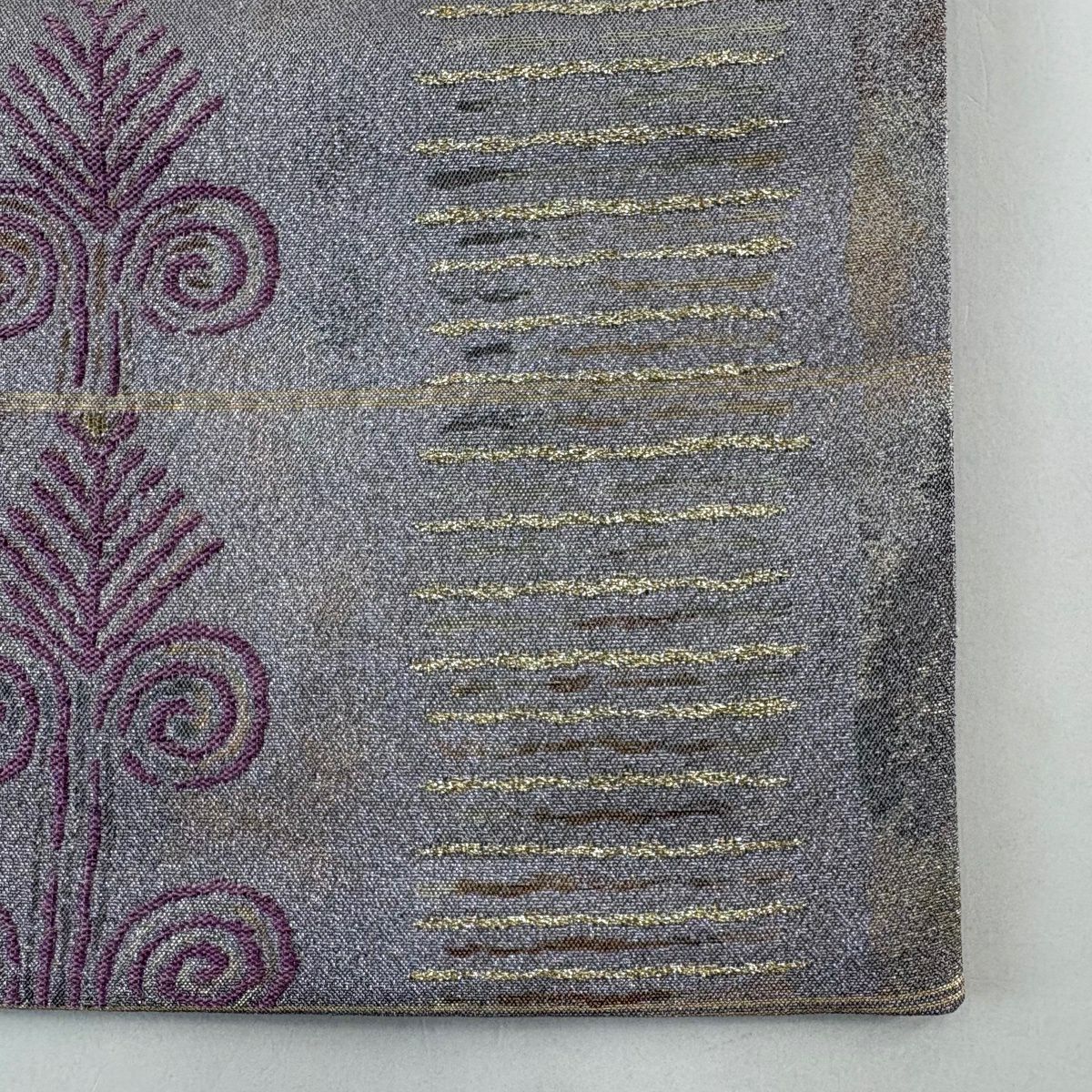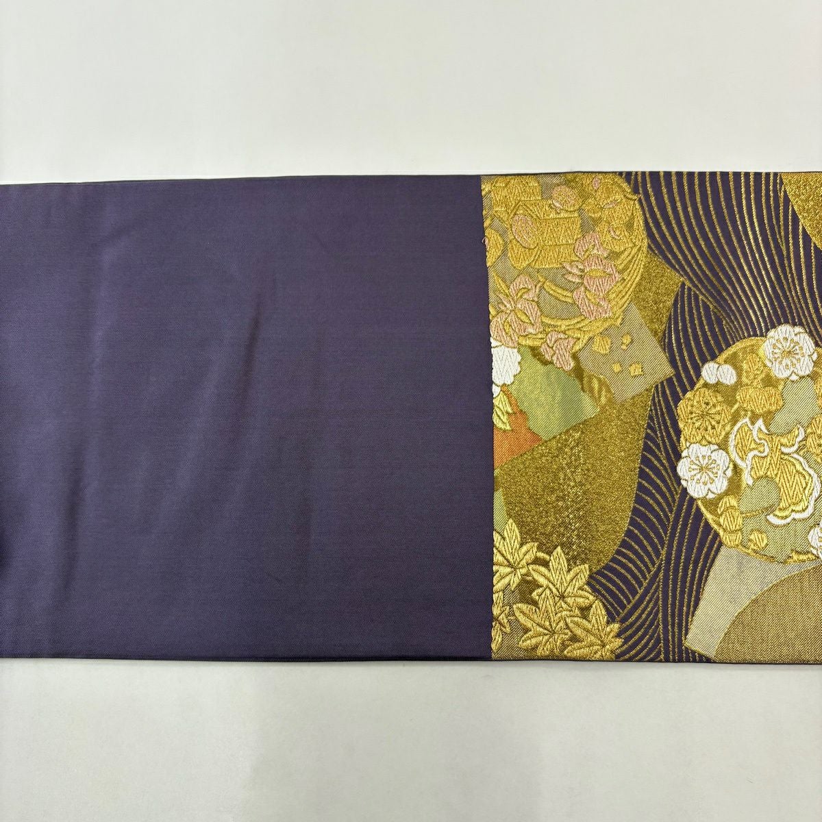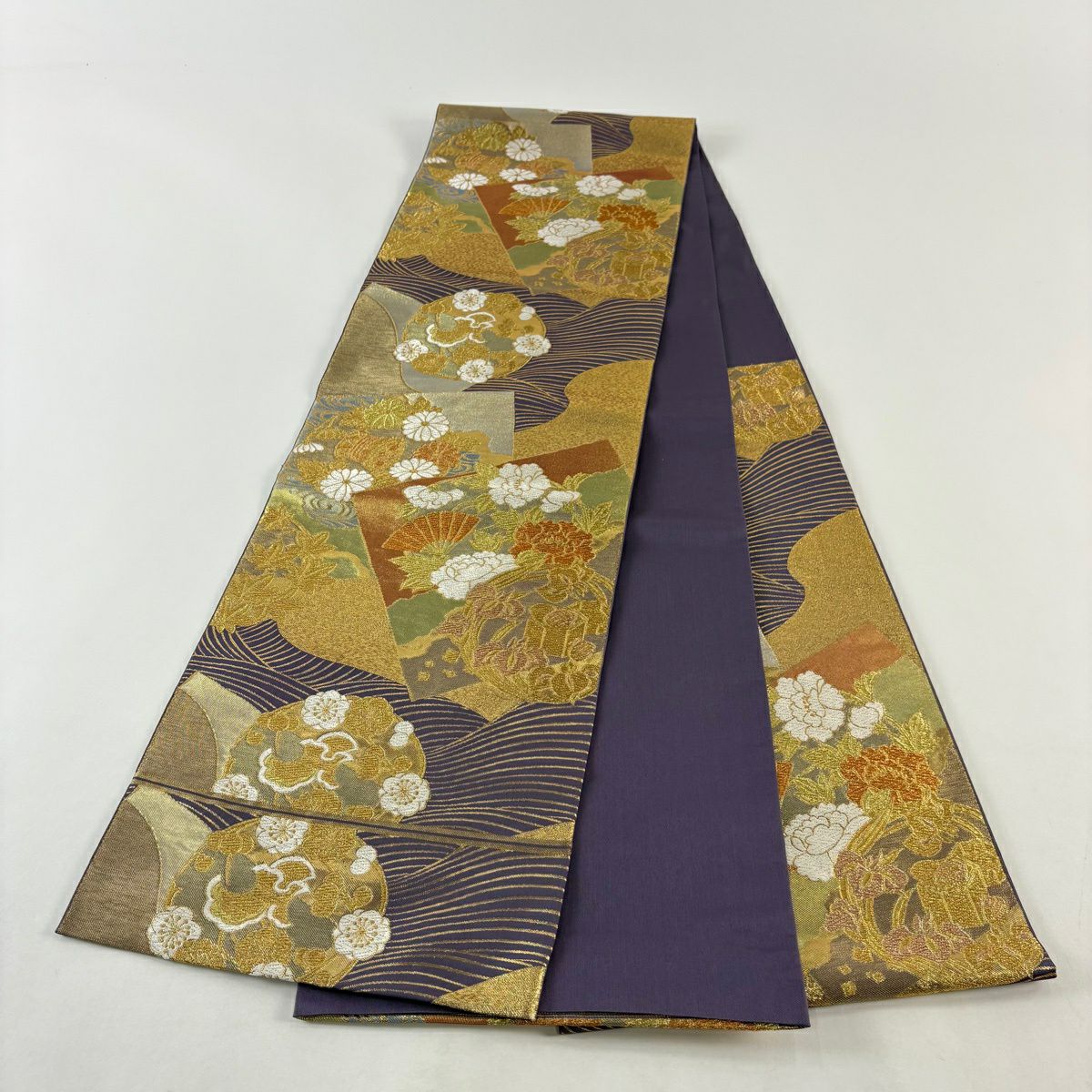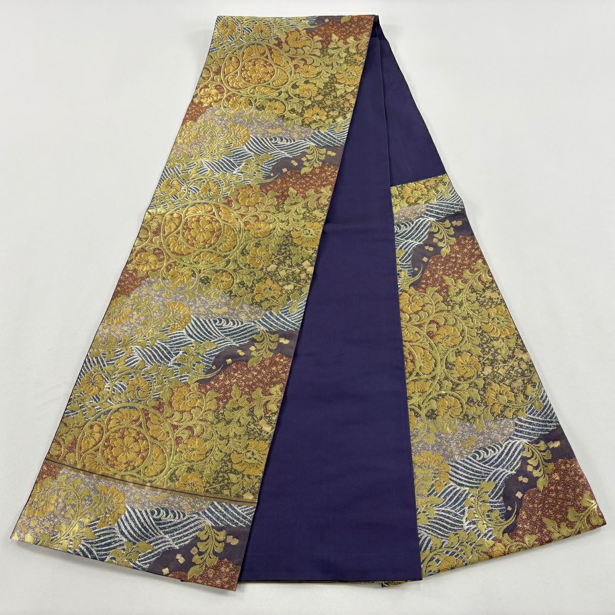 【在庫一掃】 袋帯 逸品 貝紫 流麗雲彩文 草花 流水 金糸 箔 金色 六通 正絹