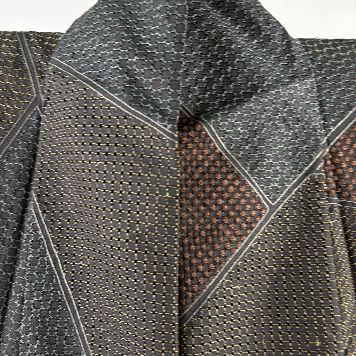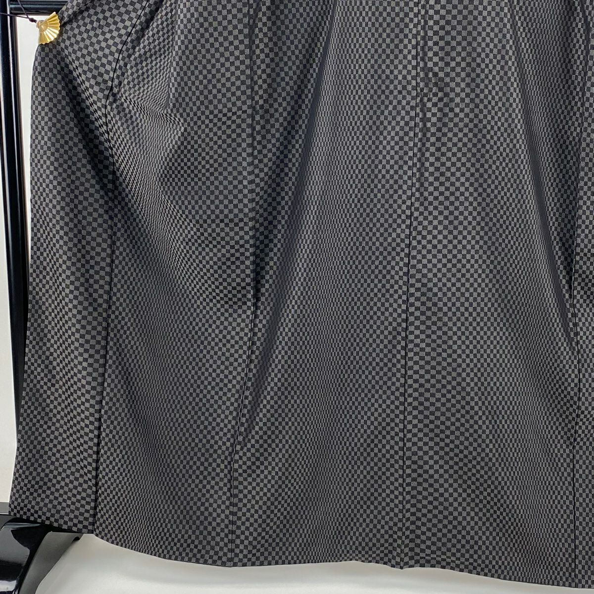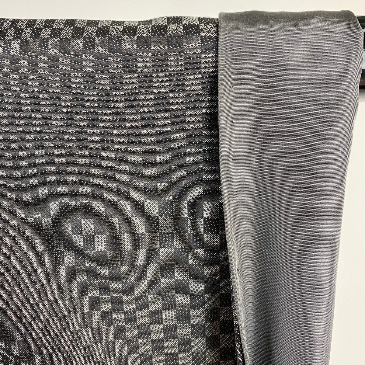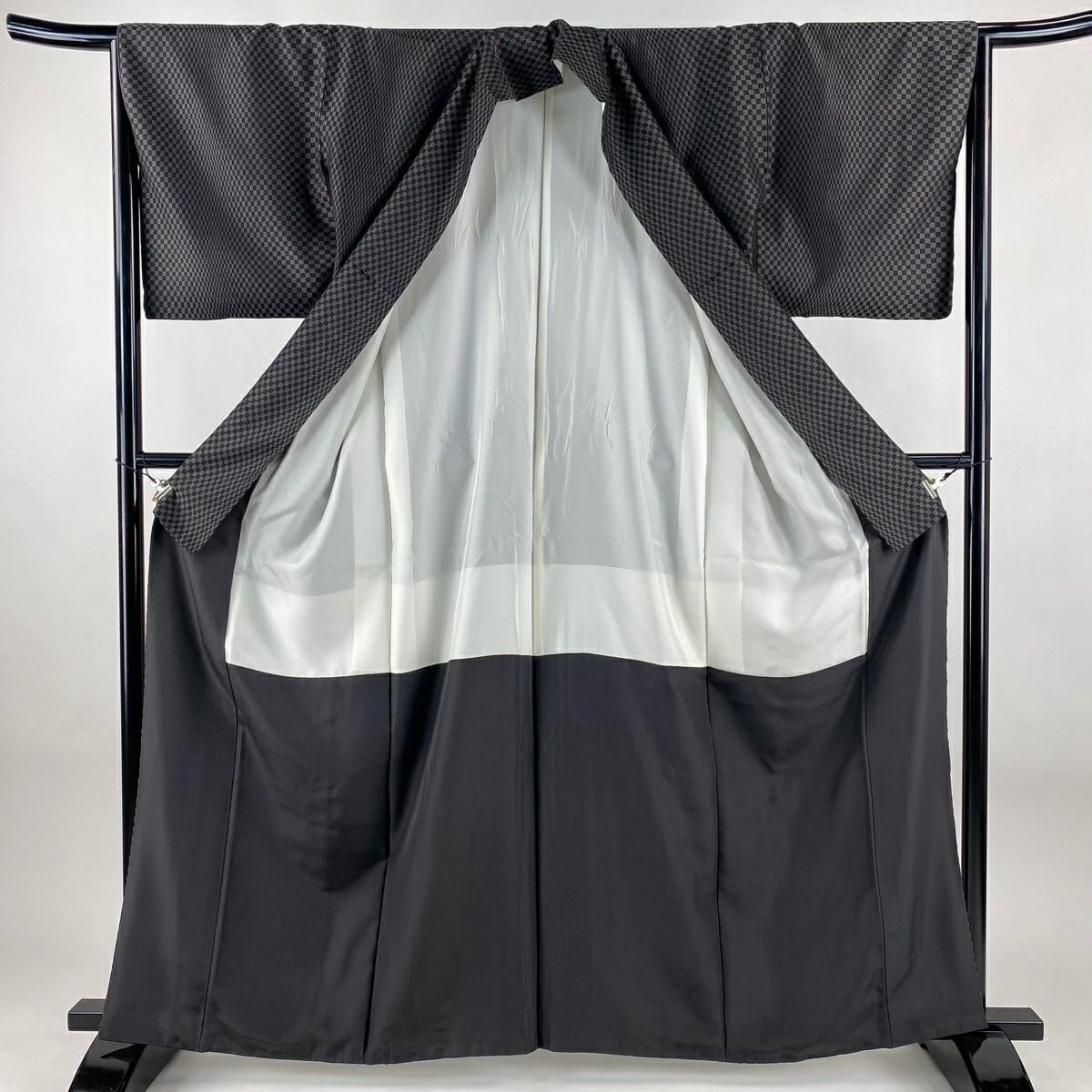 【在庫一掃】 お召 身丈163cm 裄丈65cm M 袷 市松 黒灰 正絹 逸品