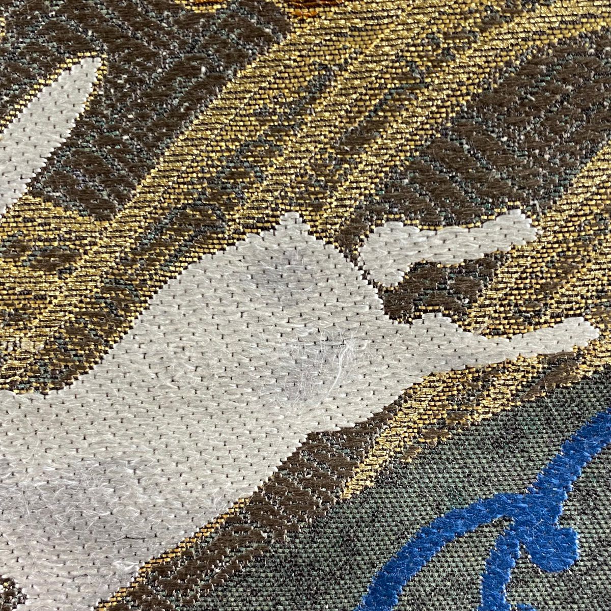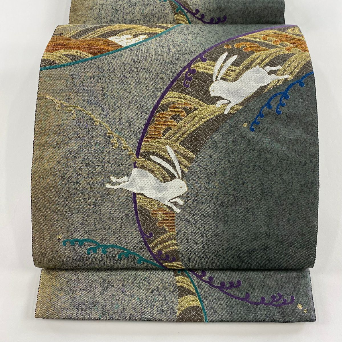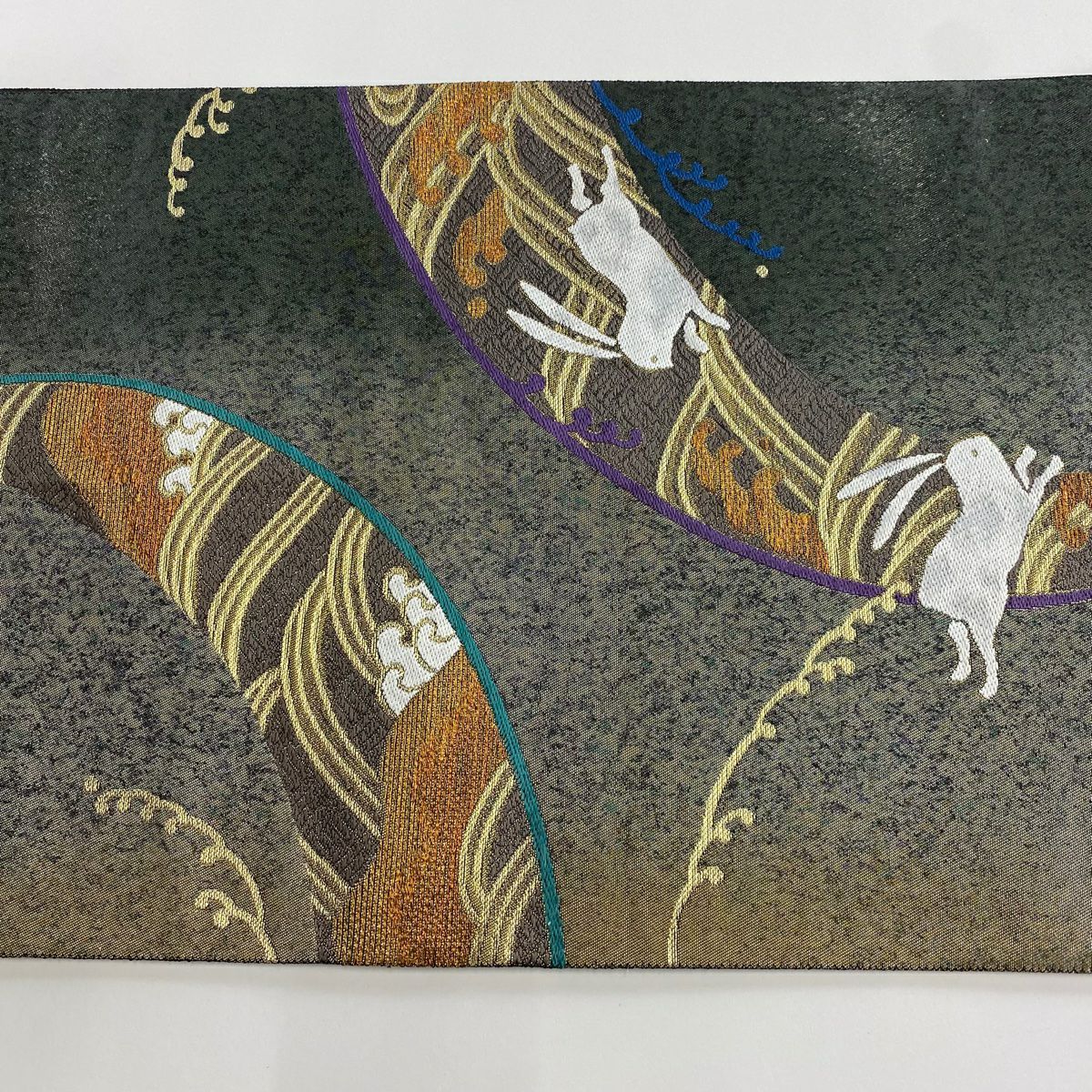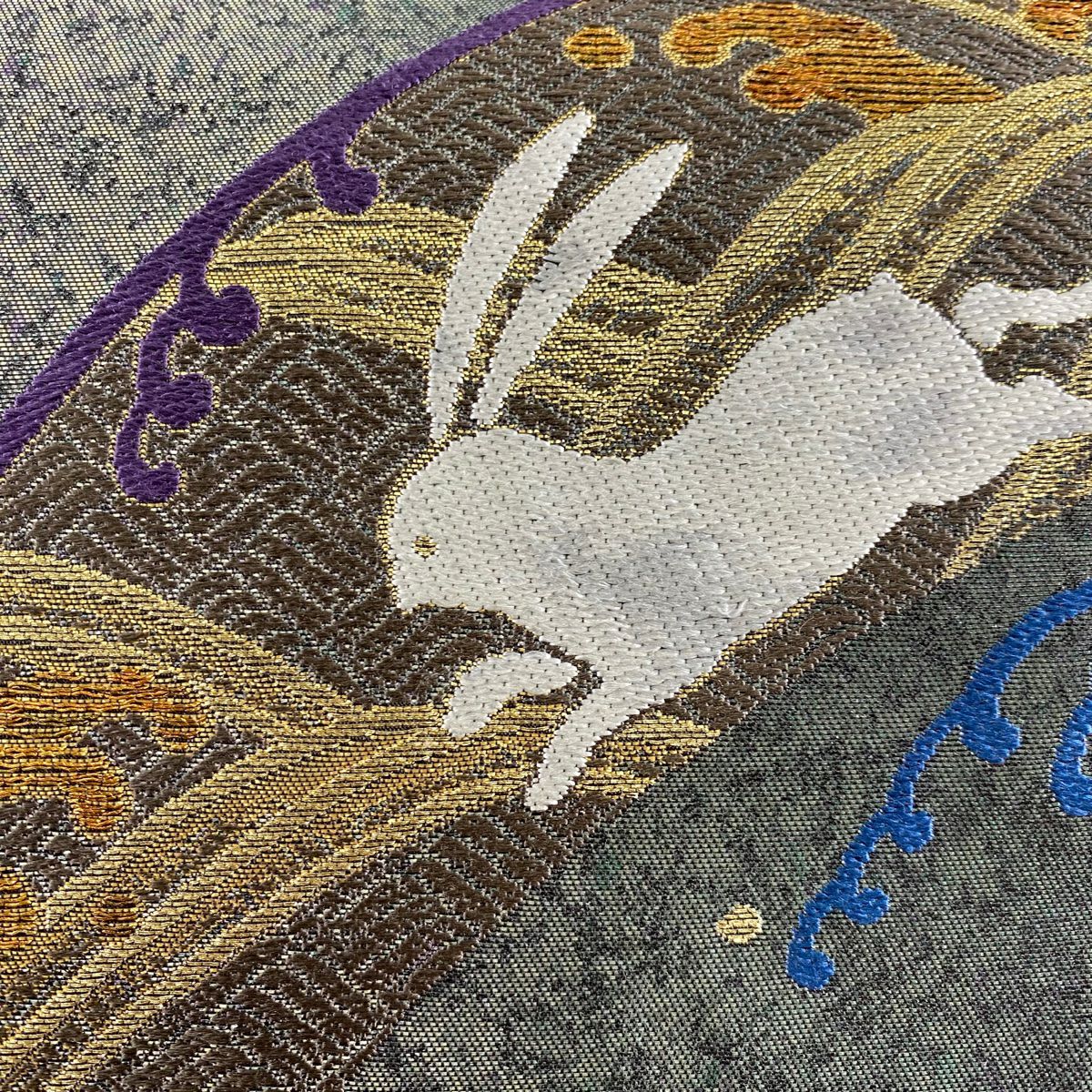 【在庫一掃】 袋帯 逸品 証紙あり ウサギ 波頭 金糸 箔 深緑 六通 正絹