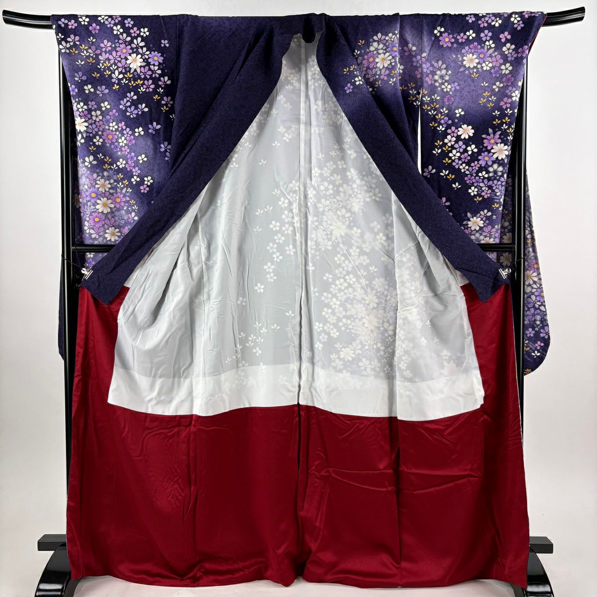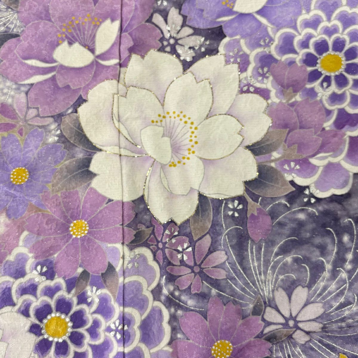 振袖 身丈169.5cm 裄丈71.5cm L 袷 草花 銀通し 箔 濃紫 正絹 逸品