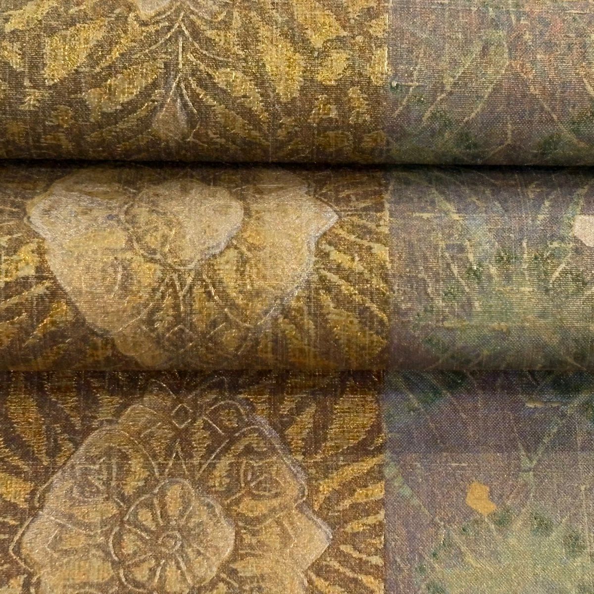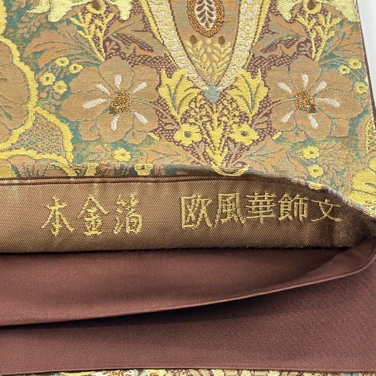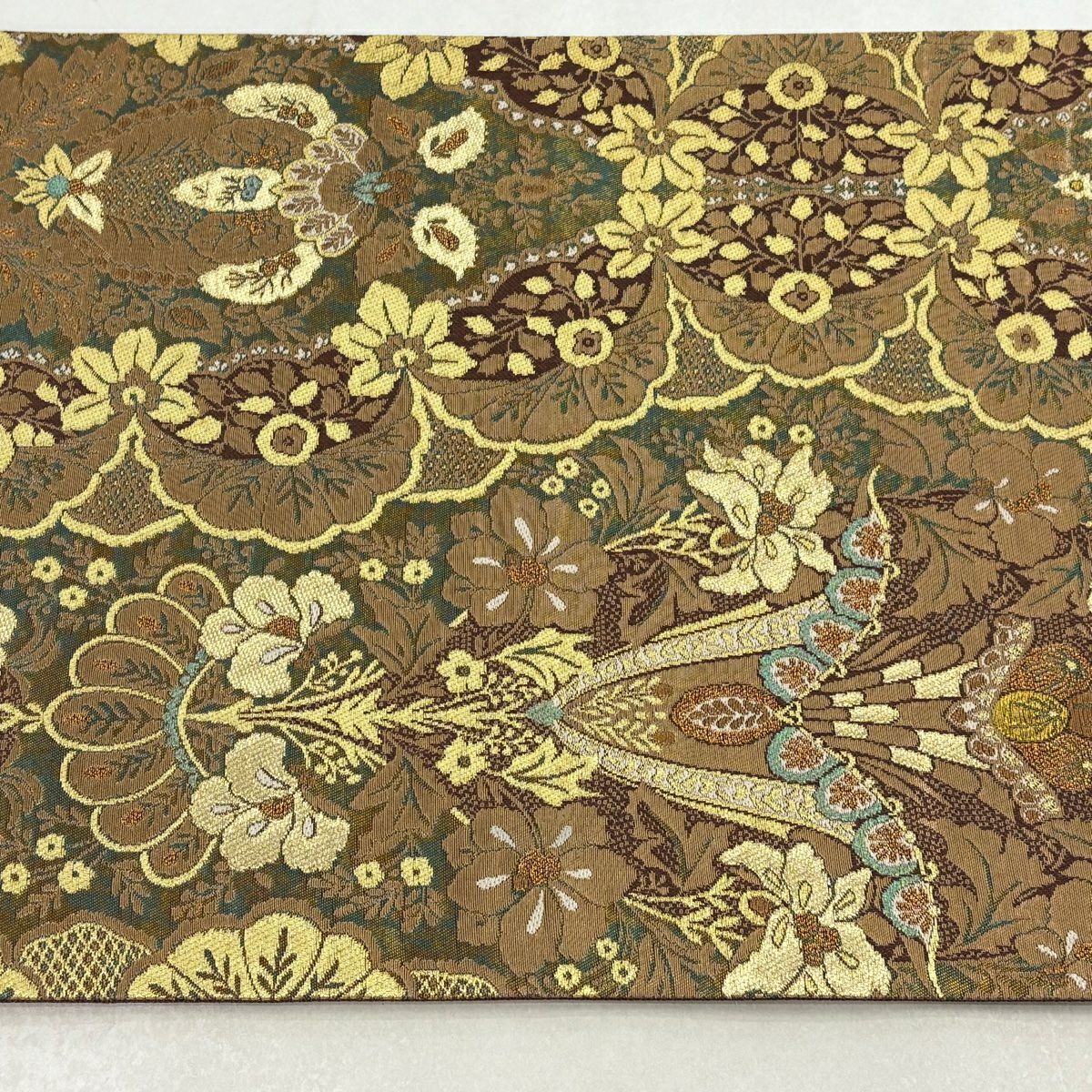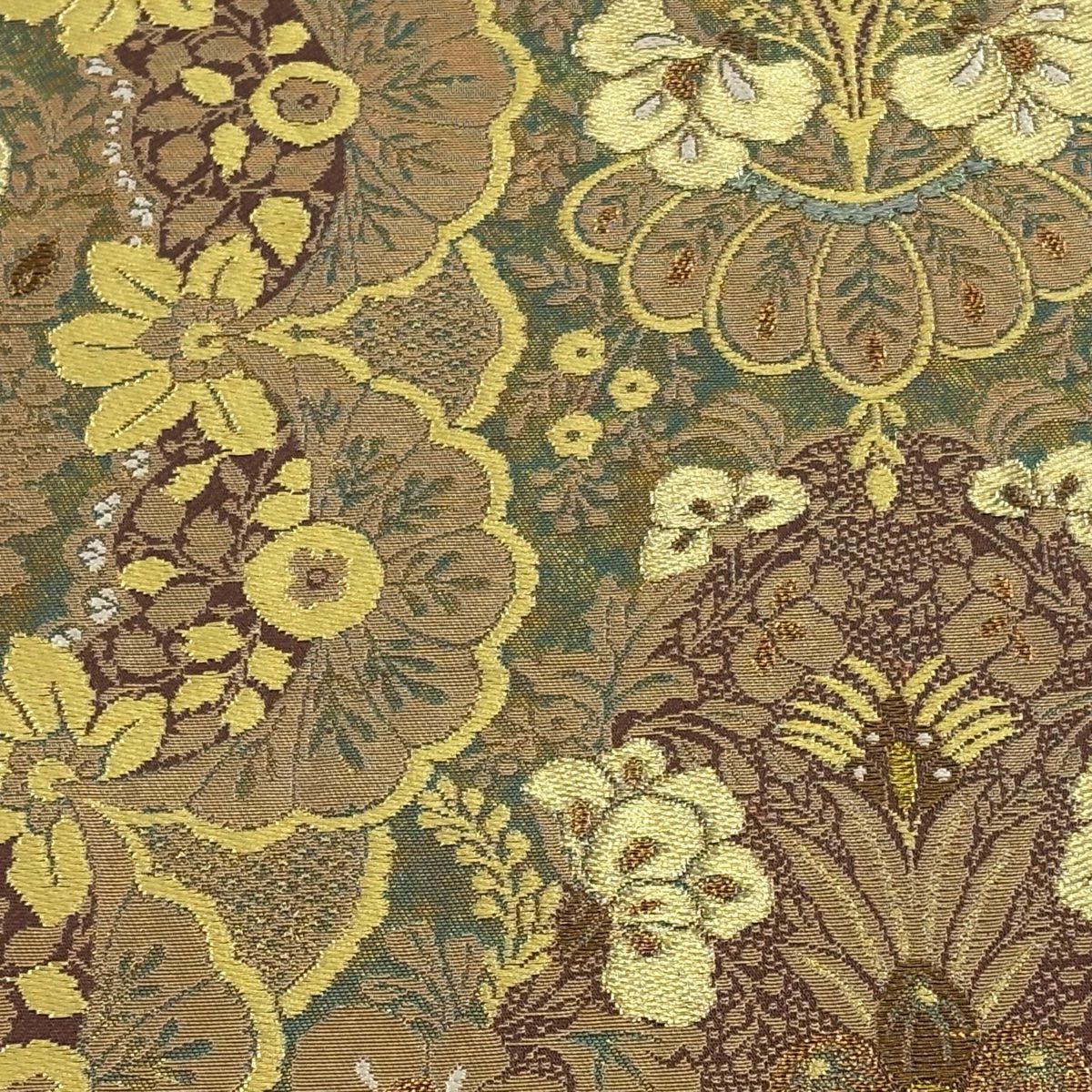 【美品】 袋帯 逸品 落款あり 牛首紬地 草花 幾何学 金銀彩 茶緑色 全通 正絹