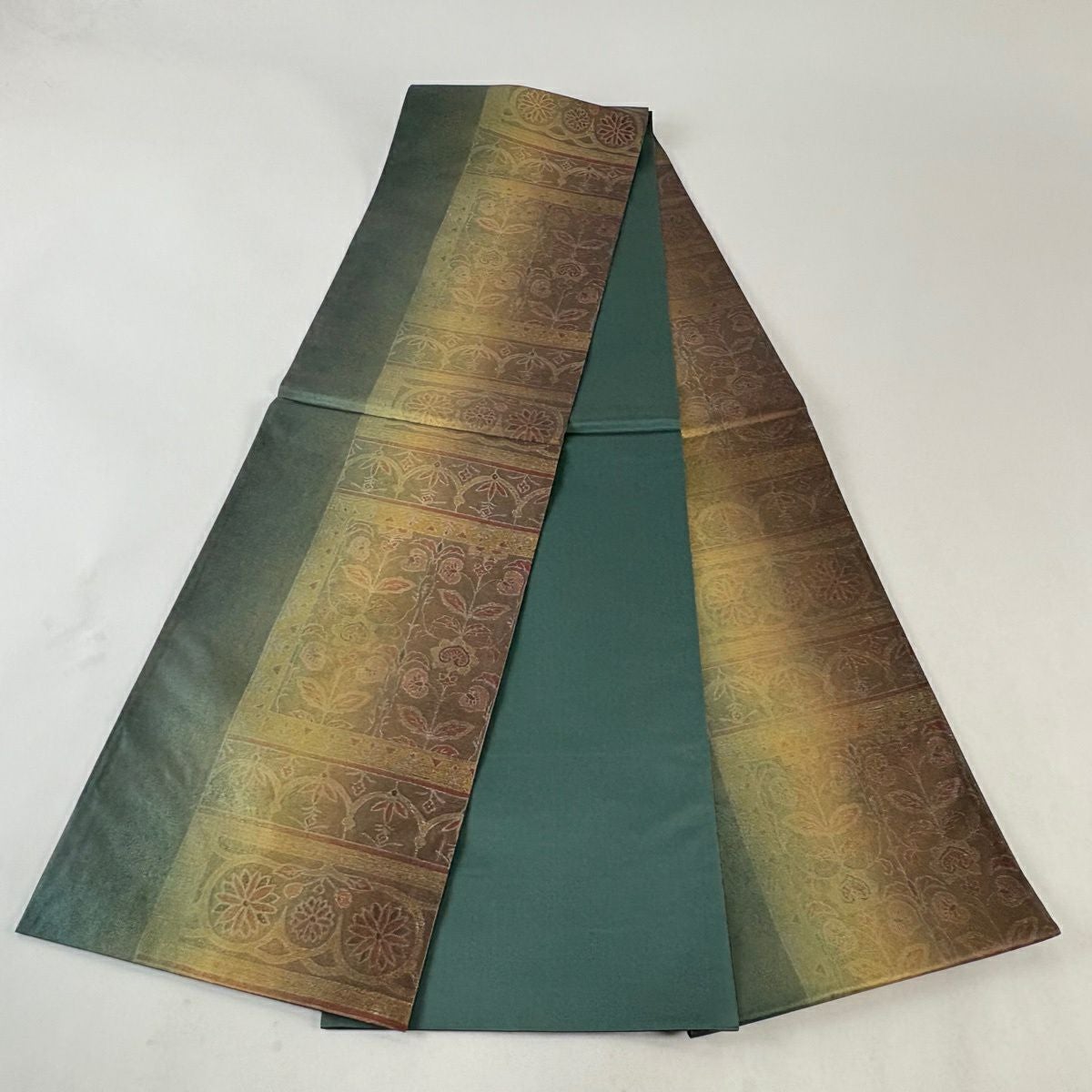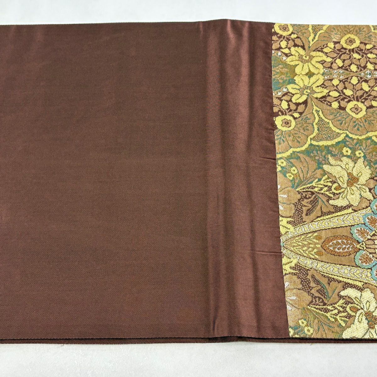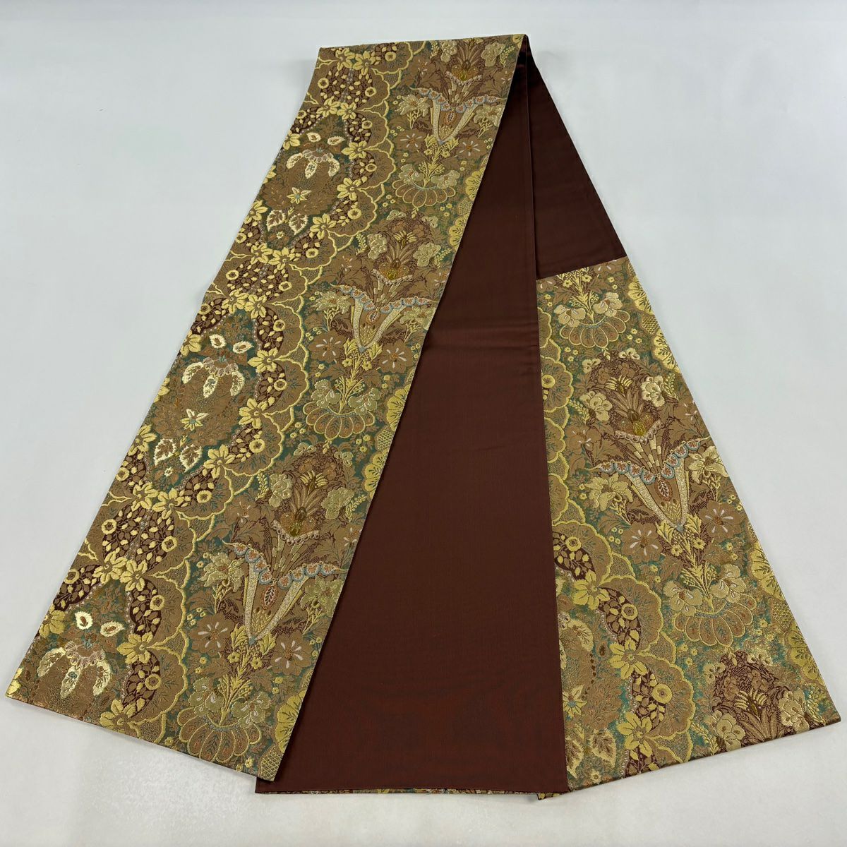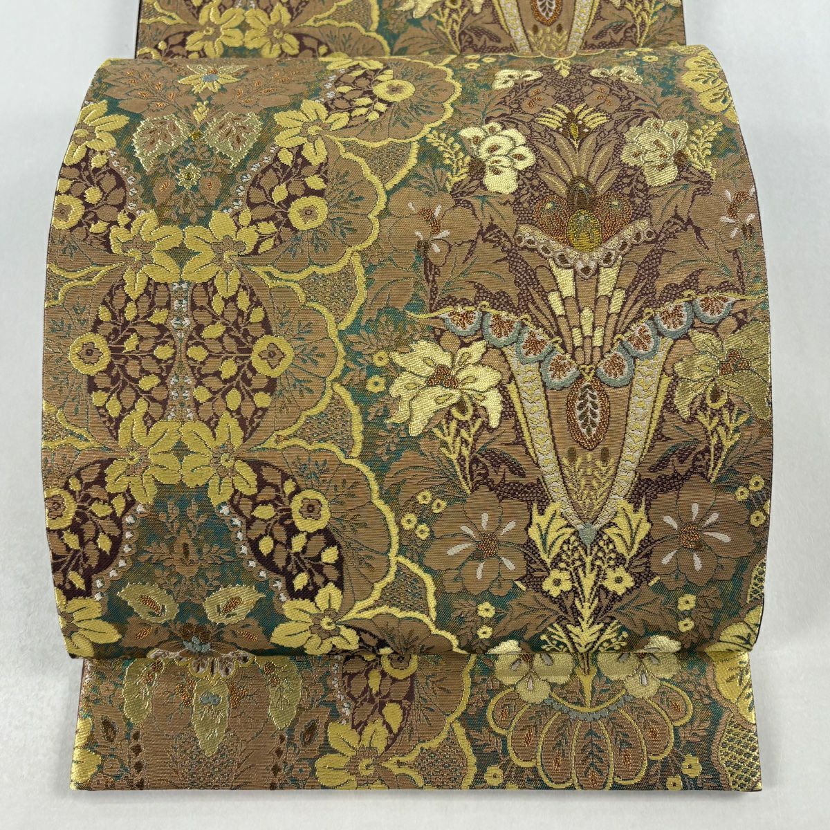 【美品】 袋帯 逸品 落款あり 牛首紬地 草花 幾何学 金銀彩 茶緑色 全通 正絹