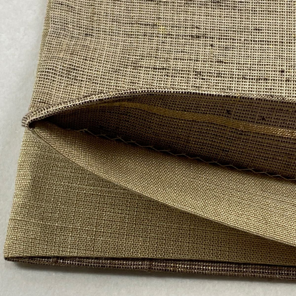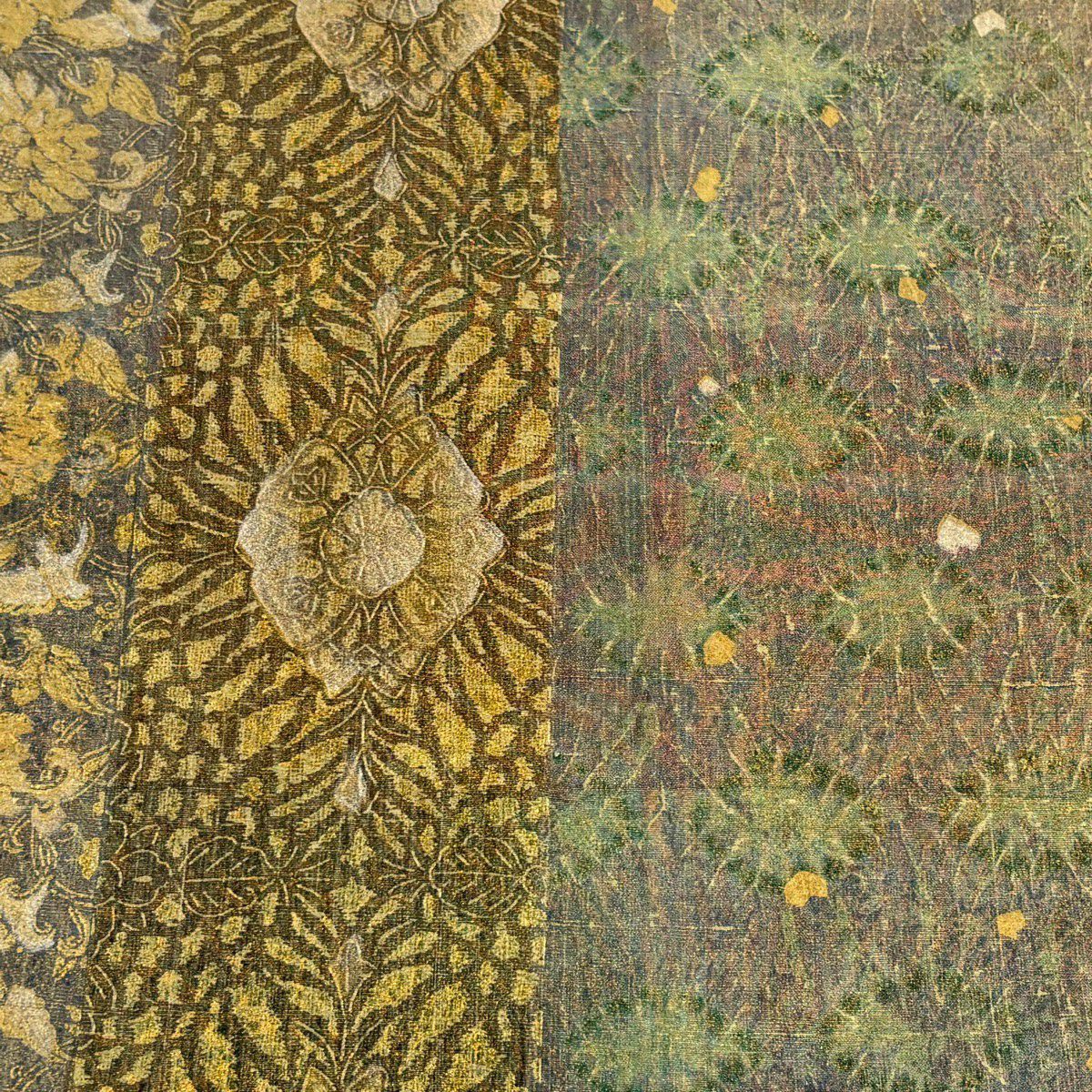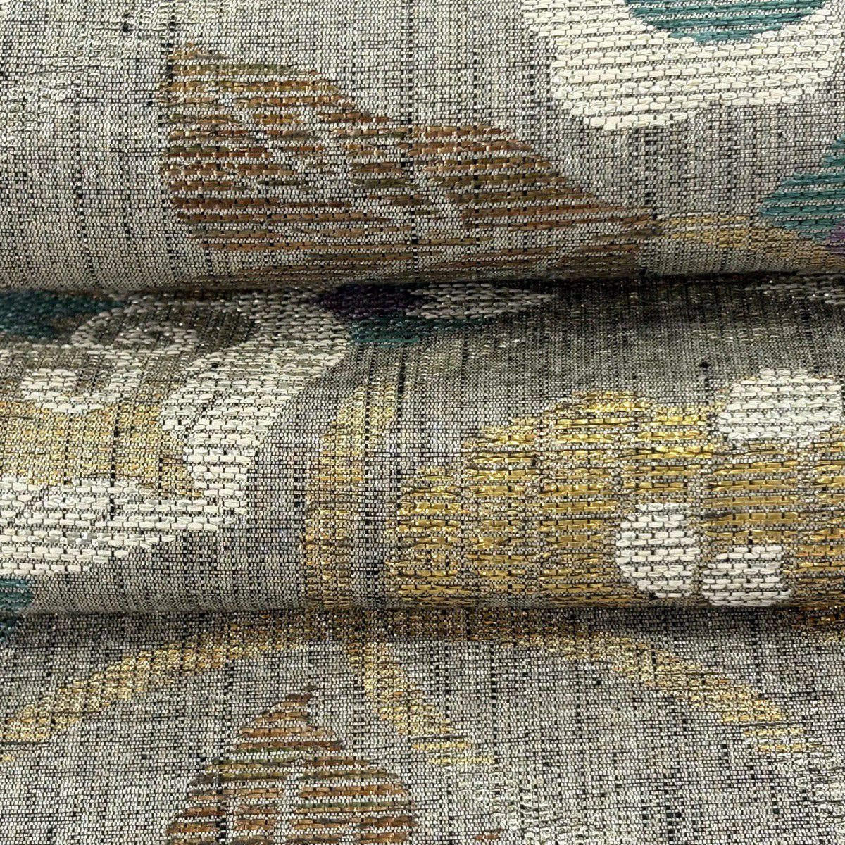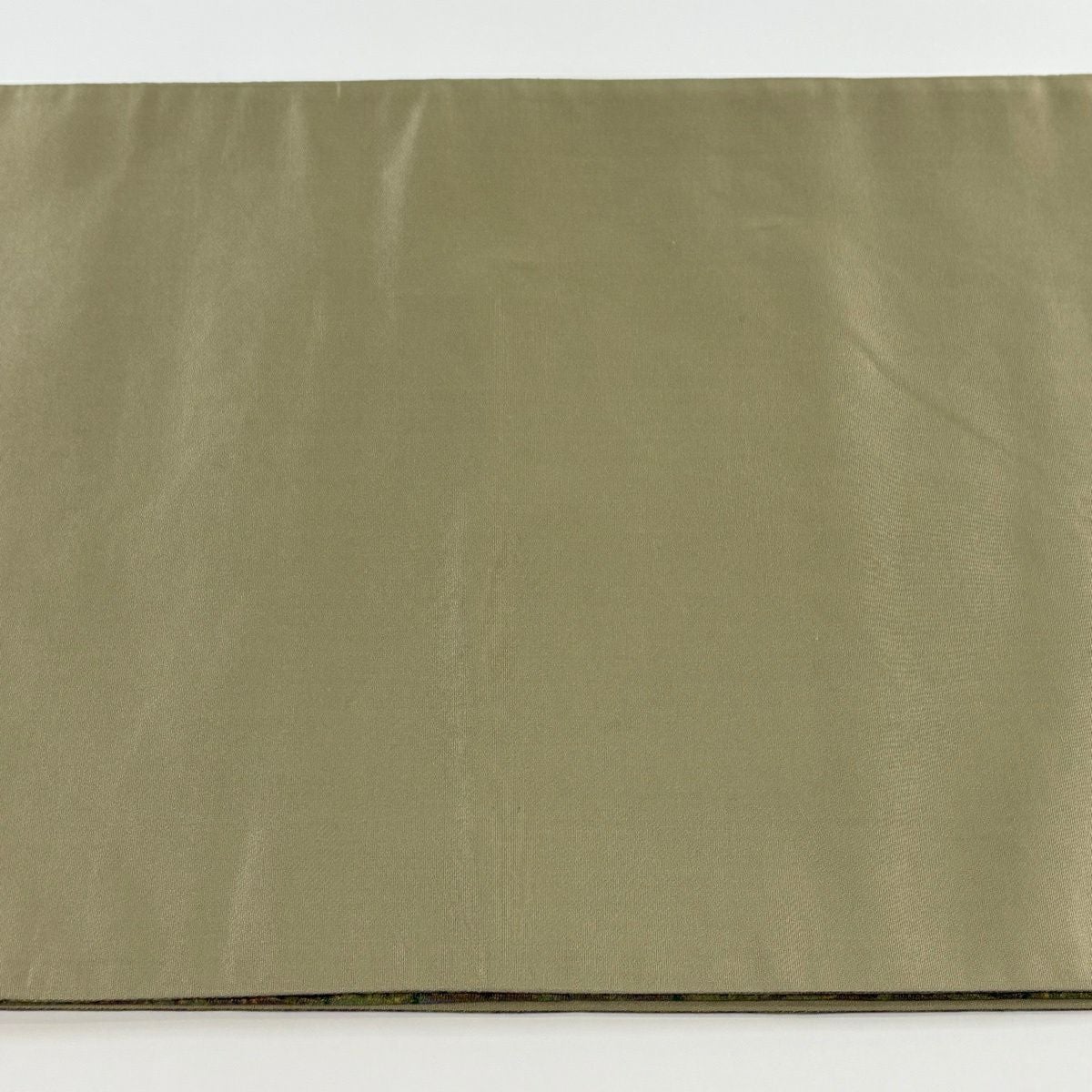 【美品】 袋帯 逸品 落款あり 牛首紬地 草花 幾何学 金銀彩 茶緑色 全通 正絹