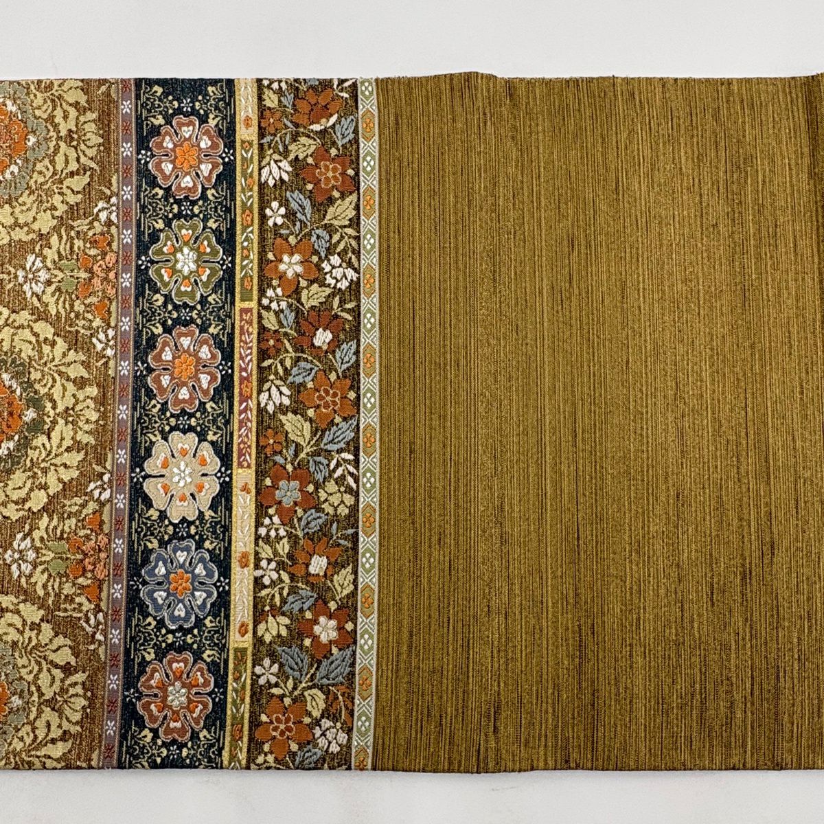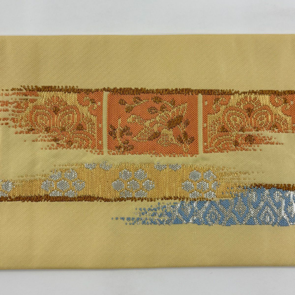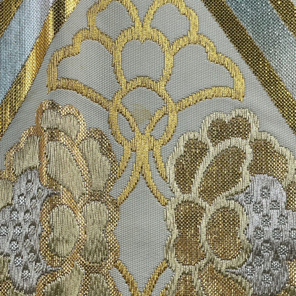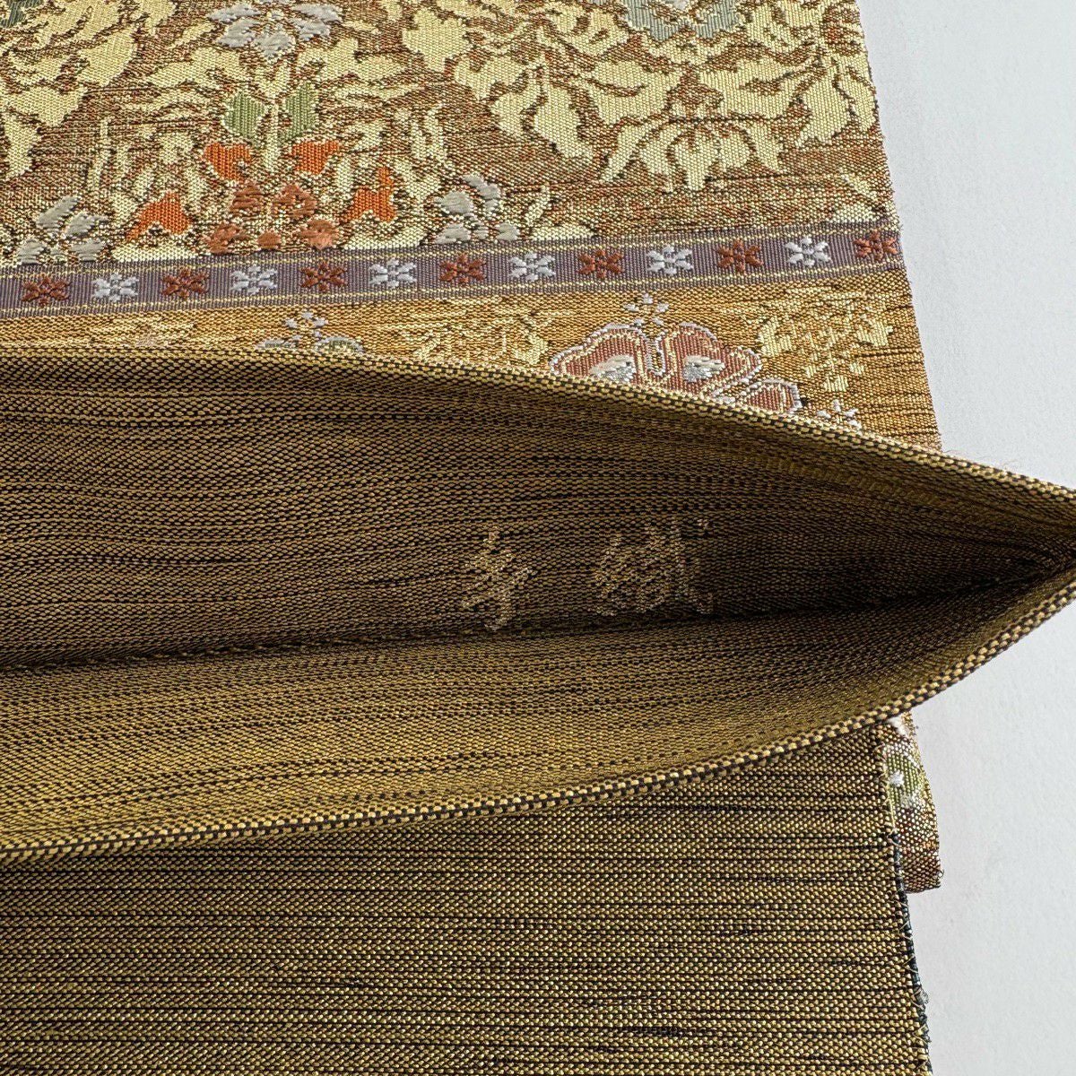 【美品】 袋帯 逸品 河村織物 落款あり 段縞 草花 銀糸 箔 黄土色 六通 正絹