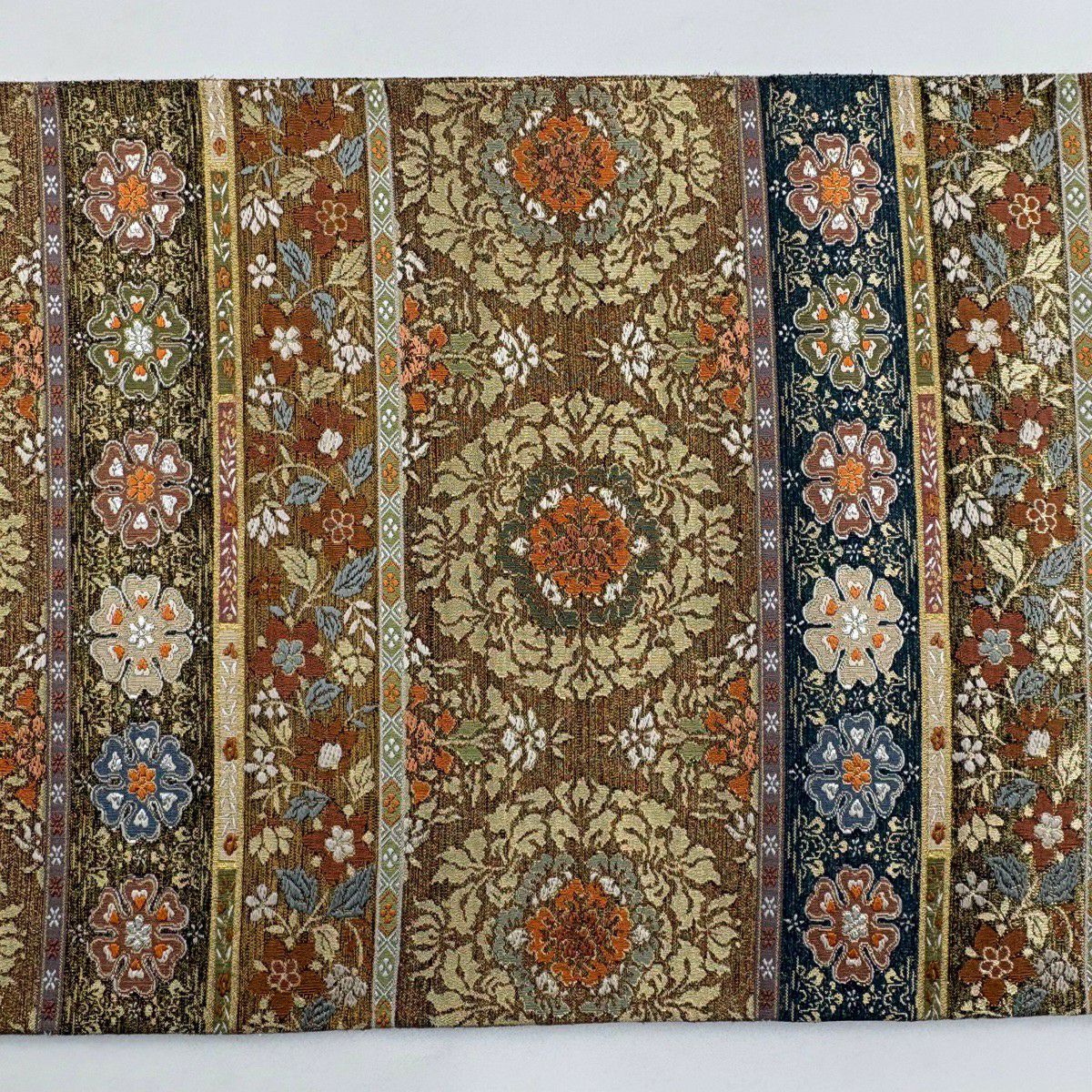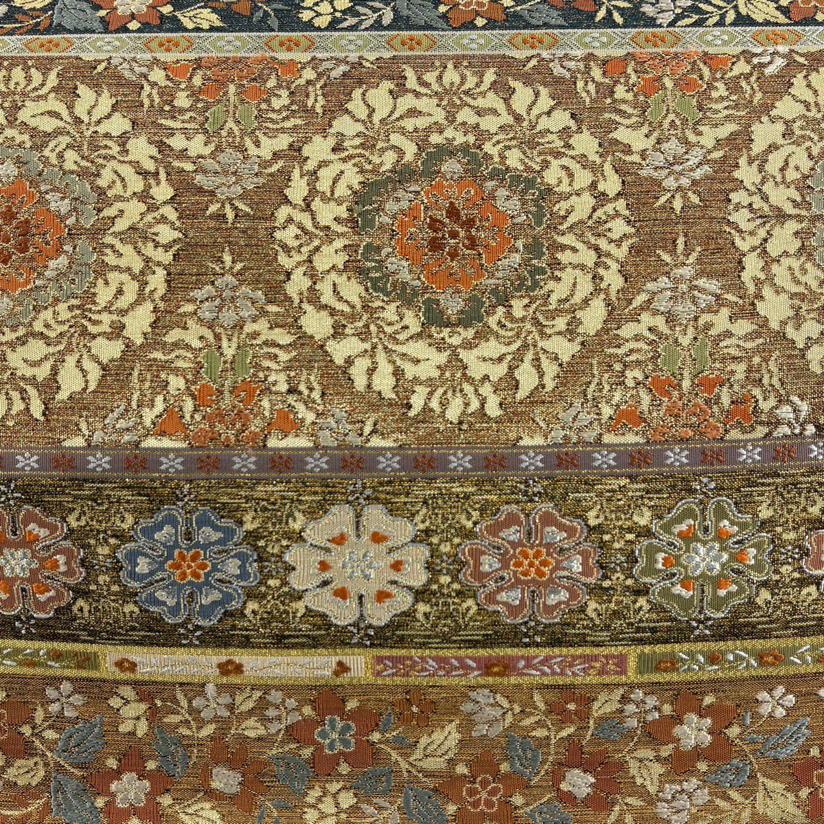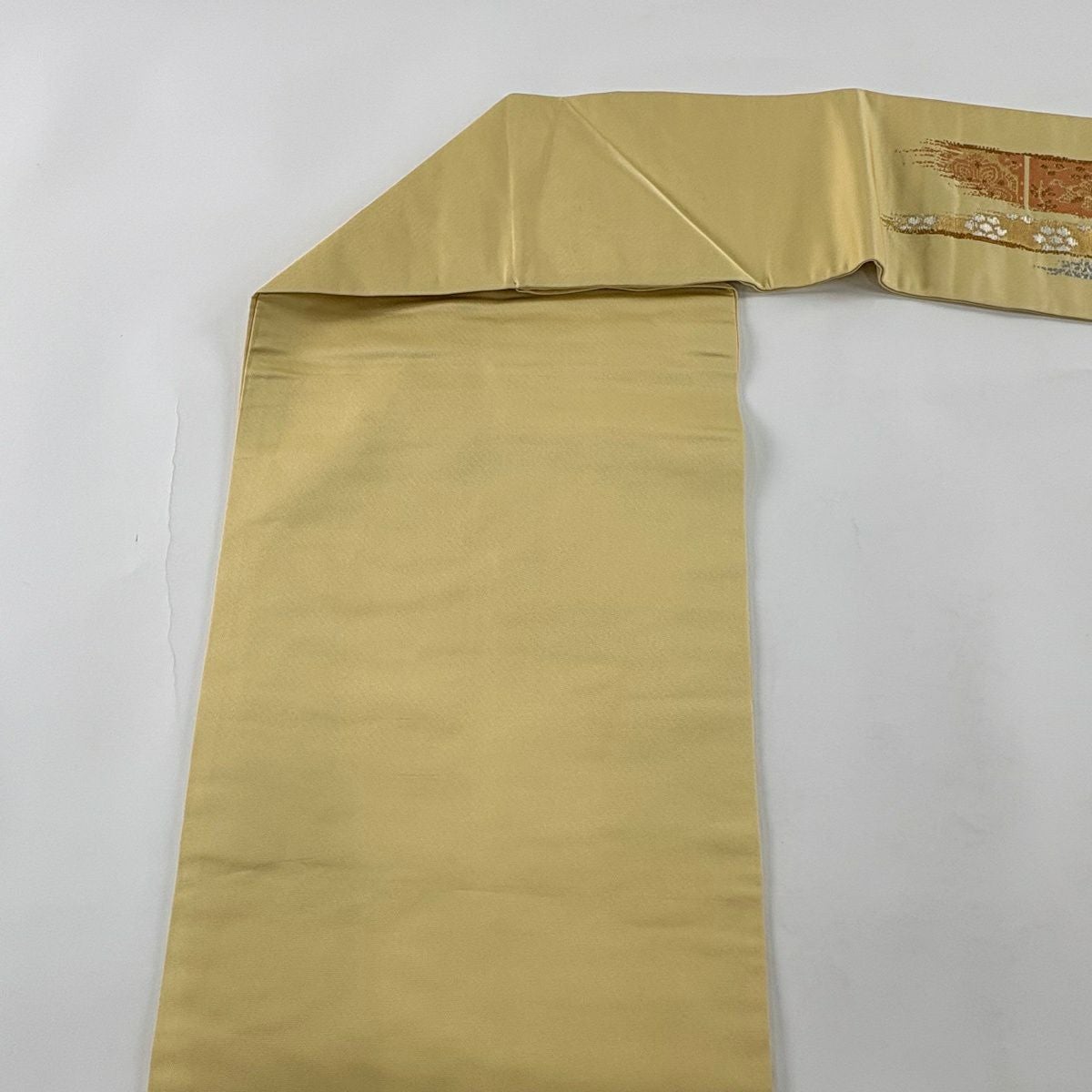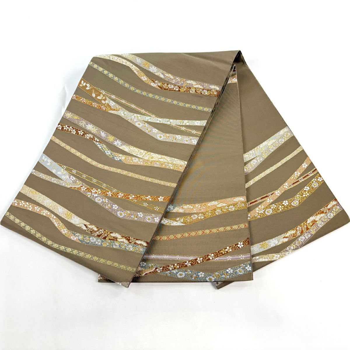 【美品】 袋帯 逸品 河村織物 落款あり 段縞 草花 銀糸 箔 黄土色 六通 正絹