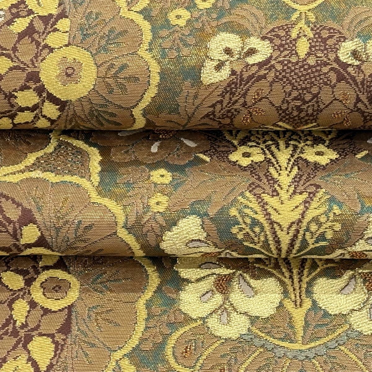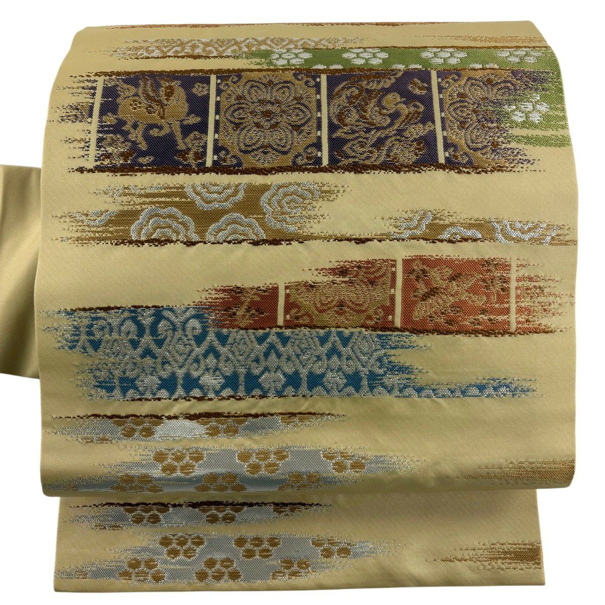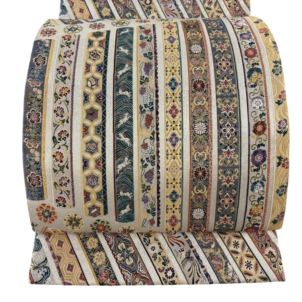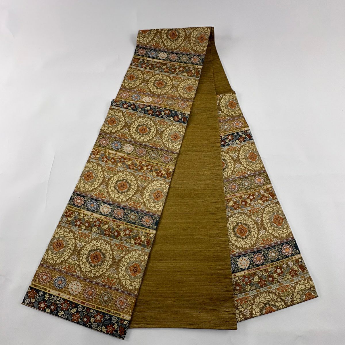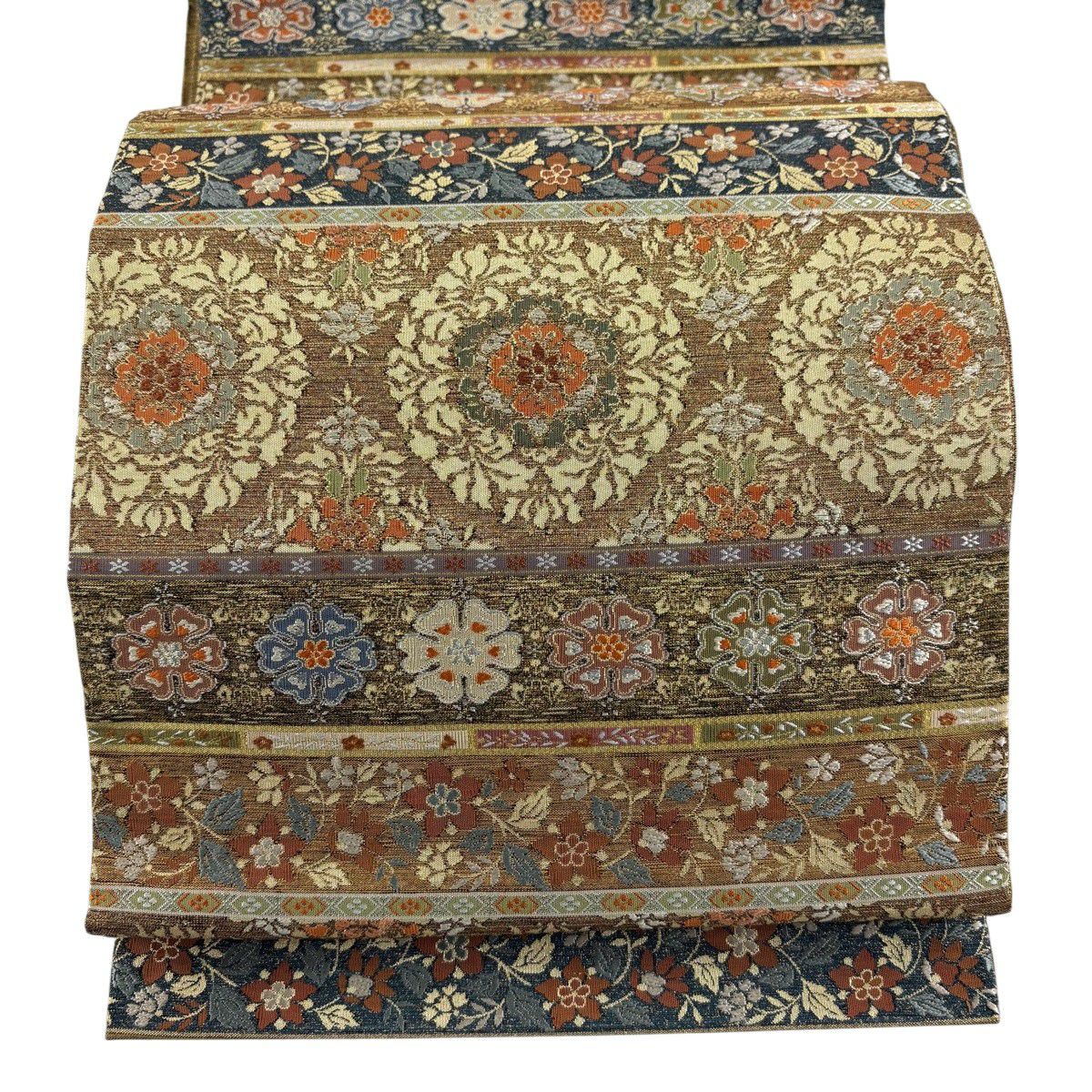 【美品】 袋帯 逸品 河村織物 落款あり 段縞 草花 銀糸 箔 黄土色 六通 正絹