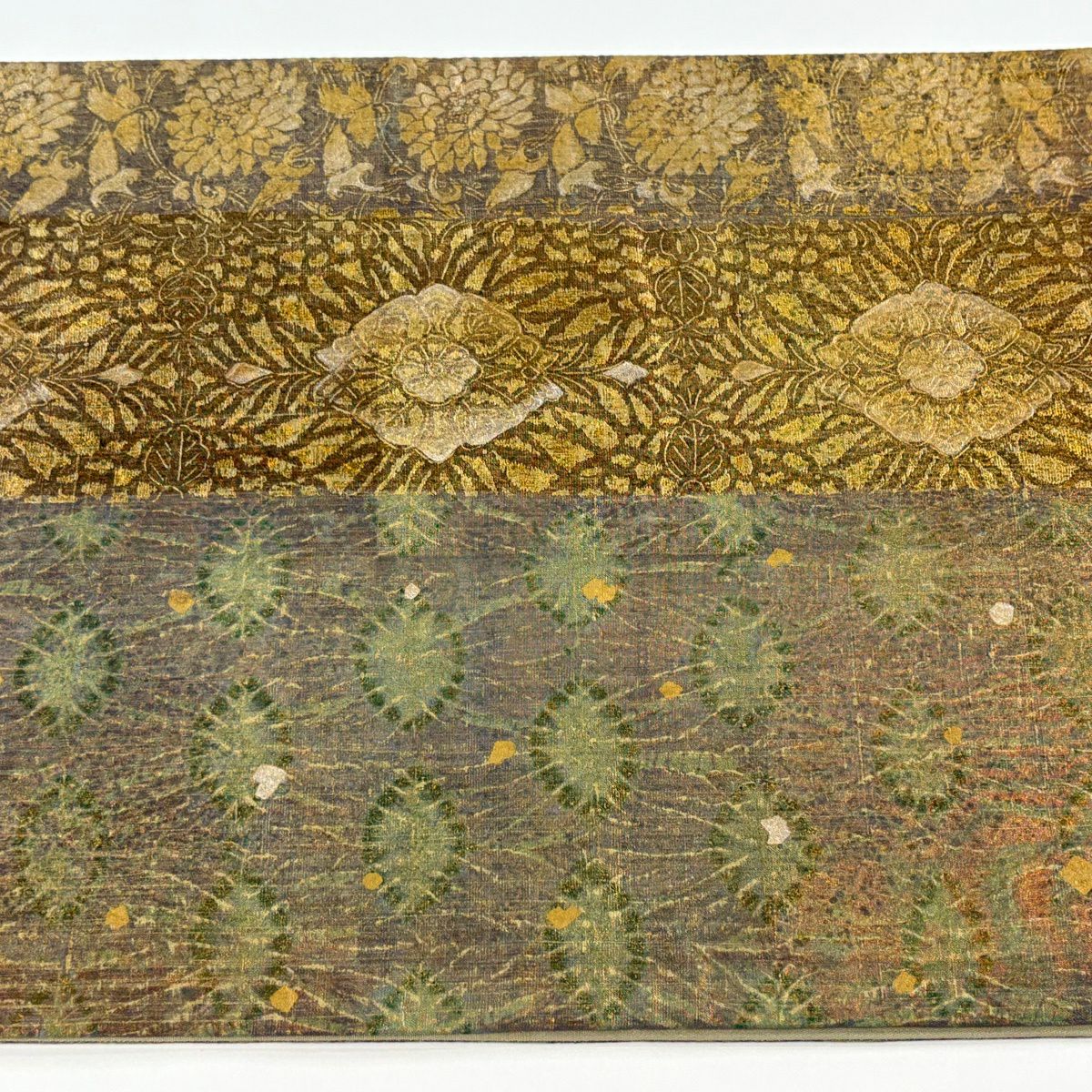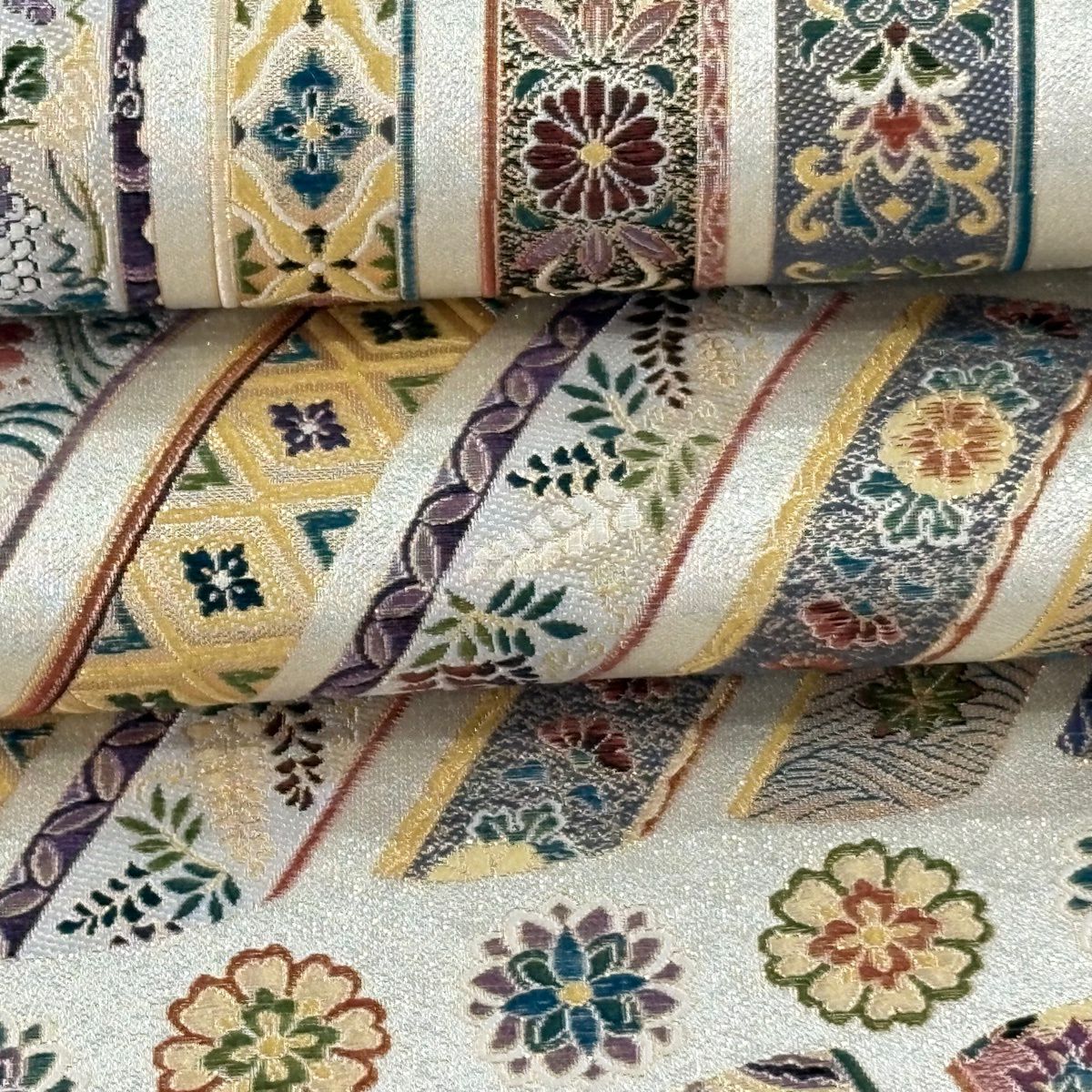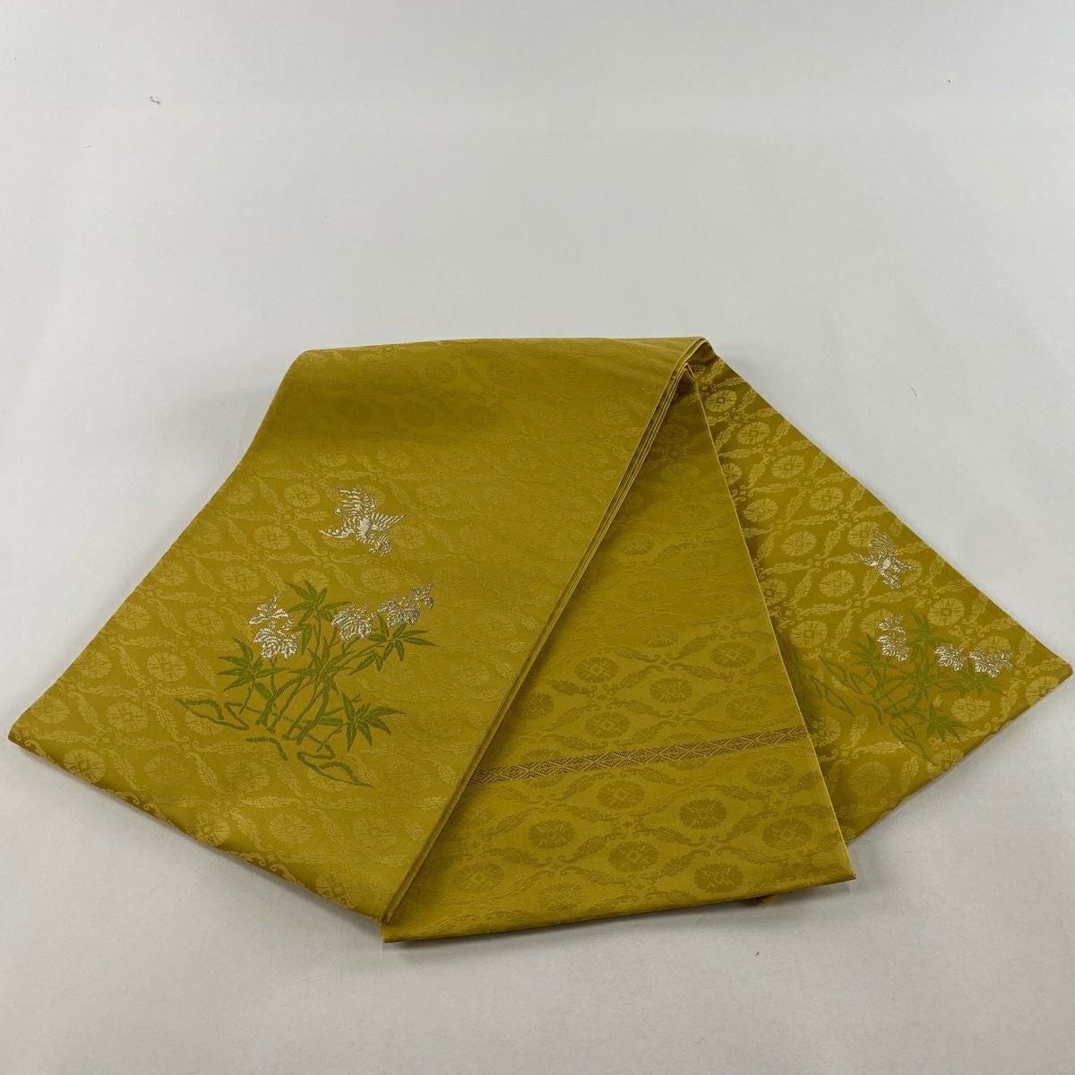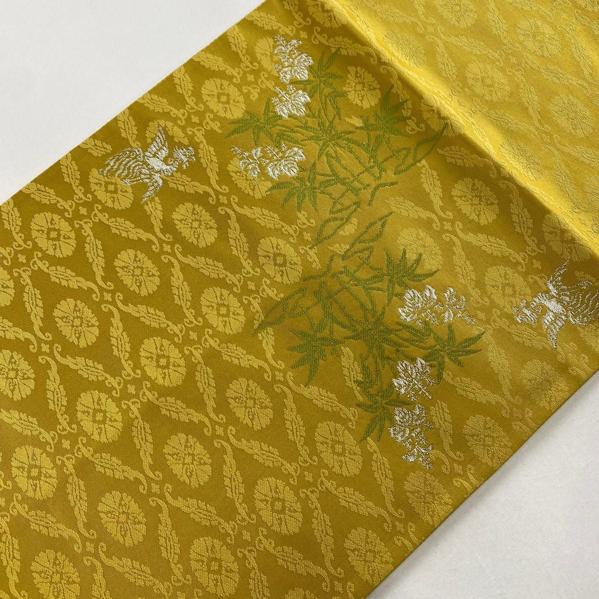【美品】 袋帯 逸品 河村織物 落款あり 段縞 草花 銀糸 箔 黄土色 六通 正絹