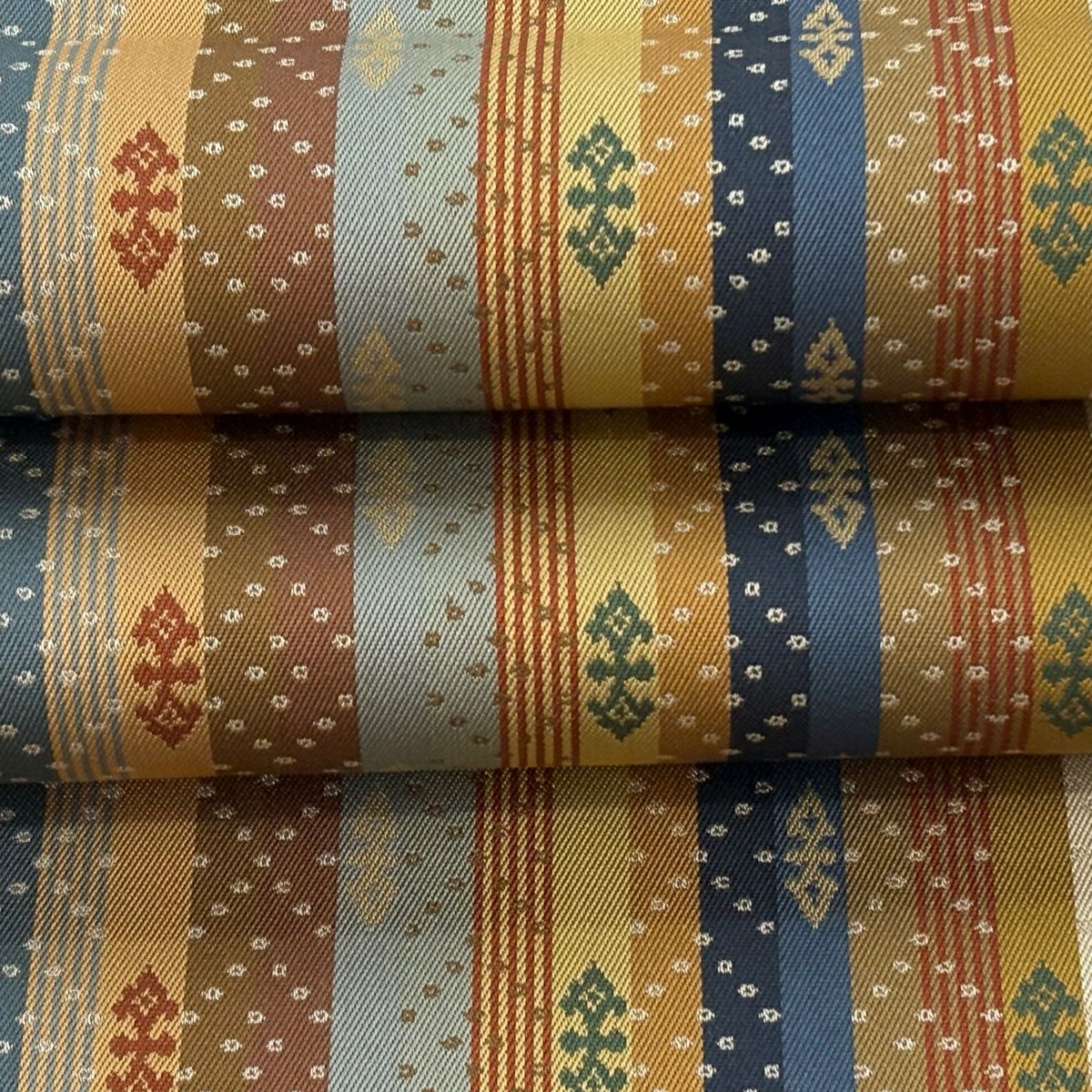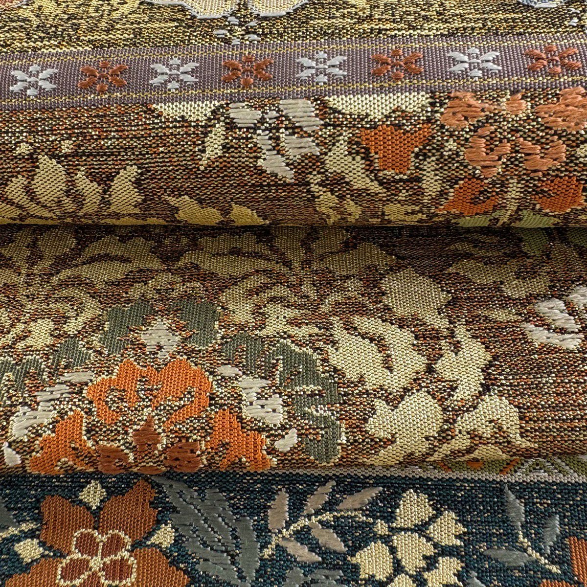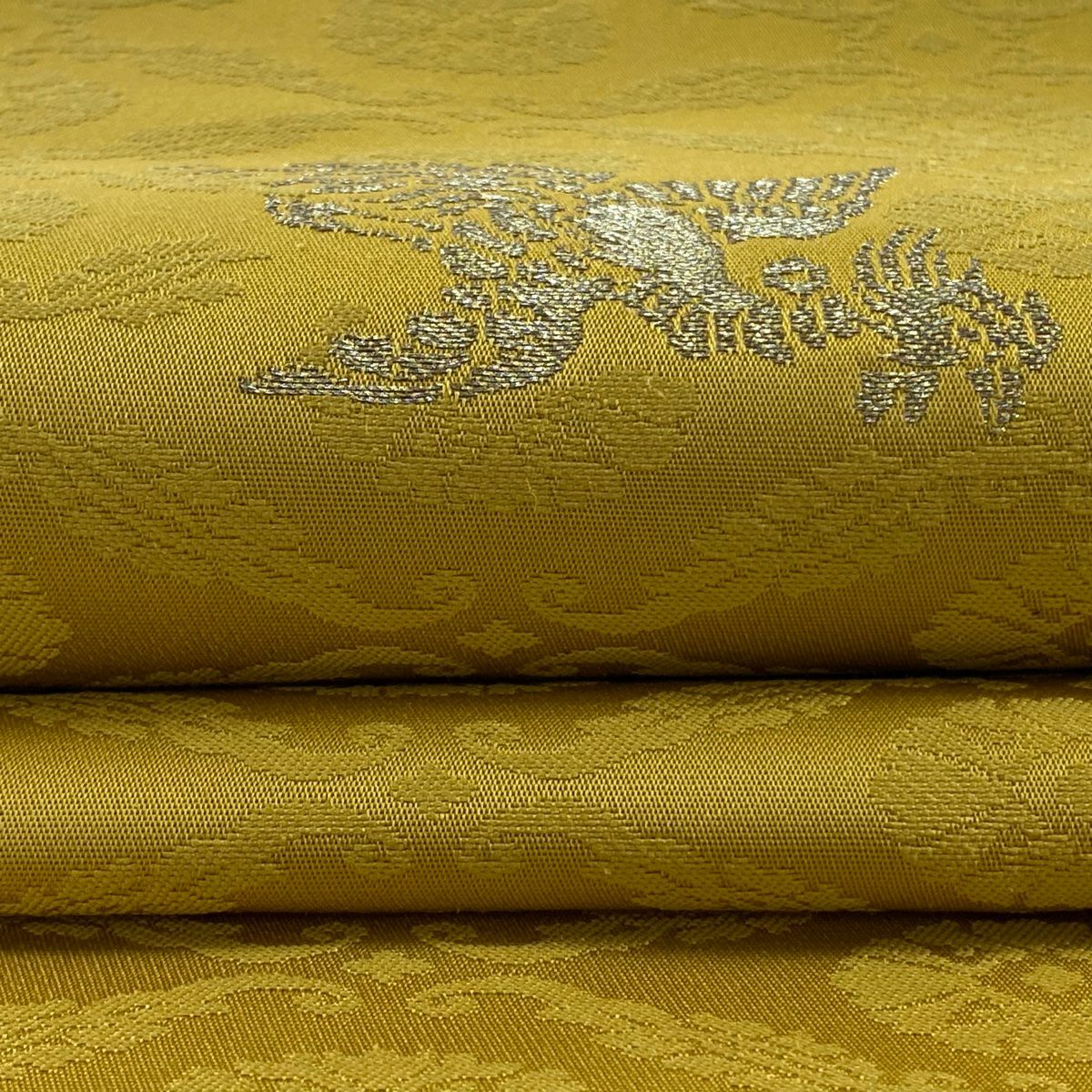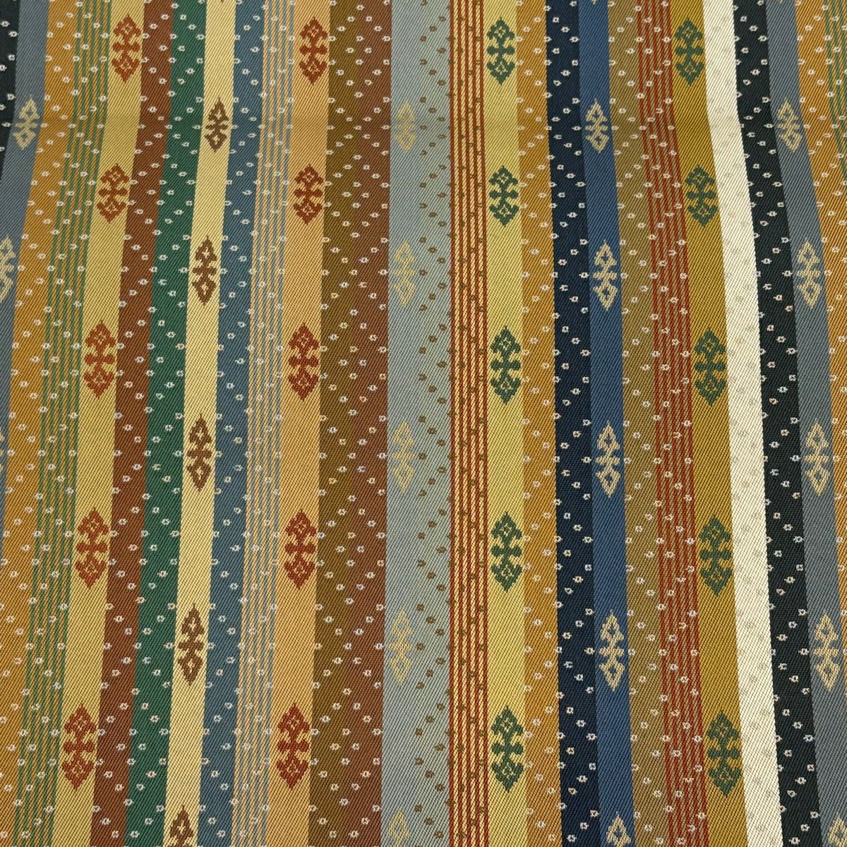 【美品】 袋帯 逸品 河村織物 落款あり 段縞 草花 銀糸 箔 黄土色 六通 正絹