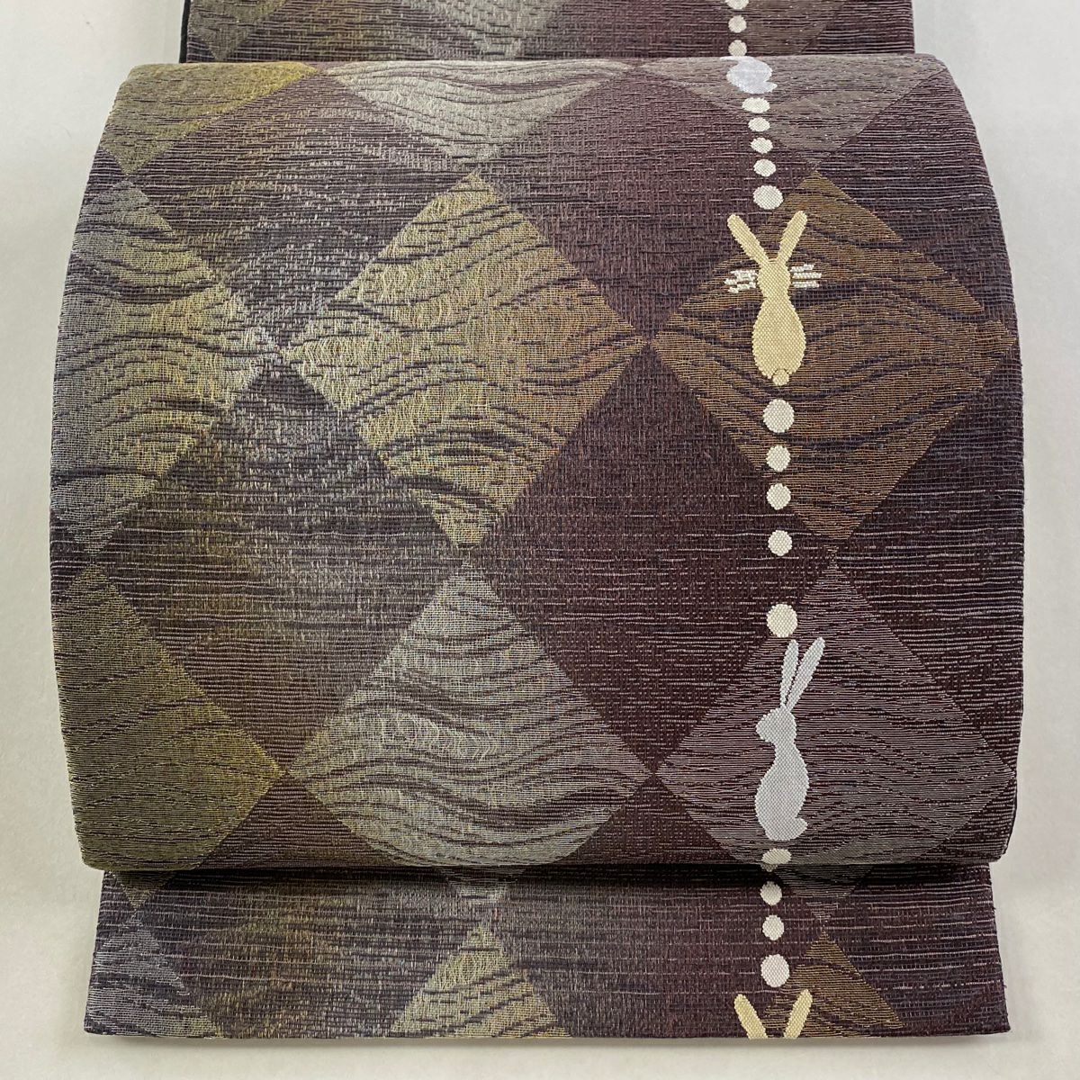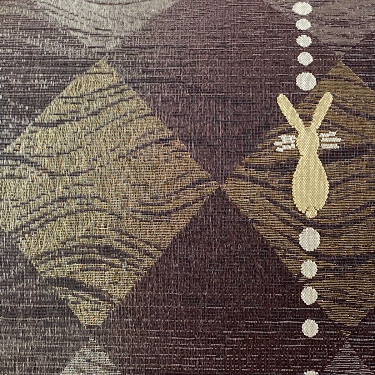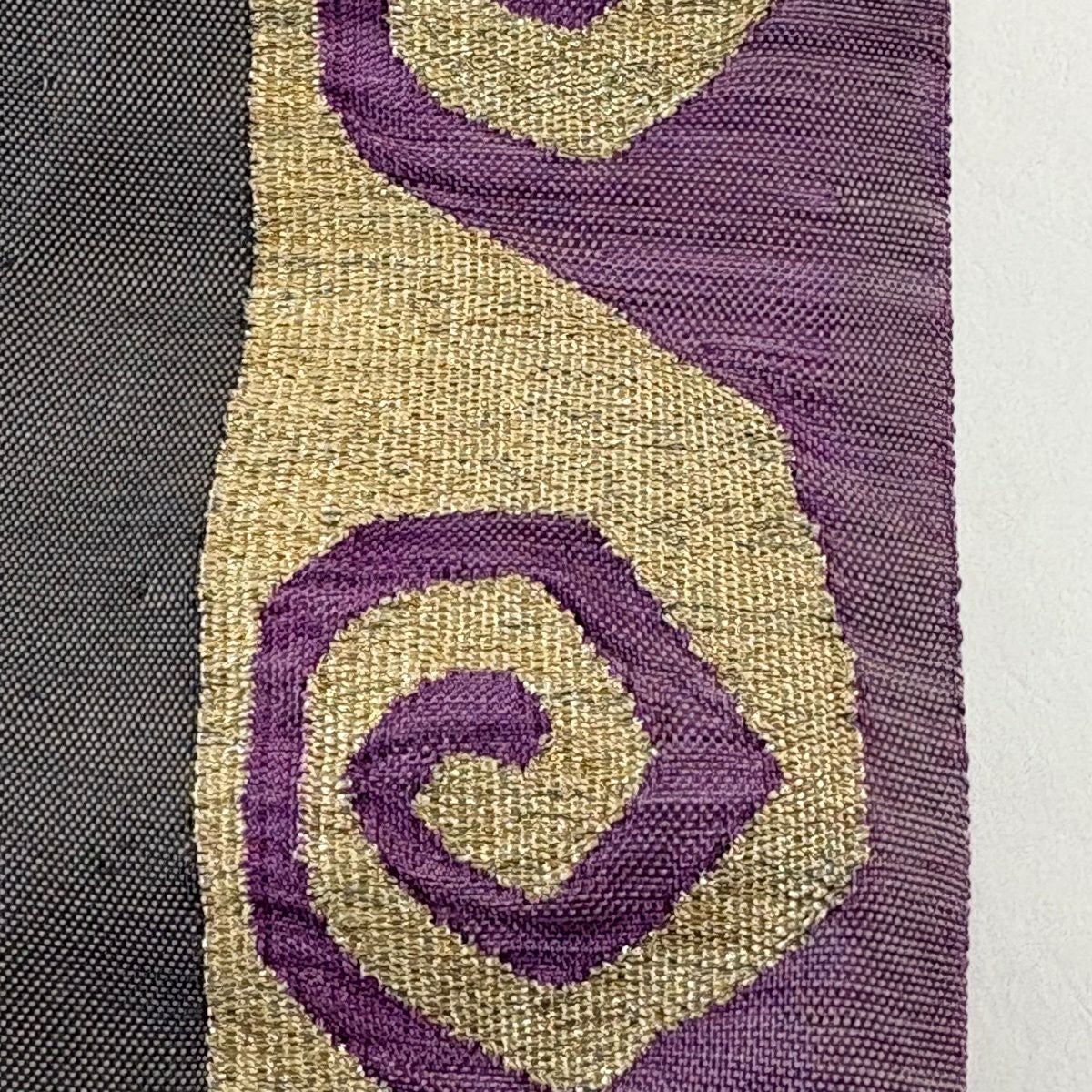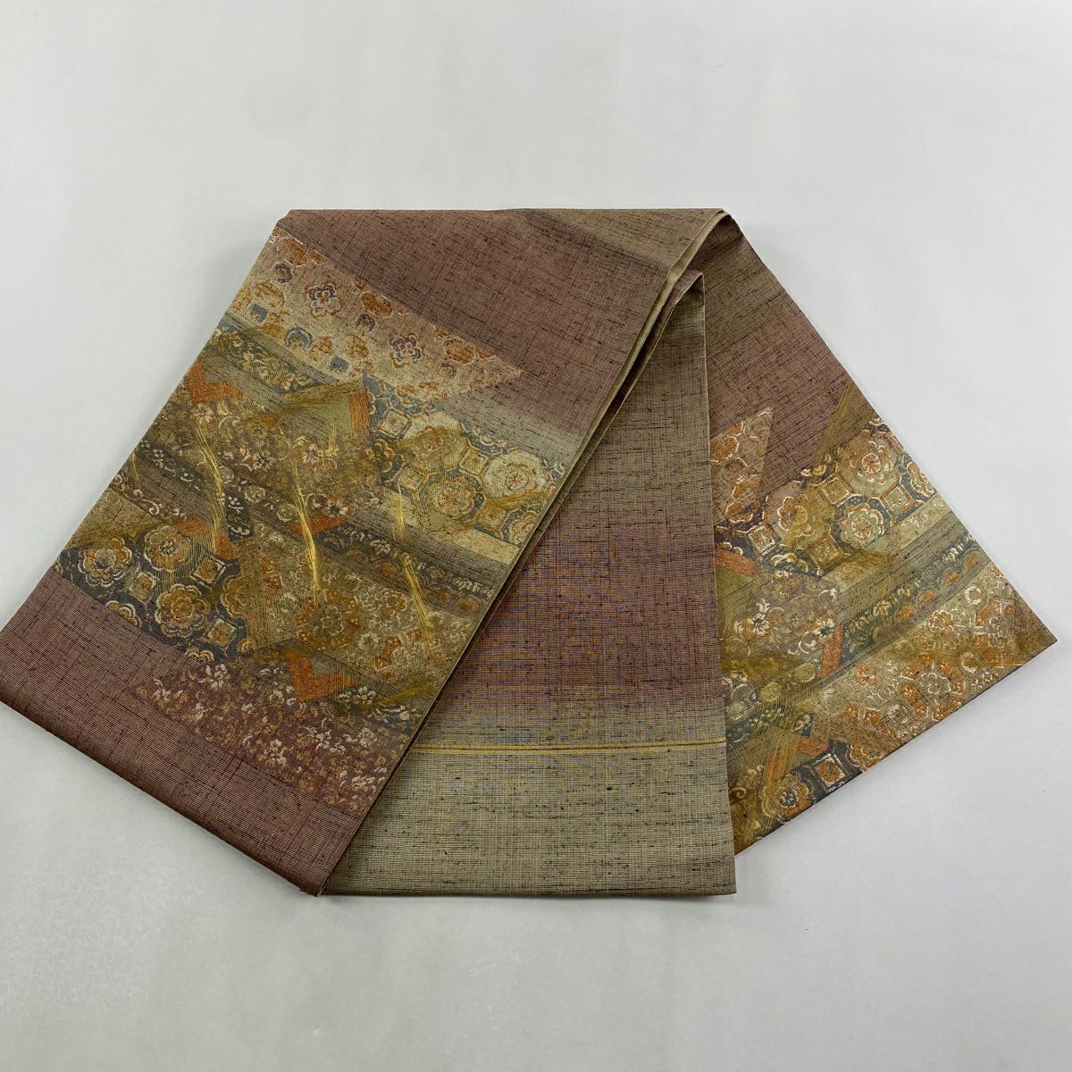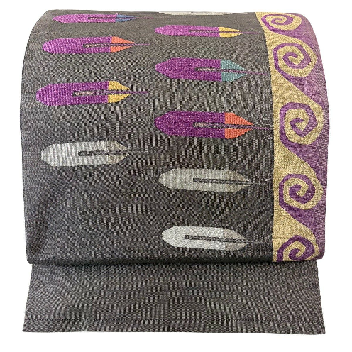 袋帯 逸品 帝王紫 落款あり 紬地 幾何学模様 金糸 ラメ糸 灰茶 お太鼓柄 正絹