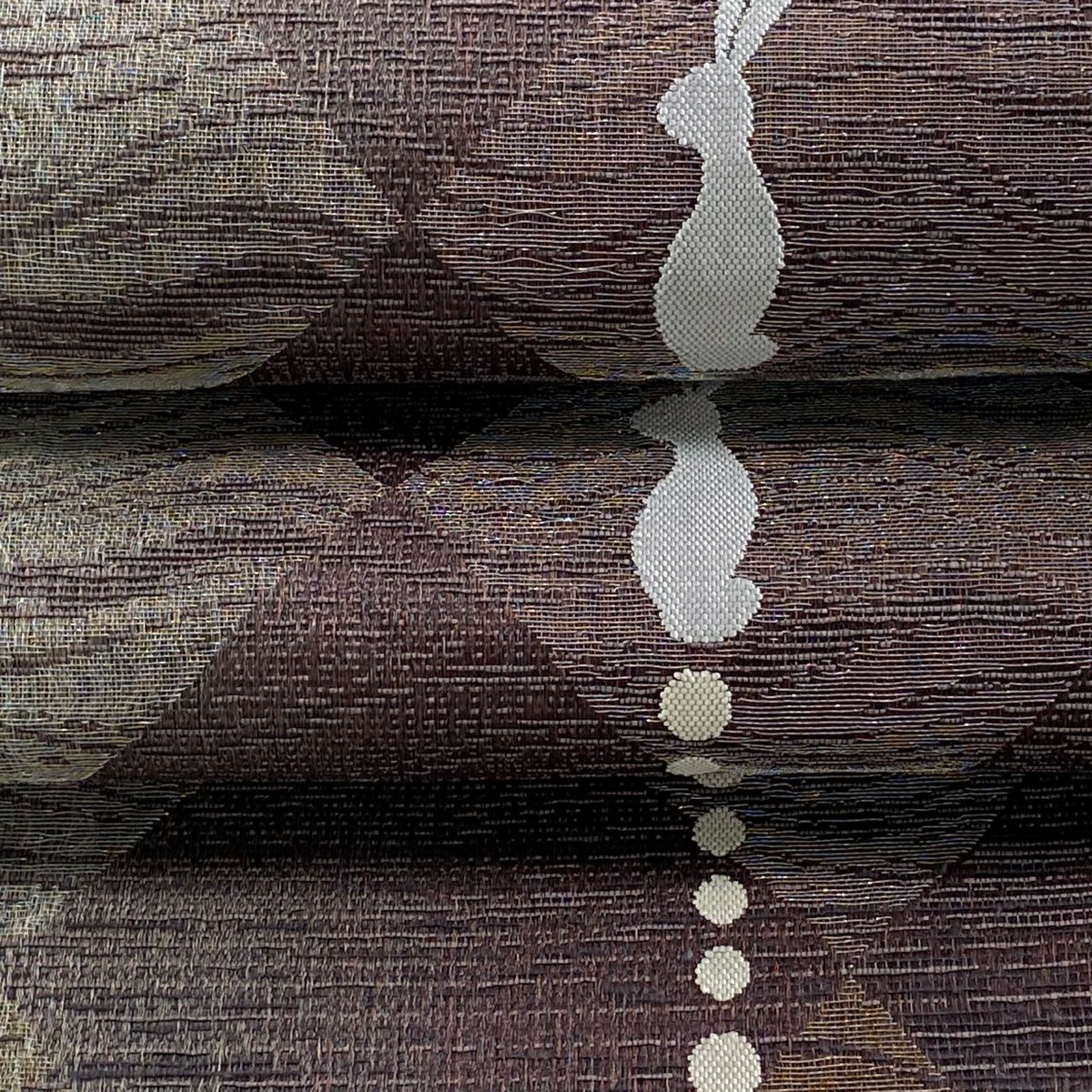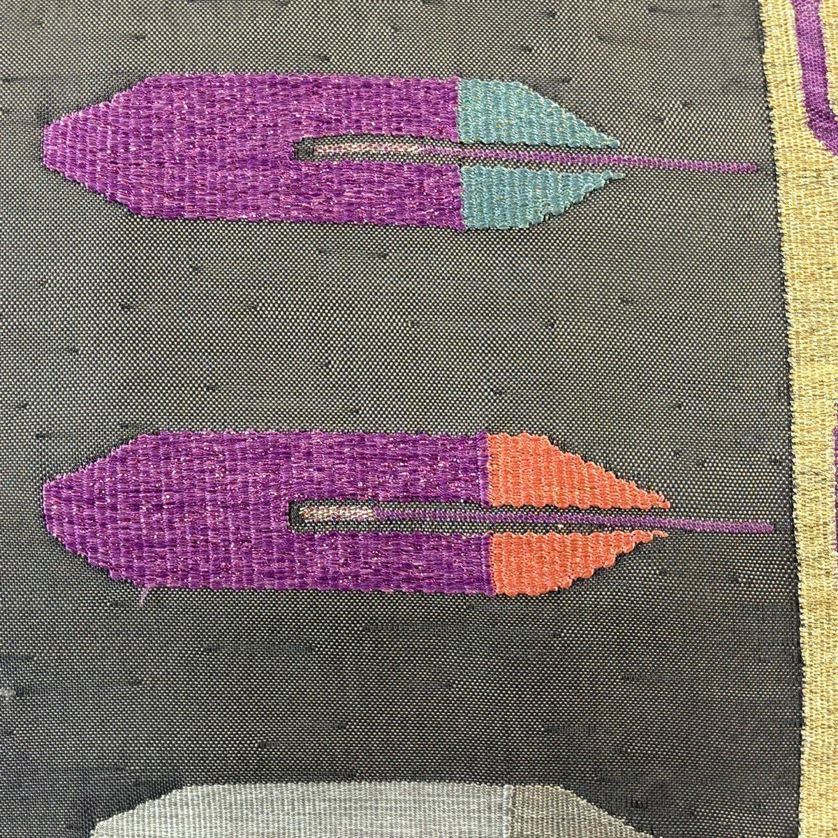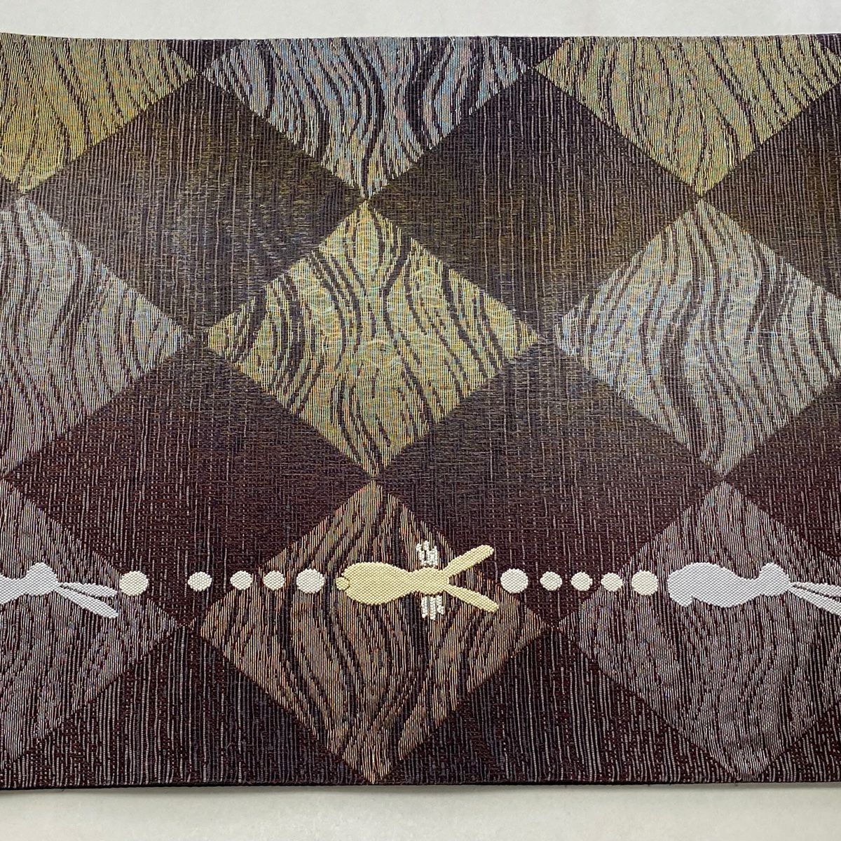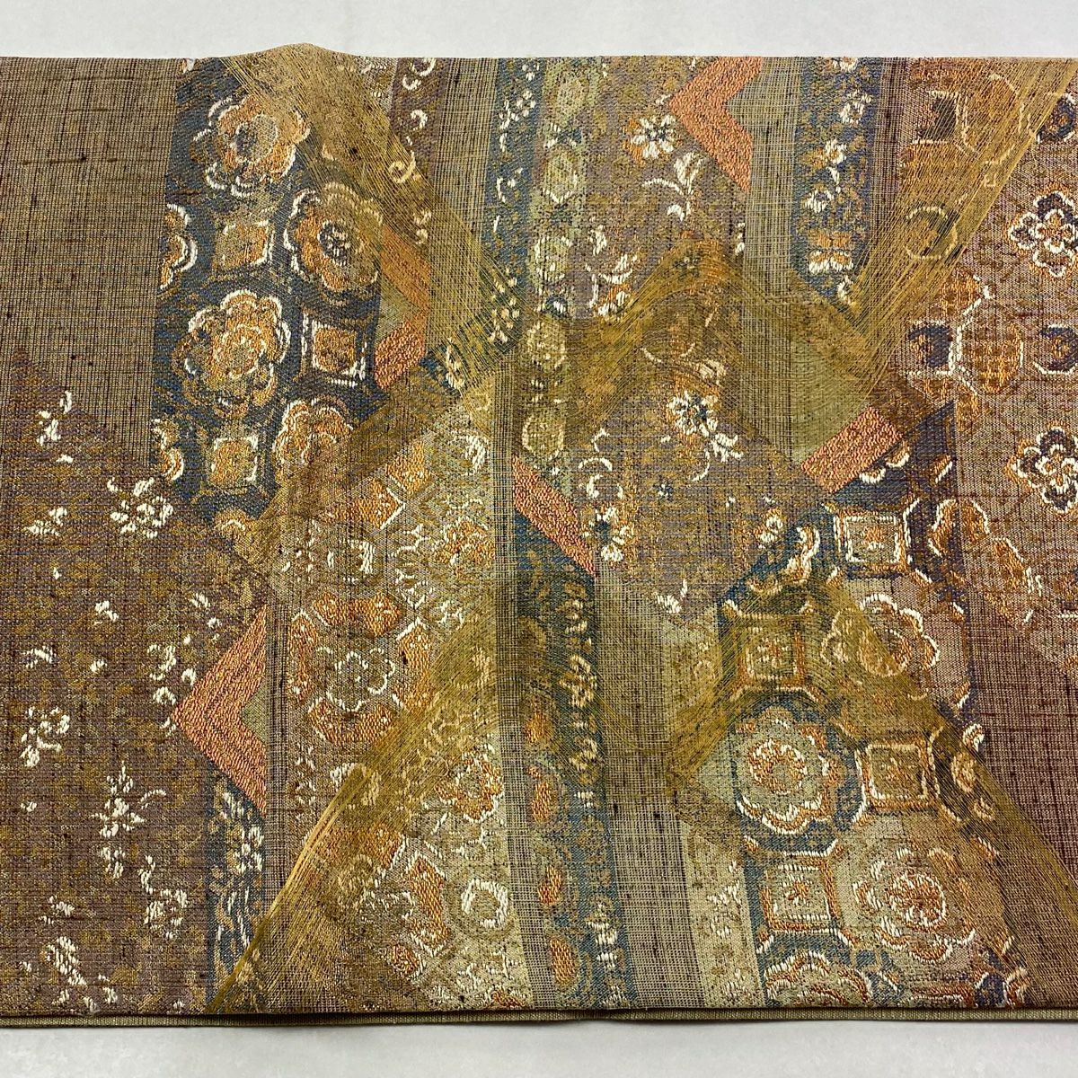 袋帯 逸品 帝王紫 落款あり 紬地 幾何学模様 金糸 ラメ糸 灰茶 お太鼓柄 正絹