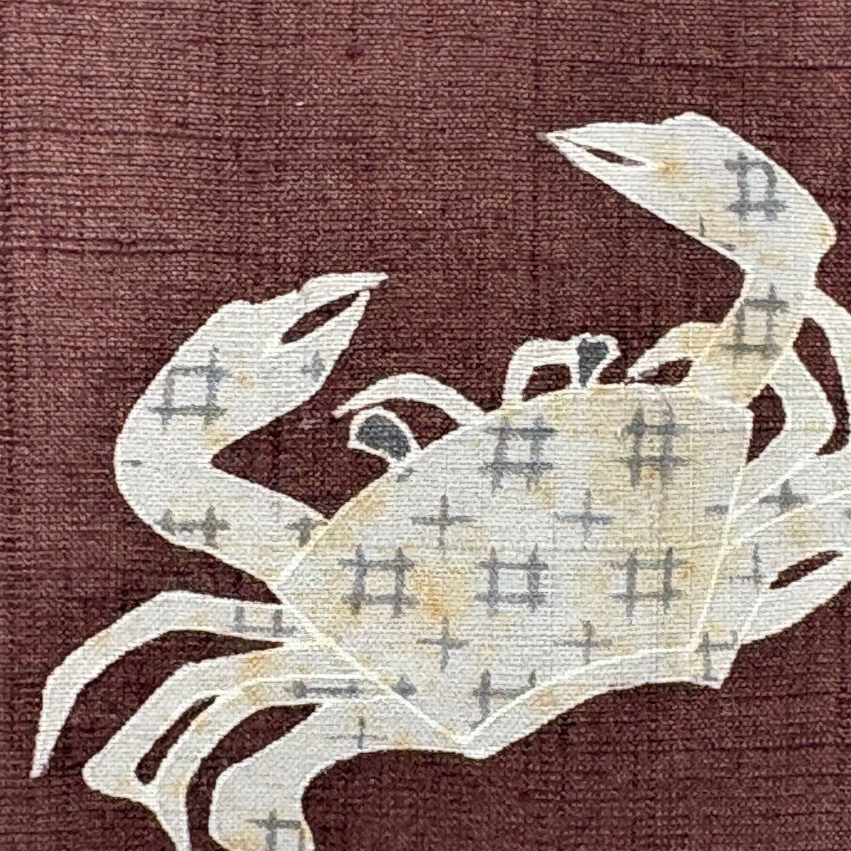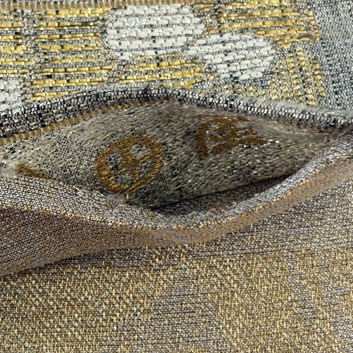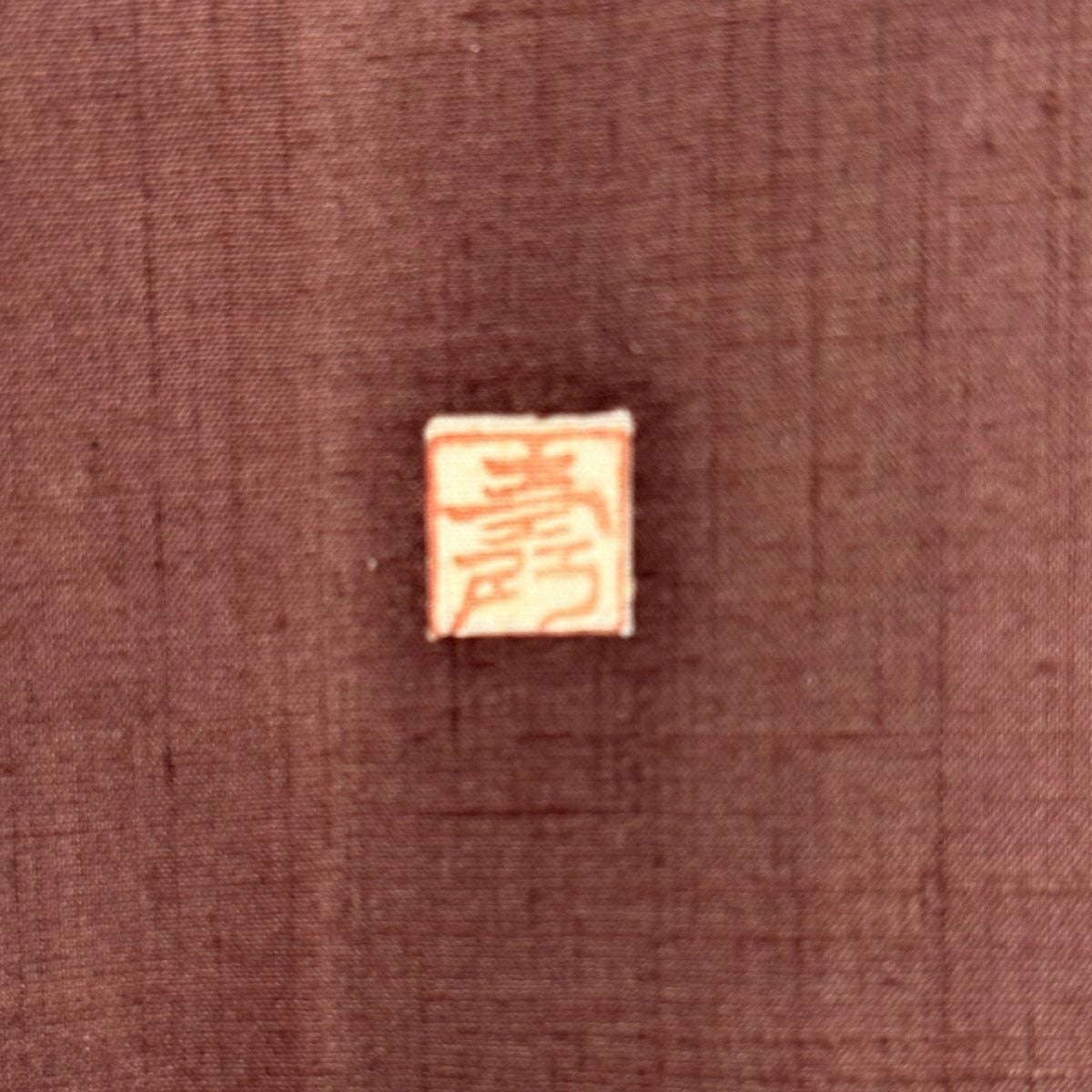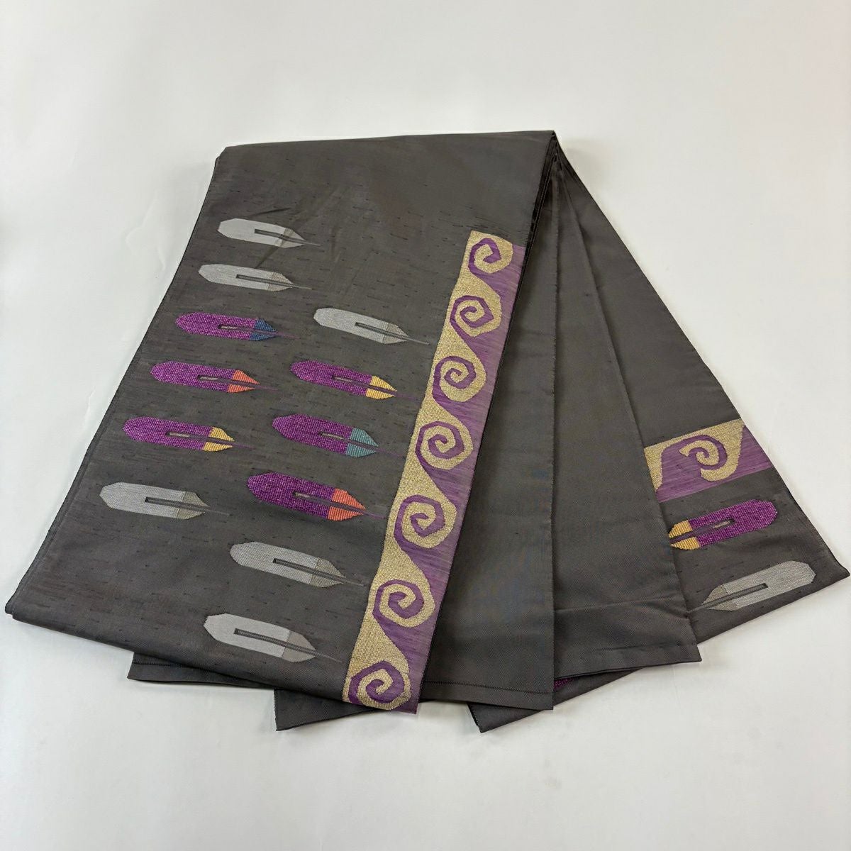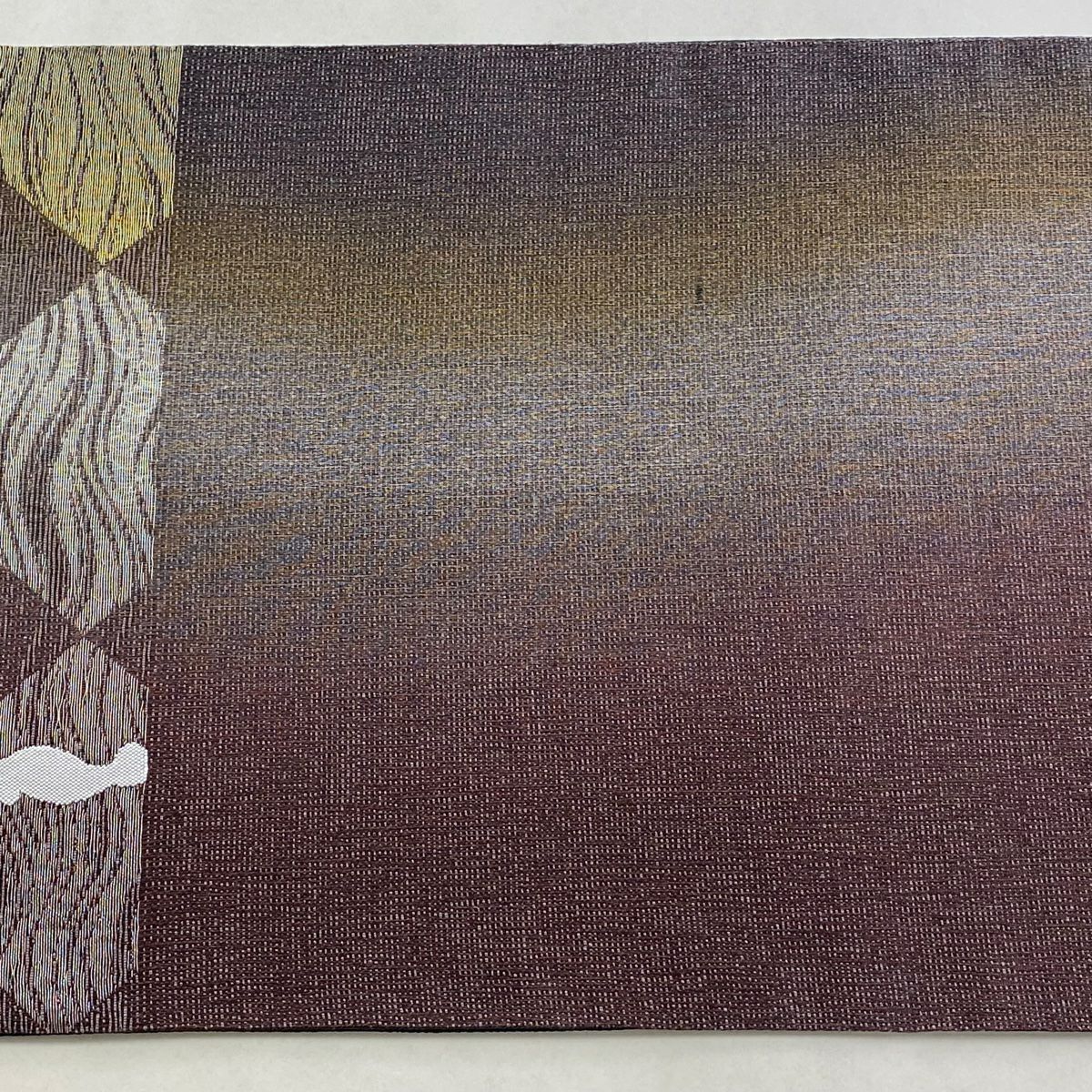 袋帯 逸品 帝王紫 落款あり 紬地 幾何学模様 金糸 ラメ糸 灰茶 お太鼓柄 正絹