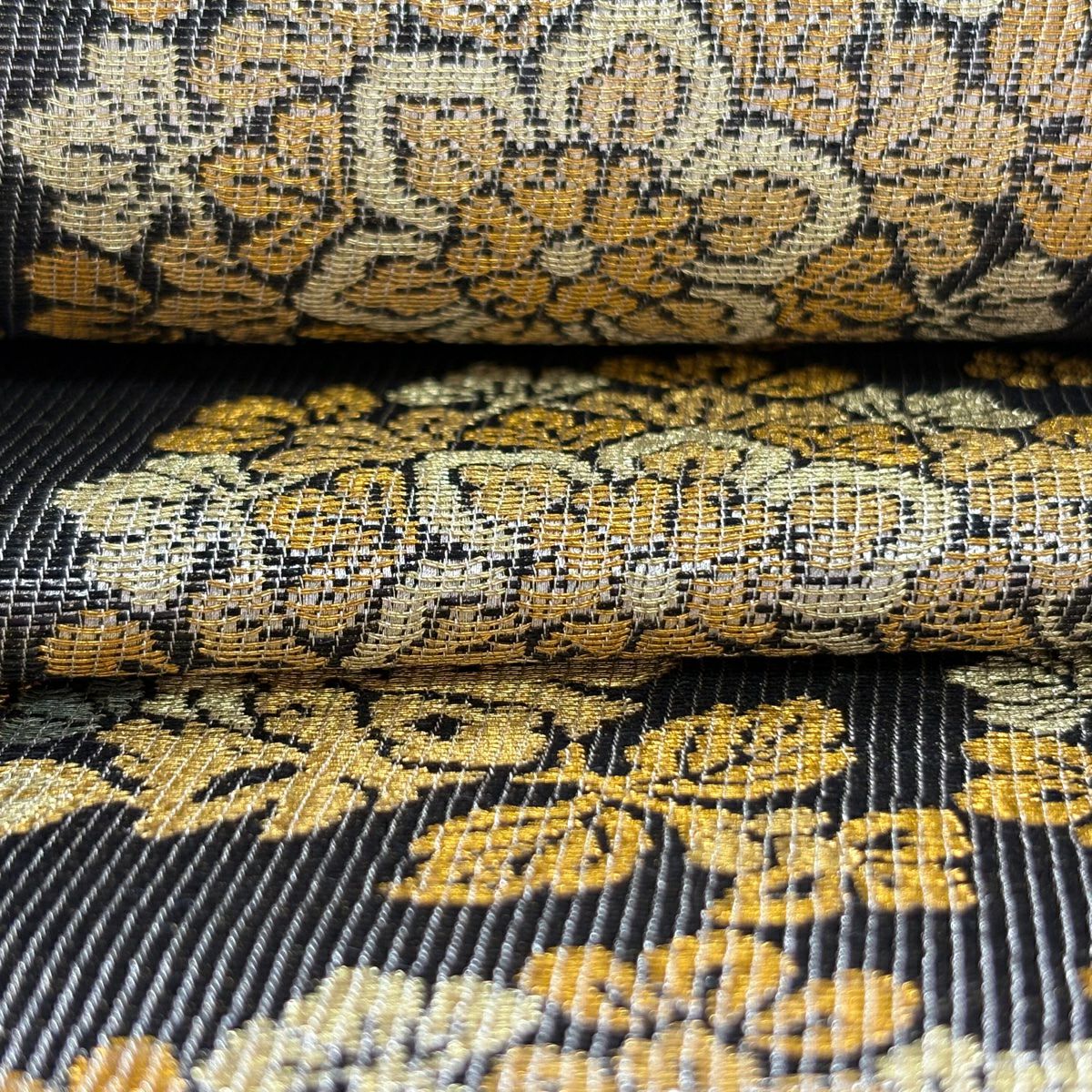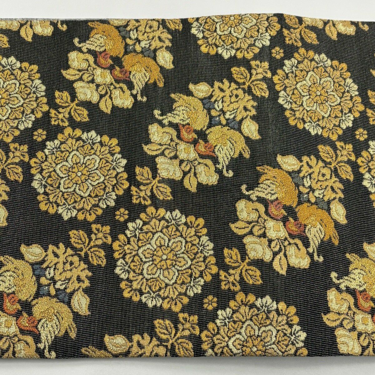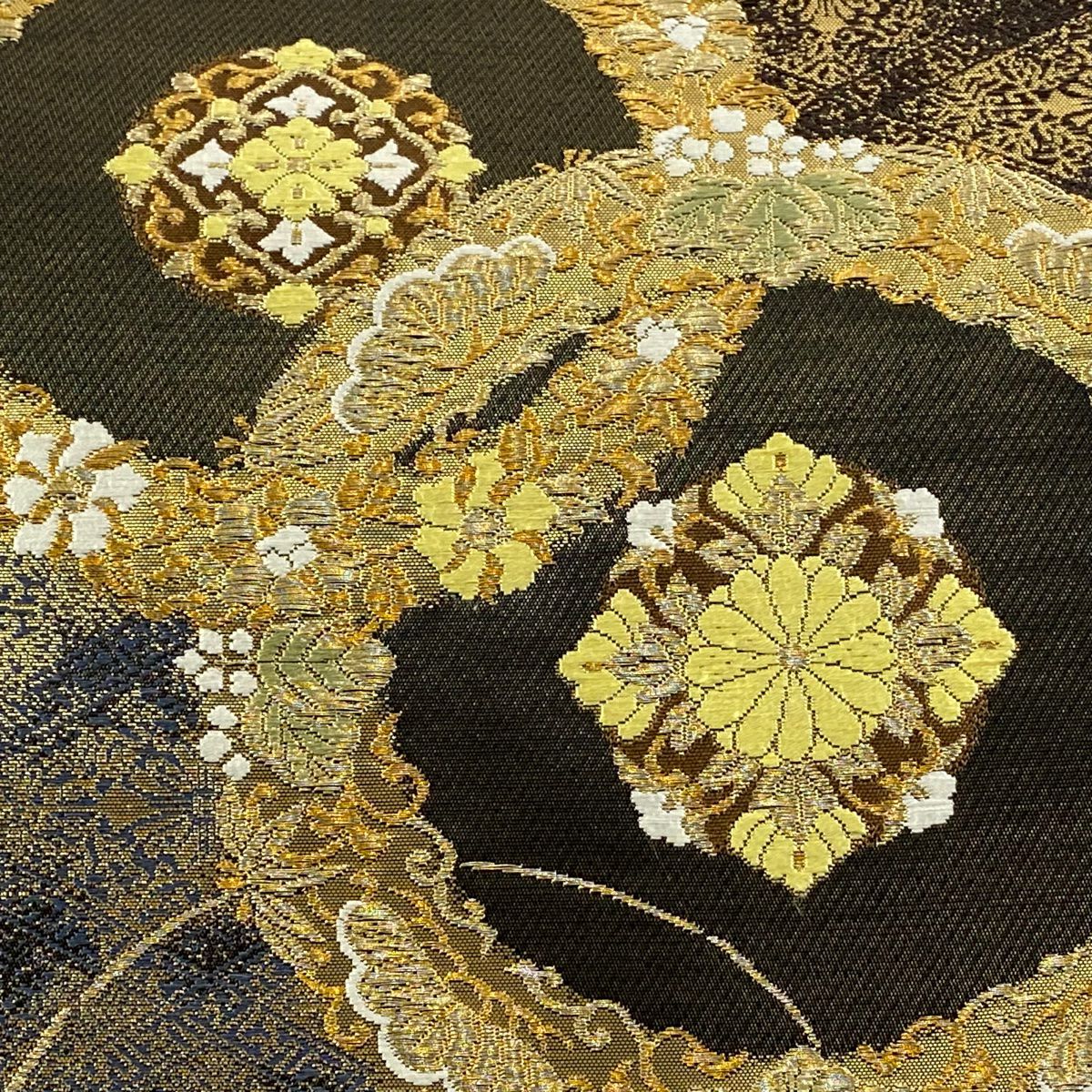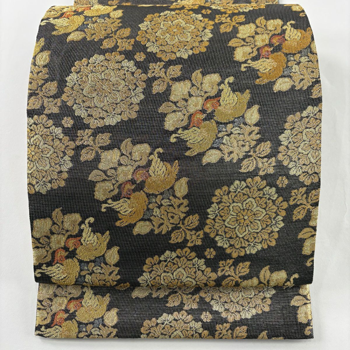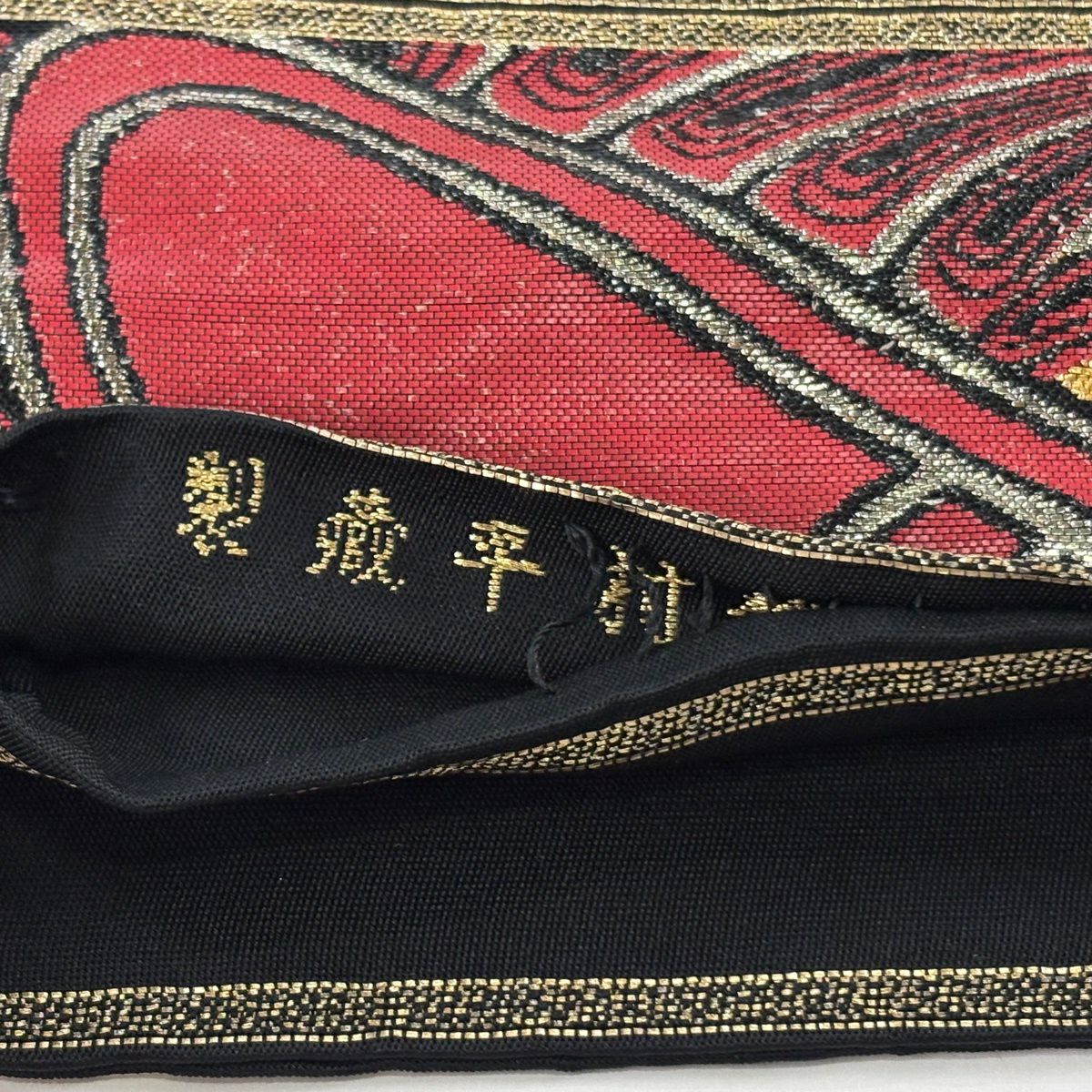 【美品】 袋帯 逸品 白綾苑大庭 落款あり 楓 流線 唐織 金銀糸 黒 六通 正絹