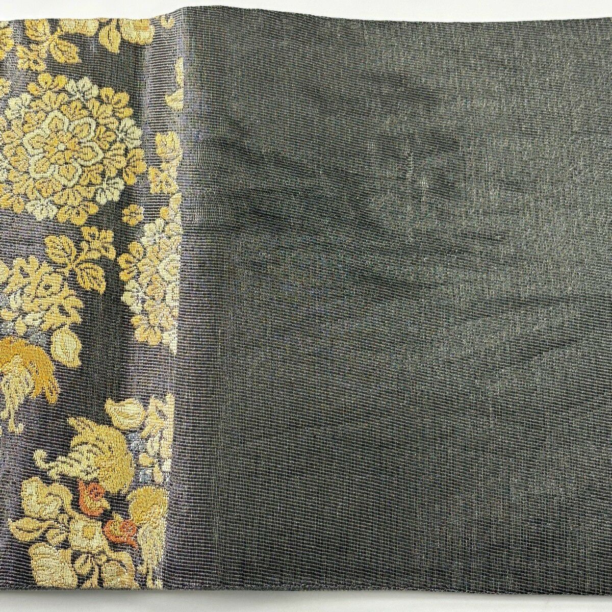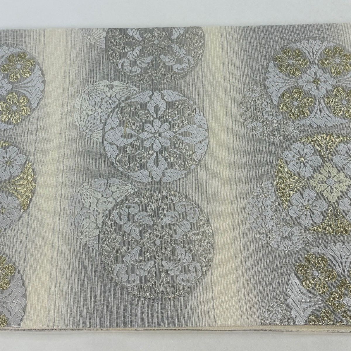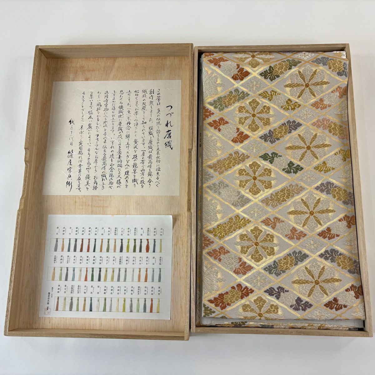 袋帯 逸品 落款あり 共箱付 篠谷宗兵衛 華文 草花 唐織 金糸 灰色 六通 正絹