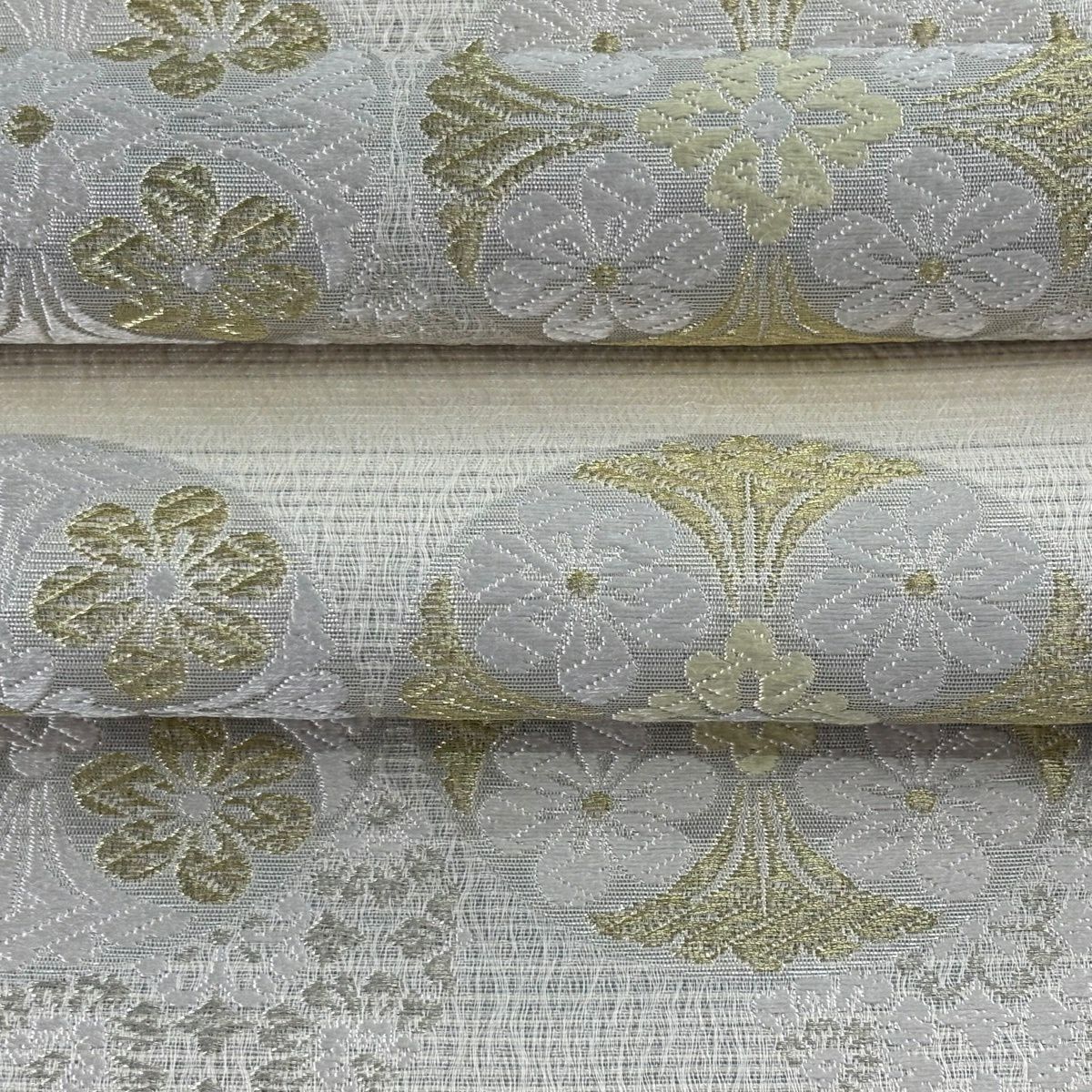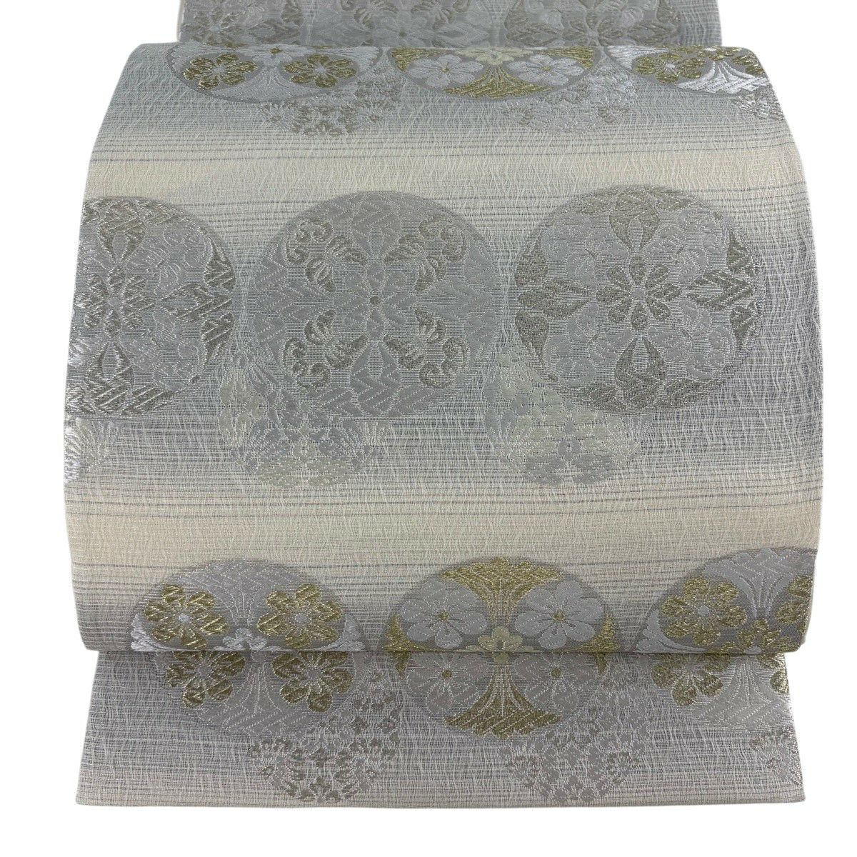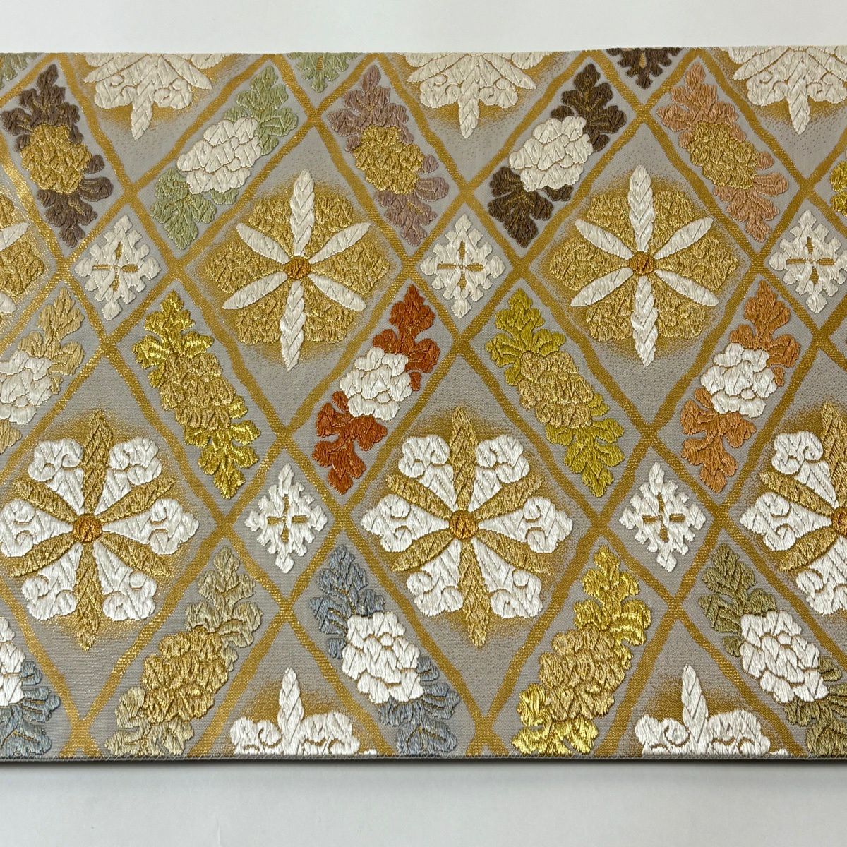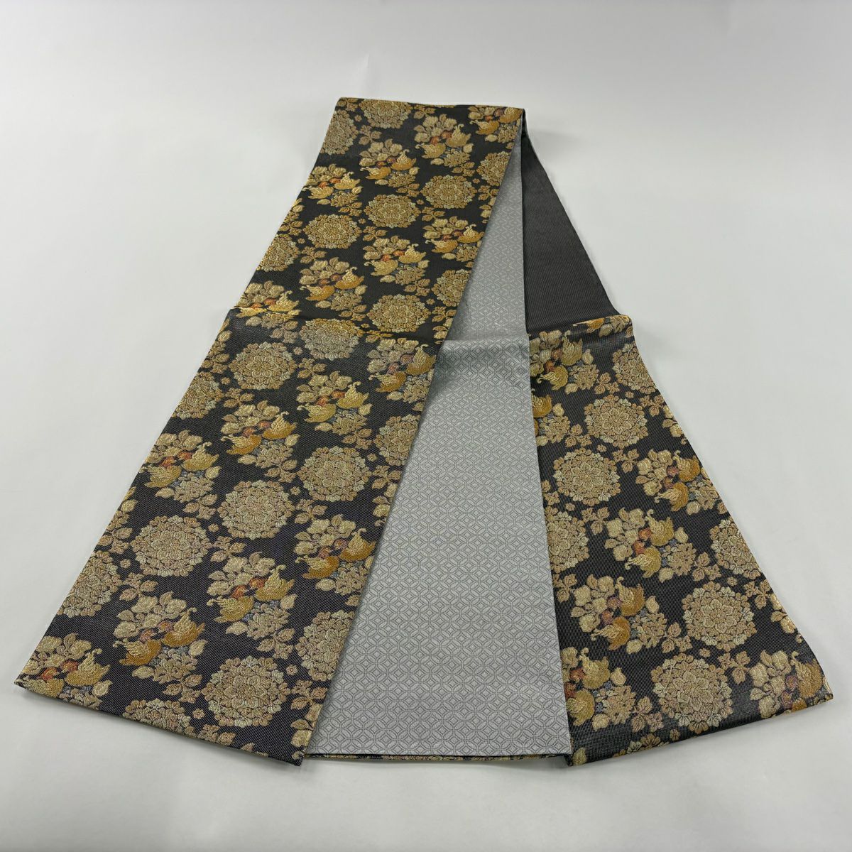 袋帯 逸品 落款あり 共箱付 篠谷宗兵衛 華文 草花 唐織 金糸 灰色 六通 正絹