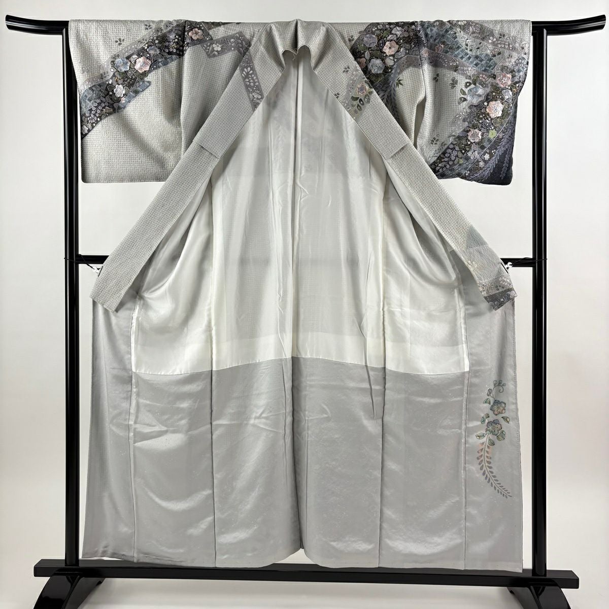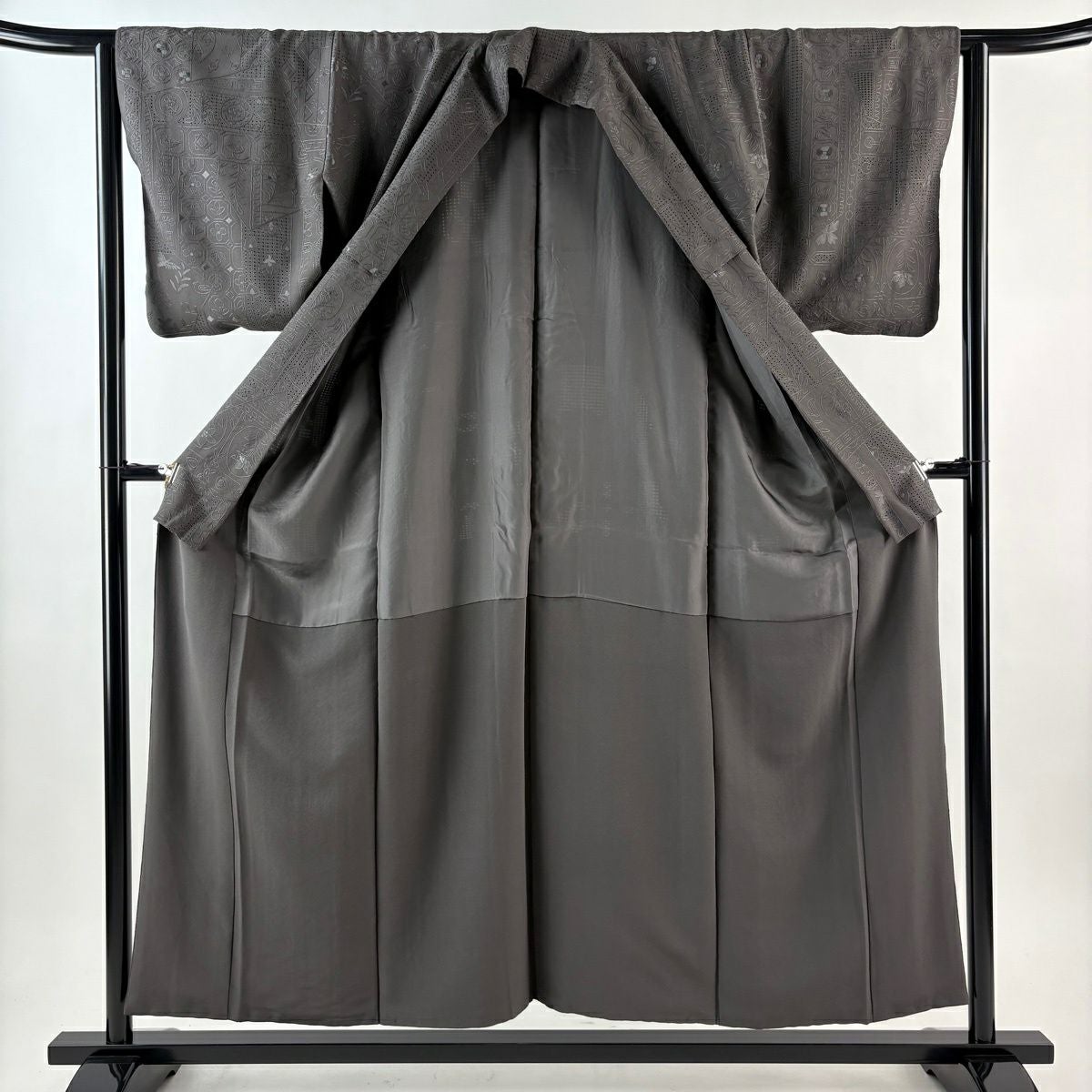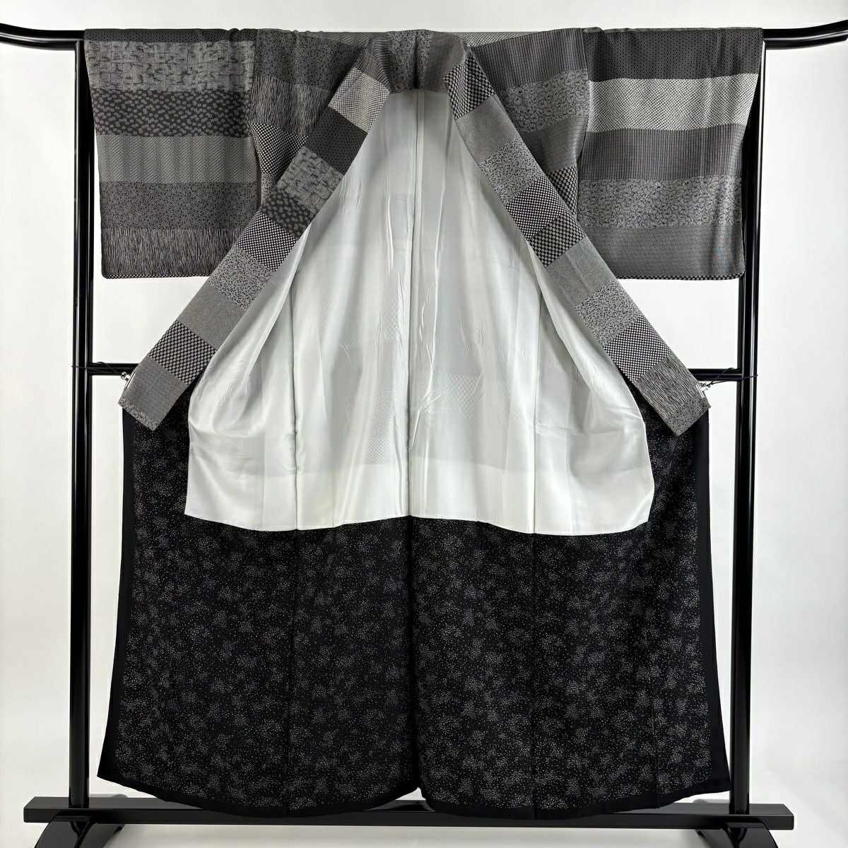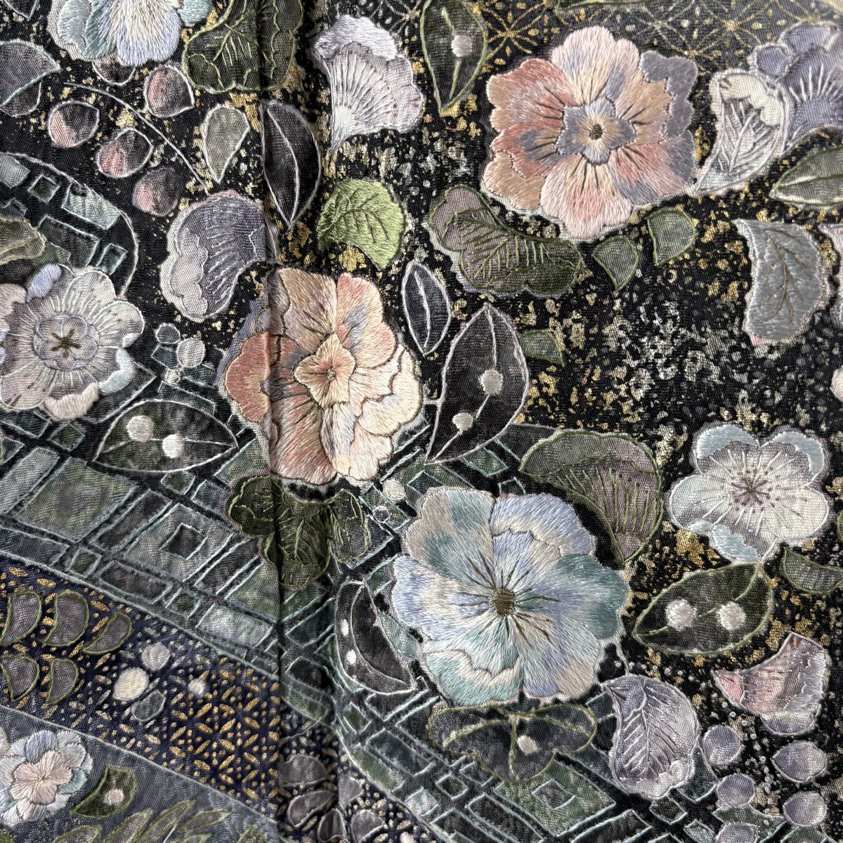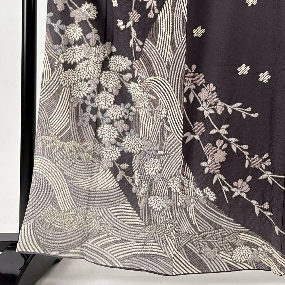 小紋 身丈154.5cm 裄丈63cm S 袷 草花 幾何学 刺繍 墨色 正絹 逸品