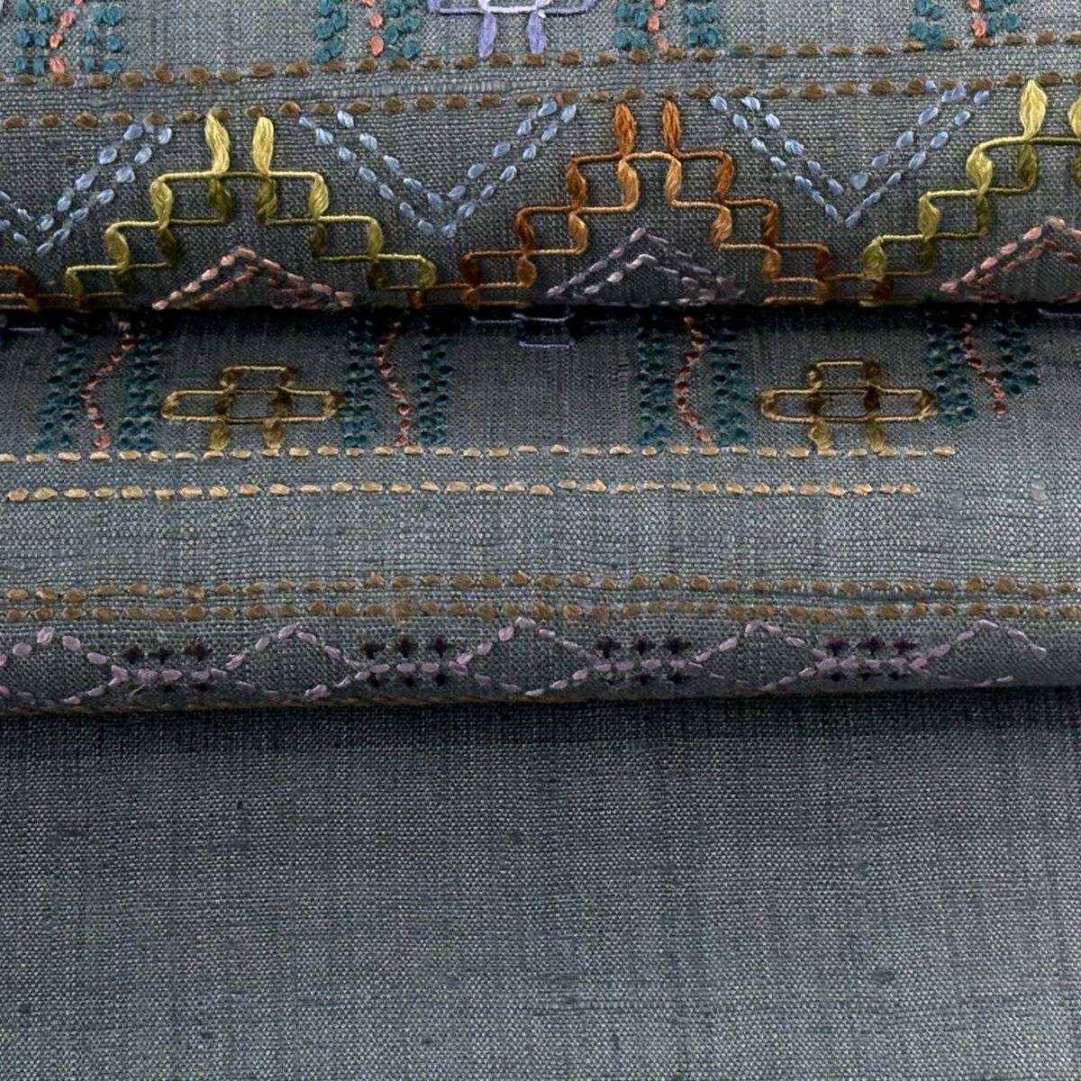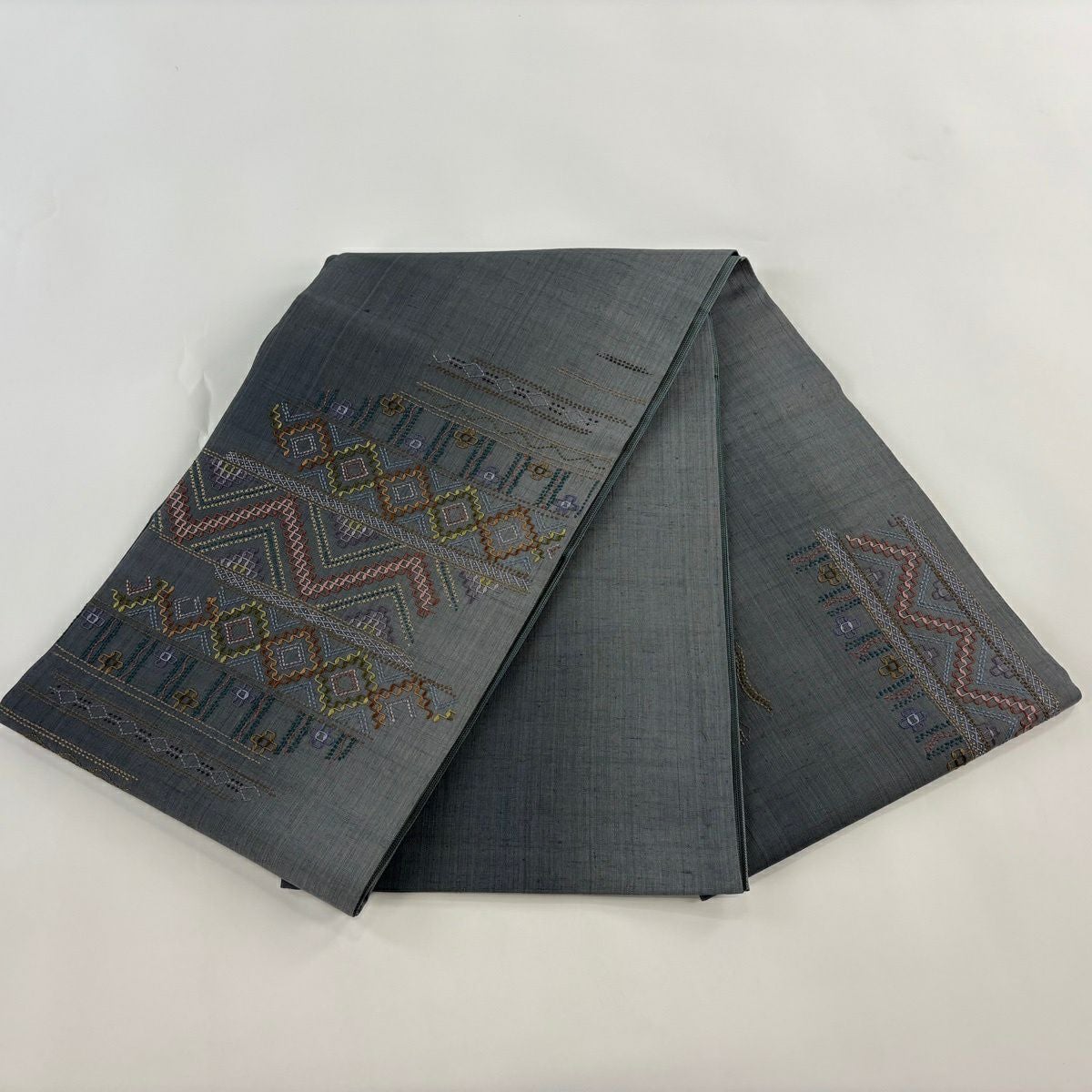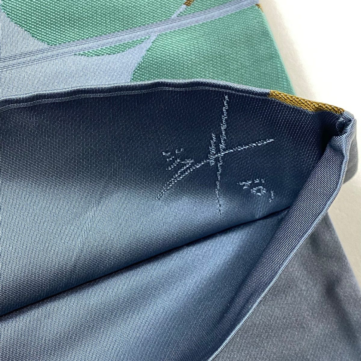 【美品】 袋帯 逸品 紬地 やまと 菱 幾何学 刺繍 刺し子刺繍 灰緑 お太鼓柄 正絹