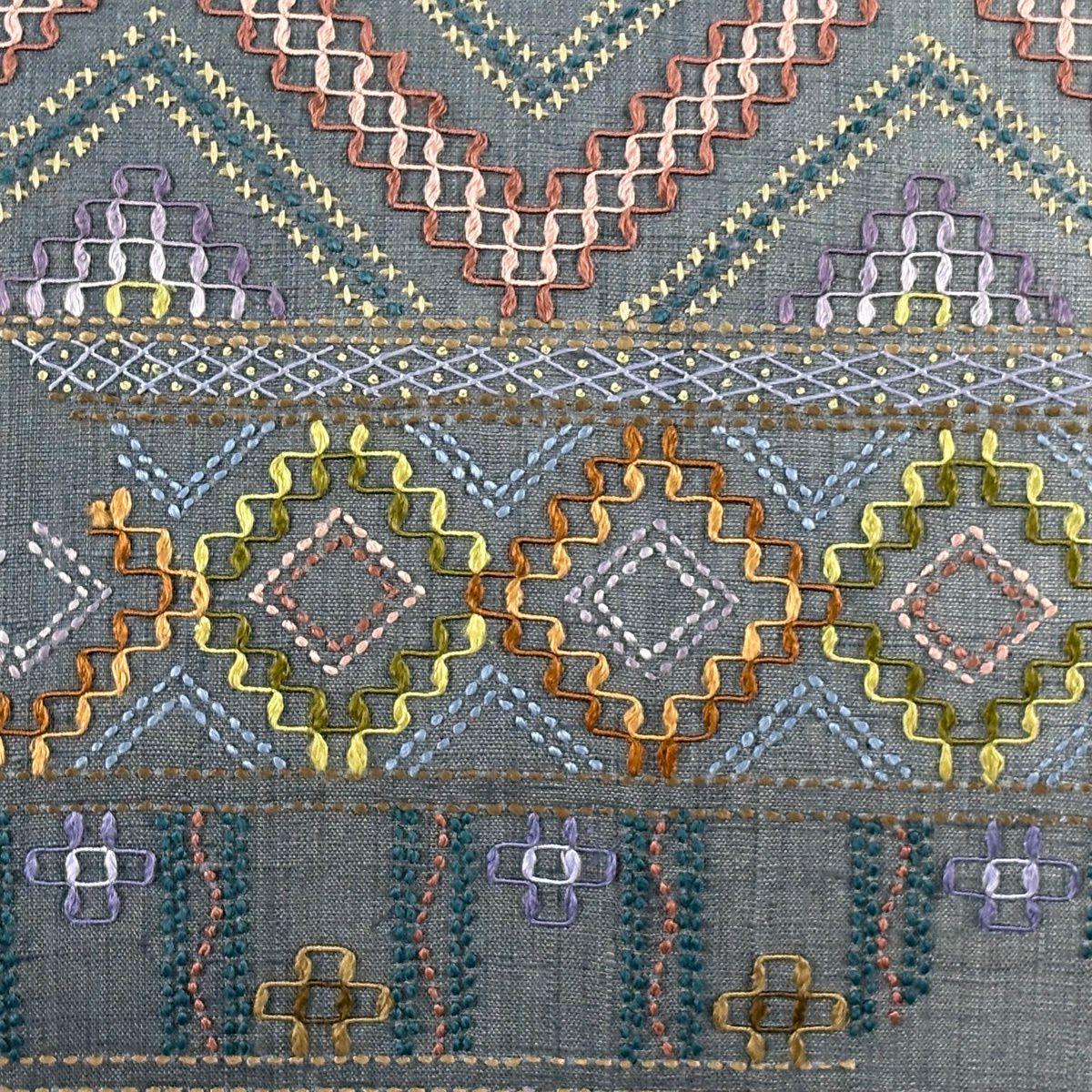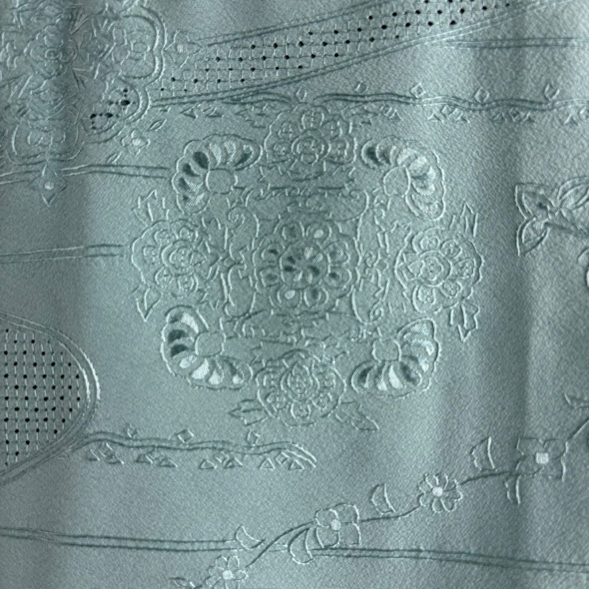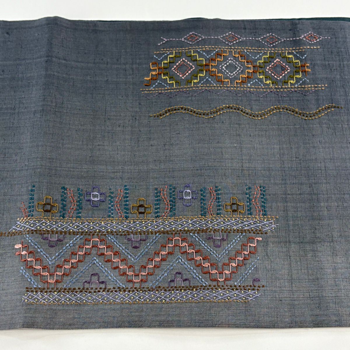 【美品】 袋帯 逸品 紬地 やまと 菱 幾何学 刺繍 刺し子刺繍 灰緑 お太鼓柄 正絹