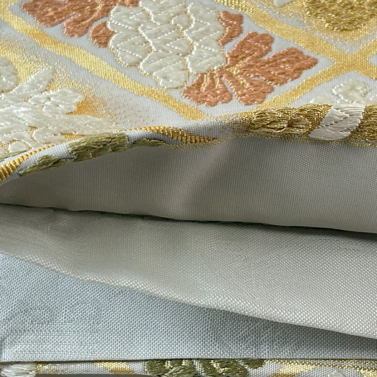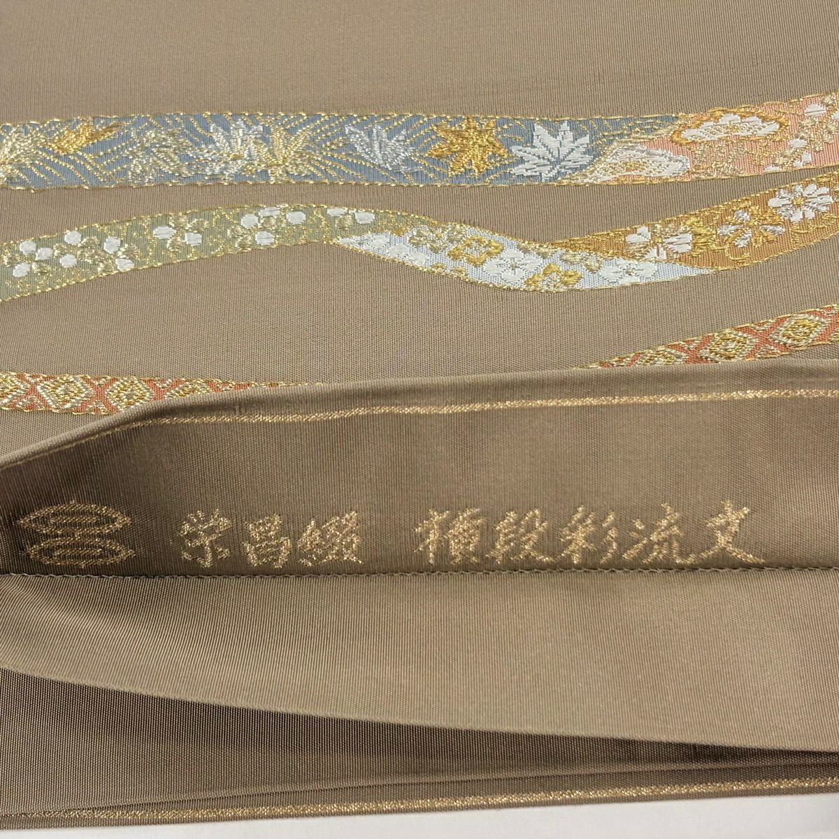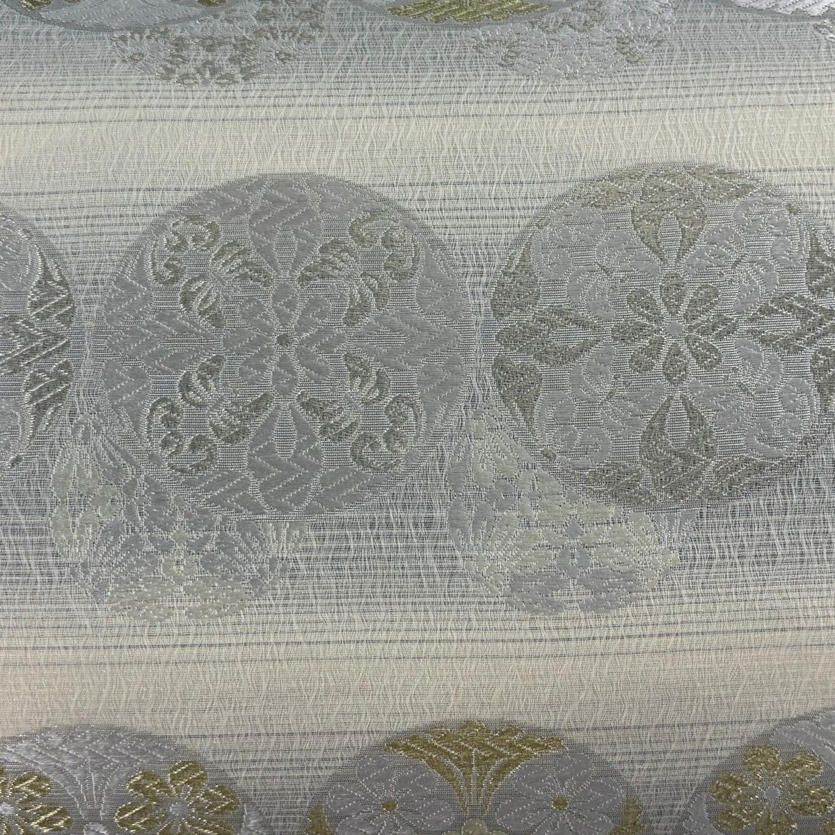袋帯 逸品 河村織物 落款あり 花丸文 熨斗 金銀糸 刺繍 薄茶色 お太鼓柄 正絹