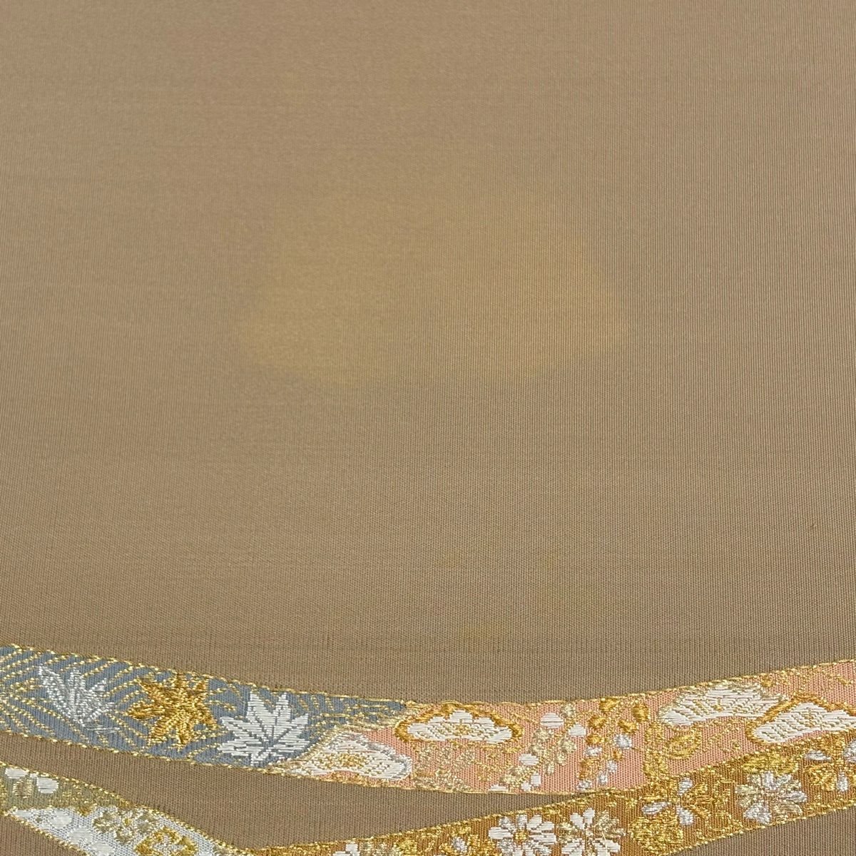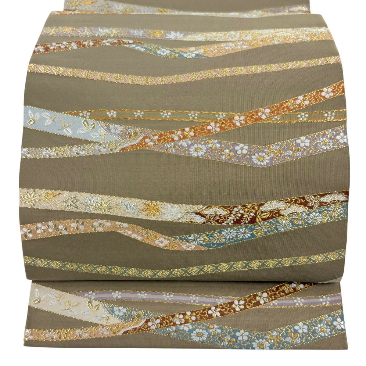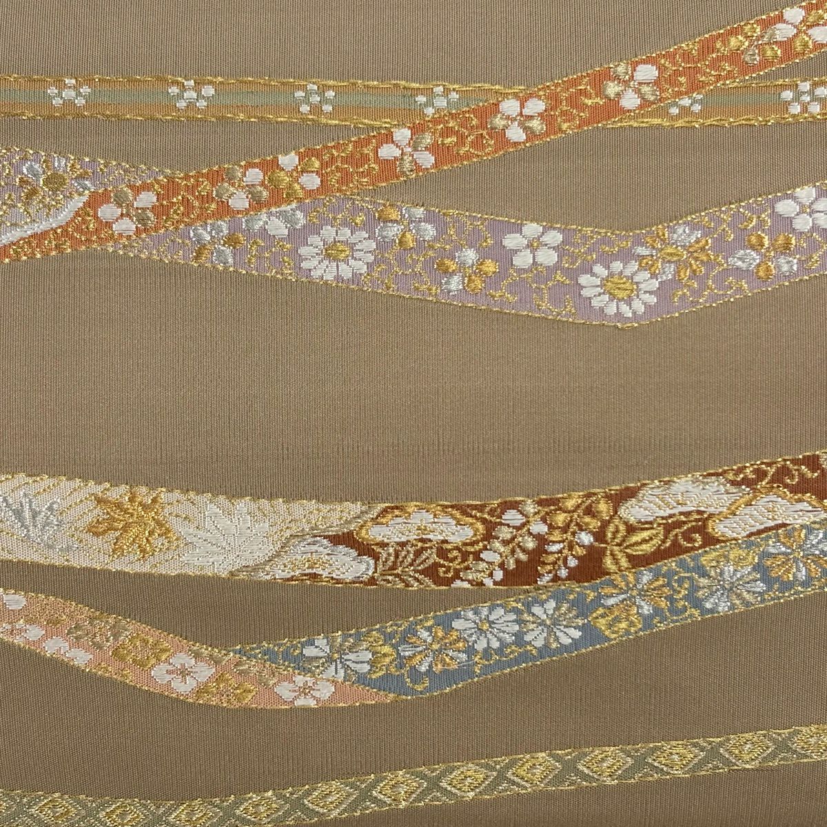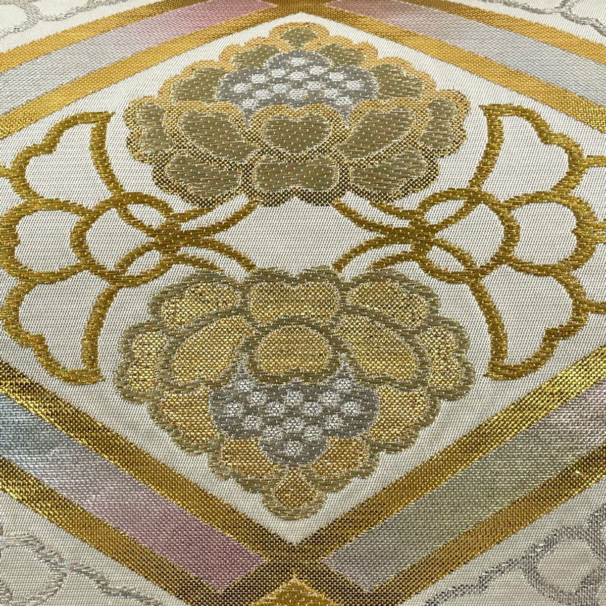 袋帯 逸品 河村織物 落款あり 花丸文 熨斗 金銀糸 刺繍 薄茶色 お太鼓柄 正絹