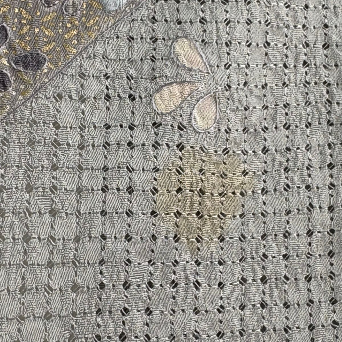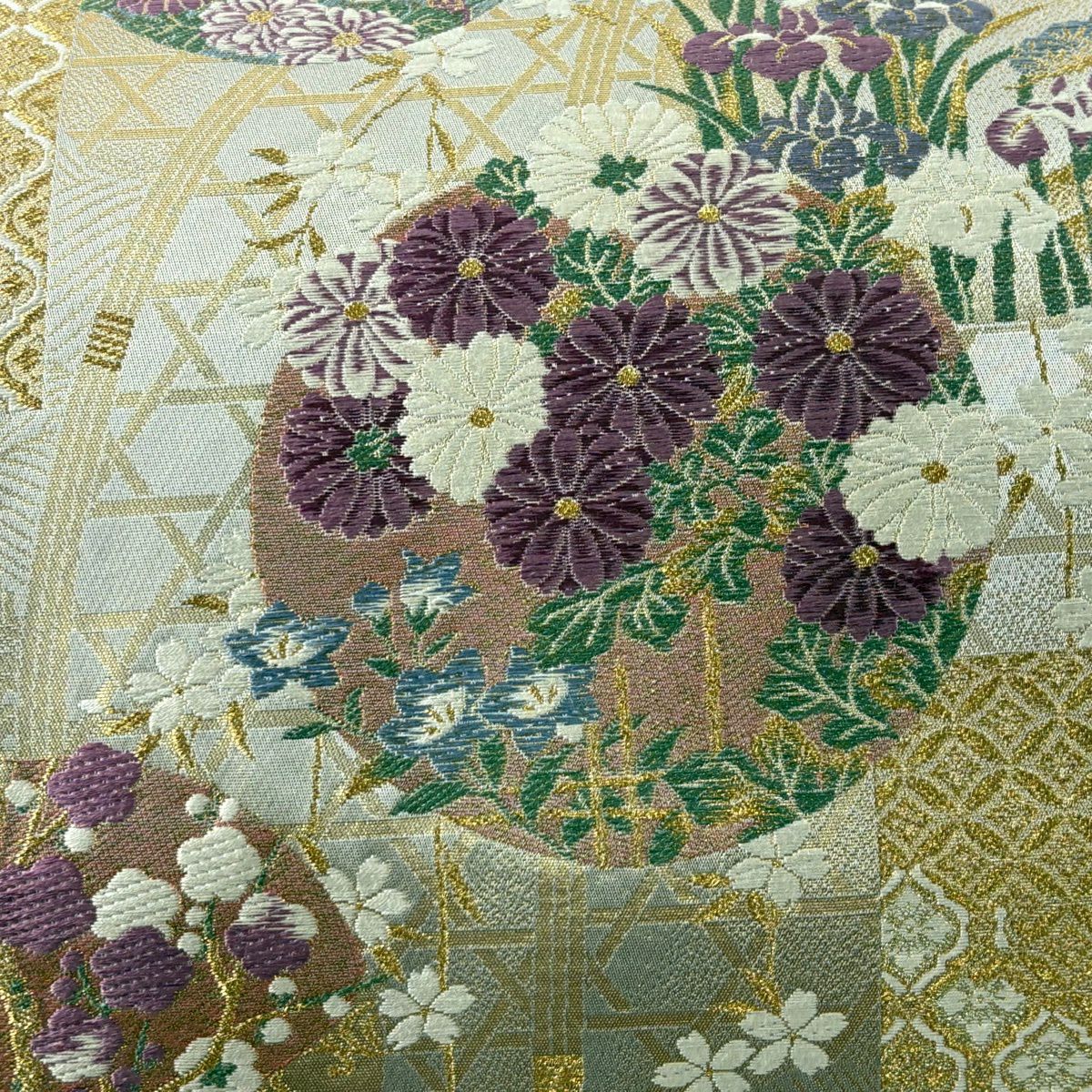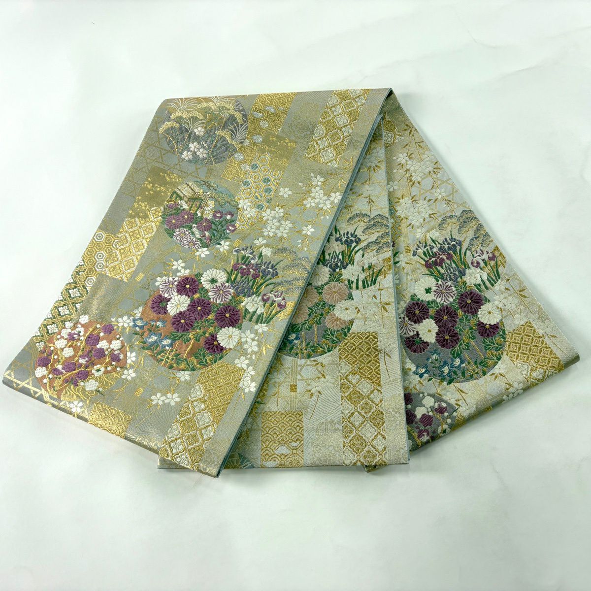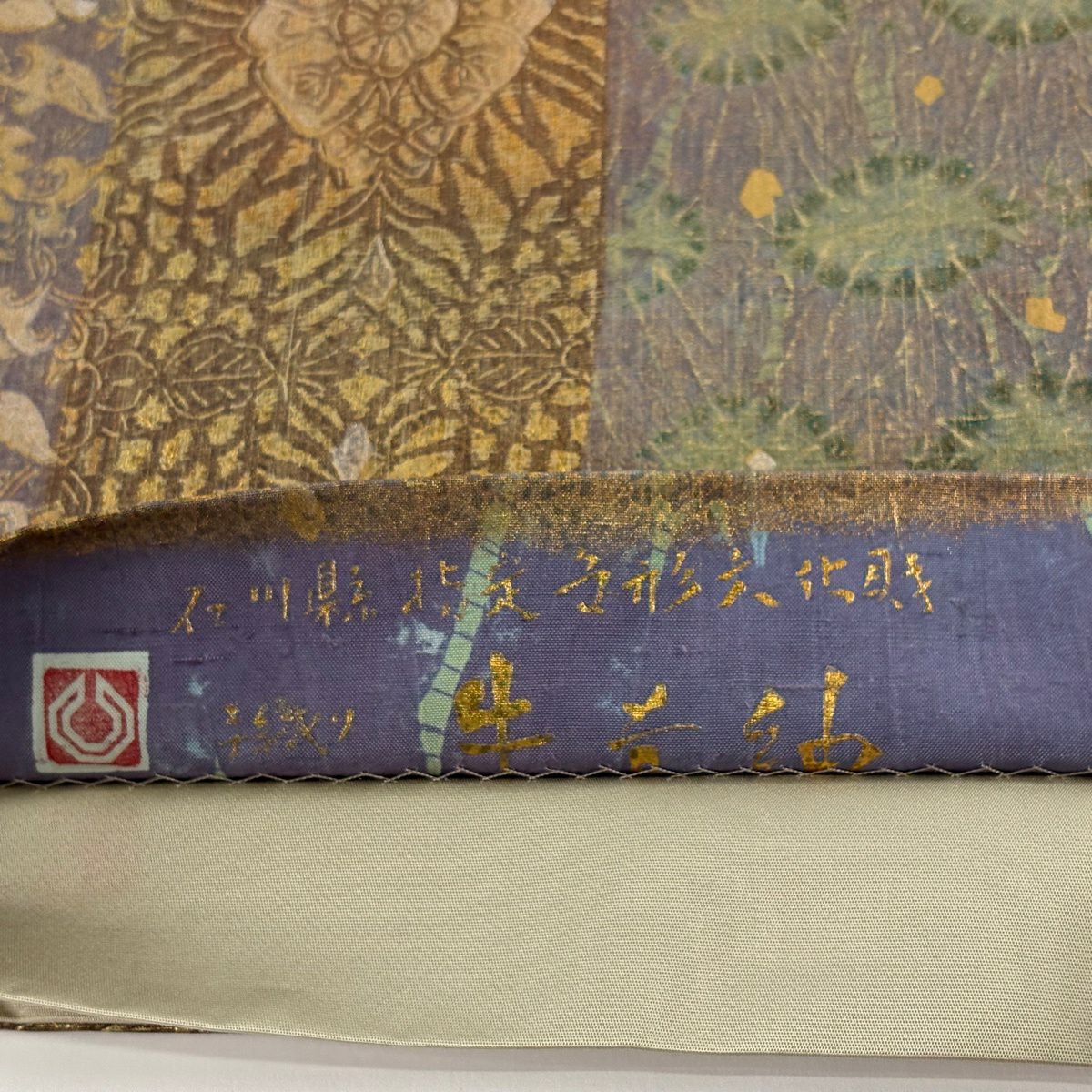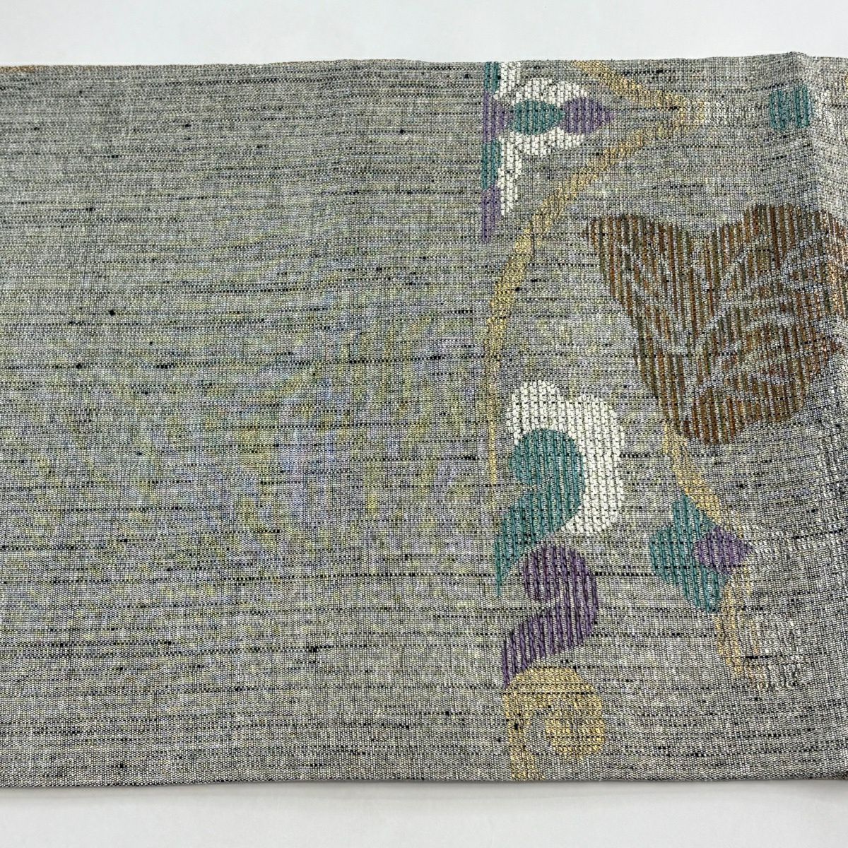 【美品】 袋帯 逸品 落款あり 牛首紬地 草花 幾何学模様 金彩 灰紫 全通 正絹