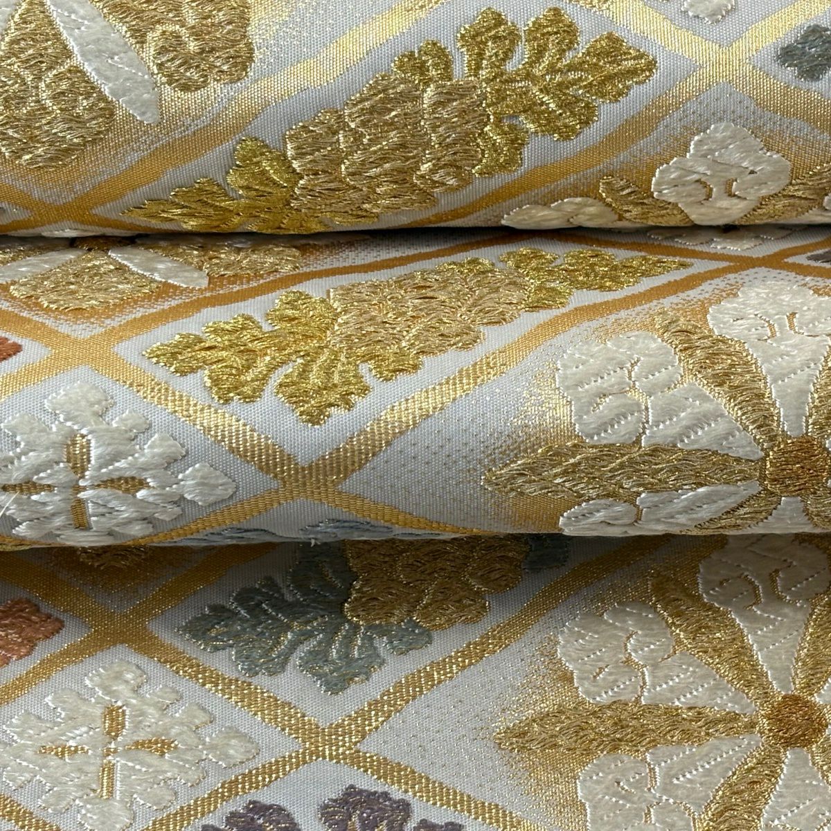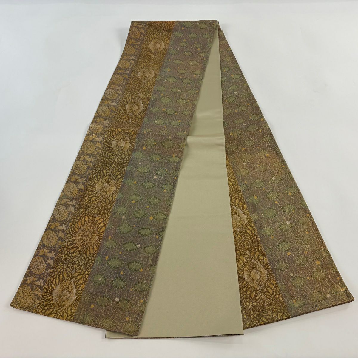 【美品】 袋帯 逸品 新小石丸 草木染 草花 浮線綾文様 金糸 クリーム 六通 正絹