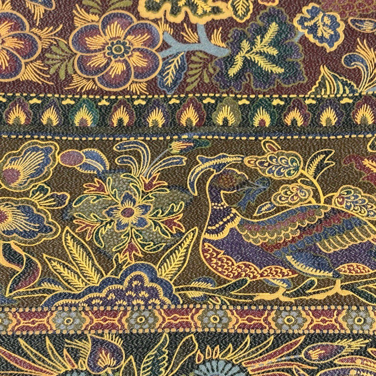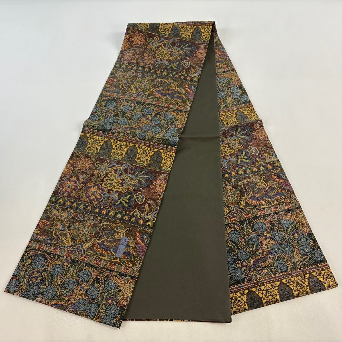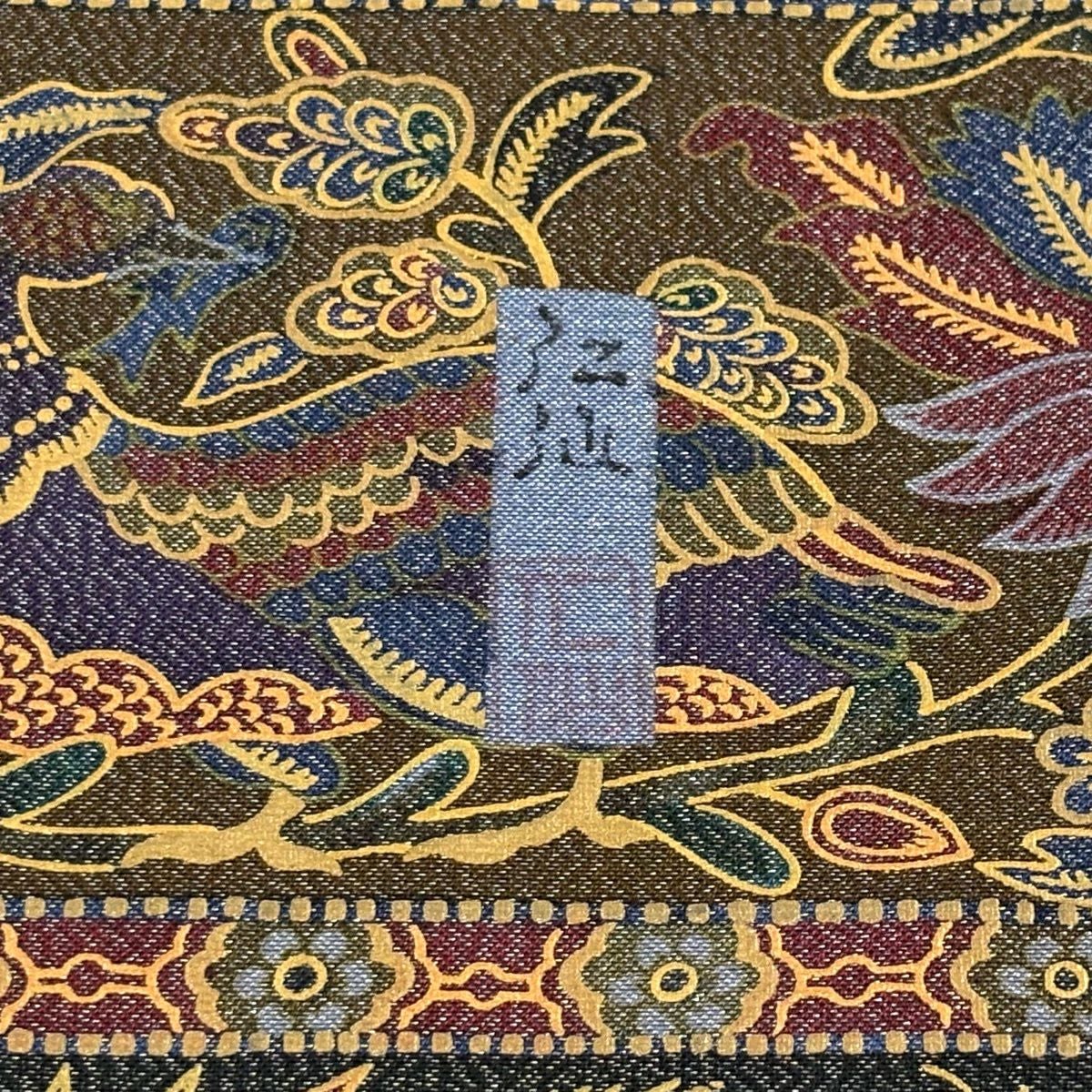 【美品】 袋帯 逸品 前田仁仙 落款あり 鳥 草花 銀糸 金彩 茶緑色 全通 正絹