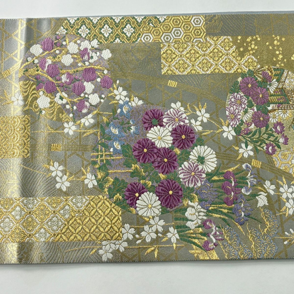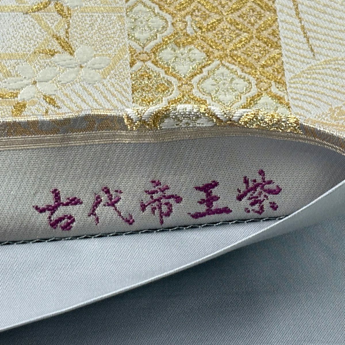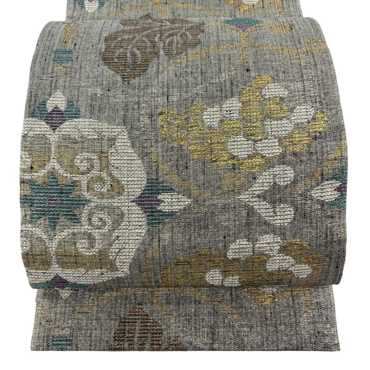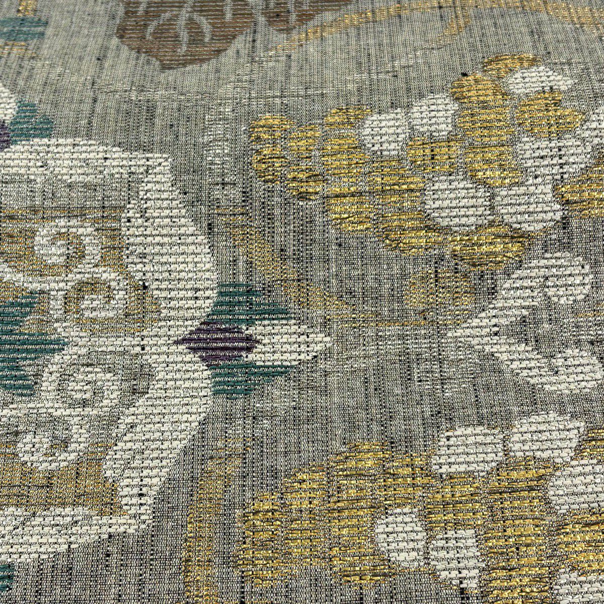【美品】 袋帯 逸品 古代帝王紫 草花 有職文様 唐織 金糸 灰色 お太鼓柄 正絹
