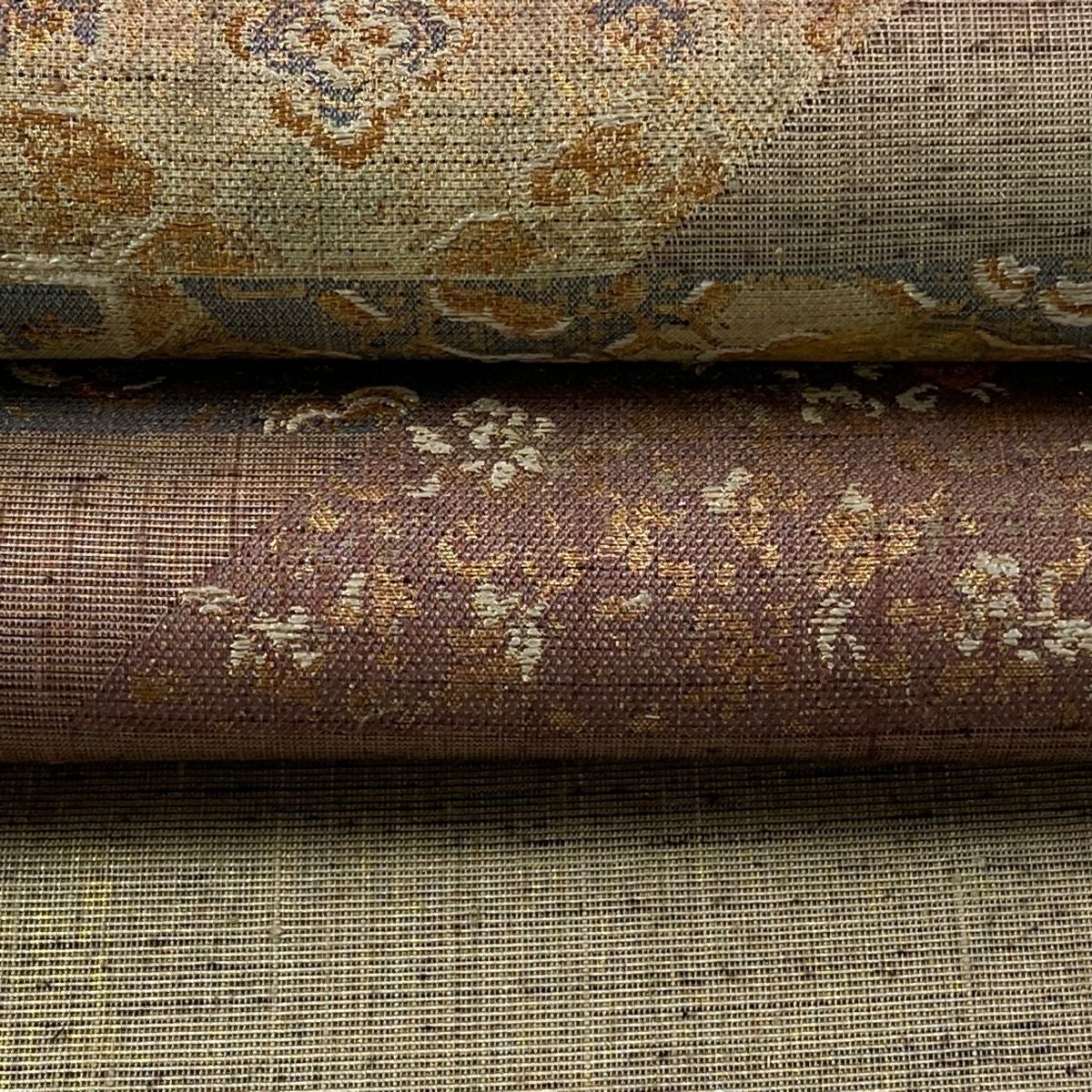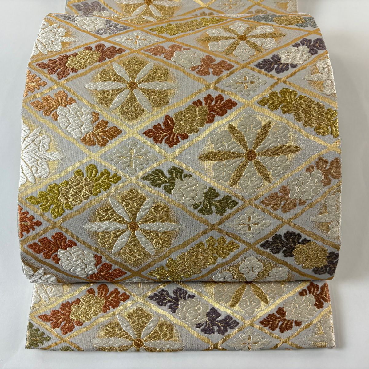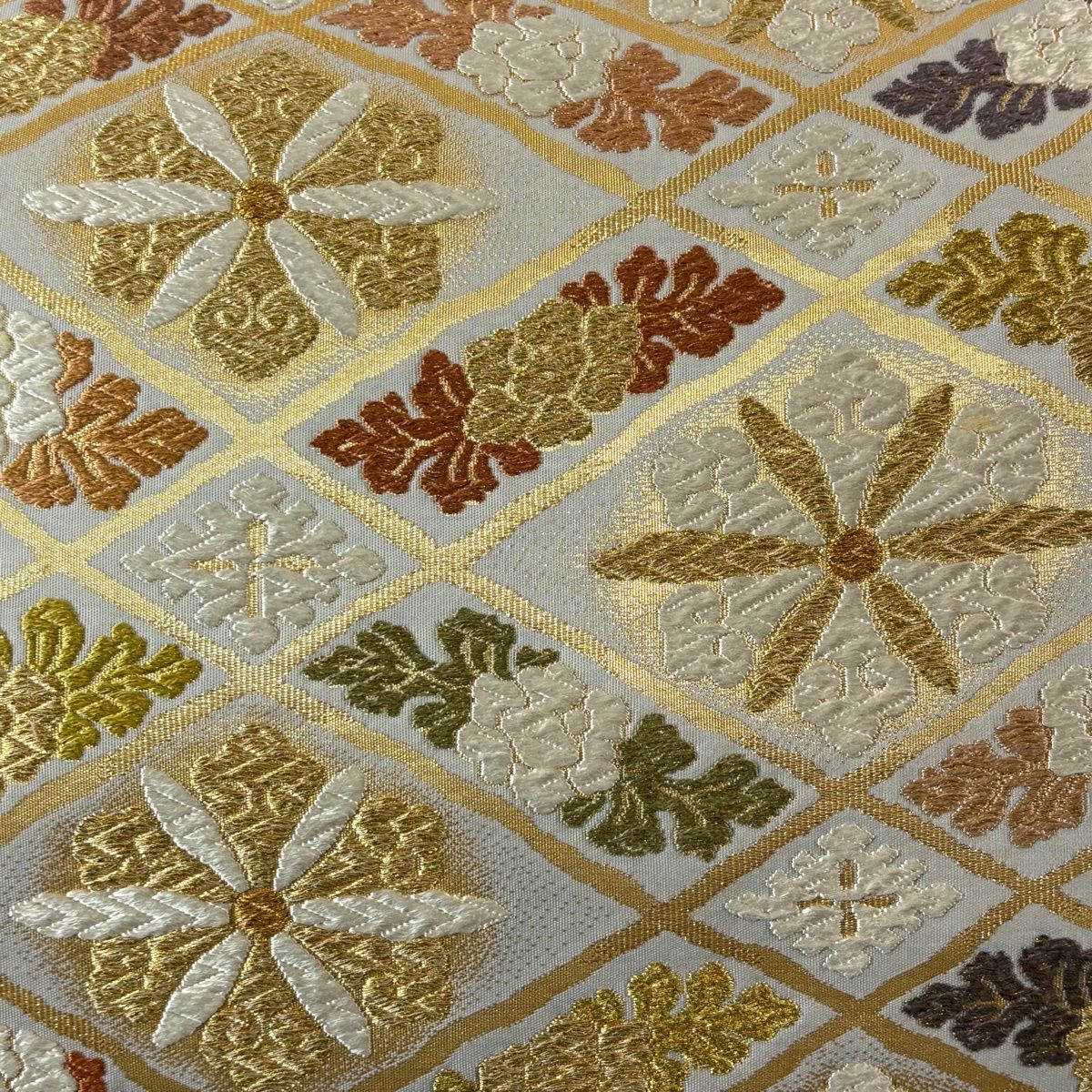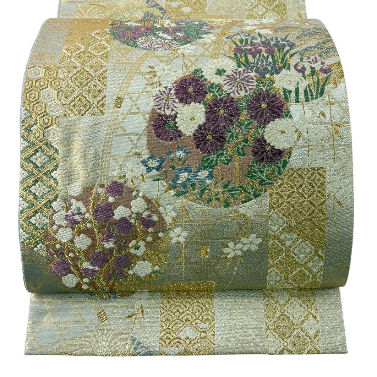 【美品】 袋帯 逸品 古代帝王紫 草花 有職文様 唐織 金糸 灰色 お太鼓柄 正絹