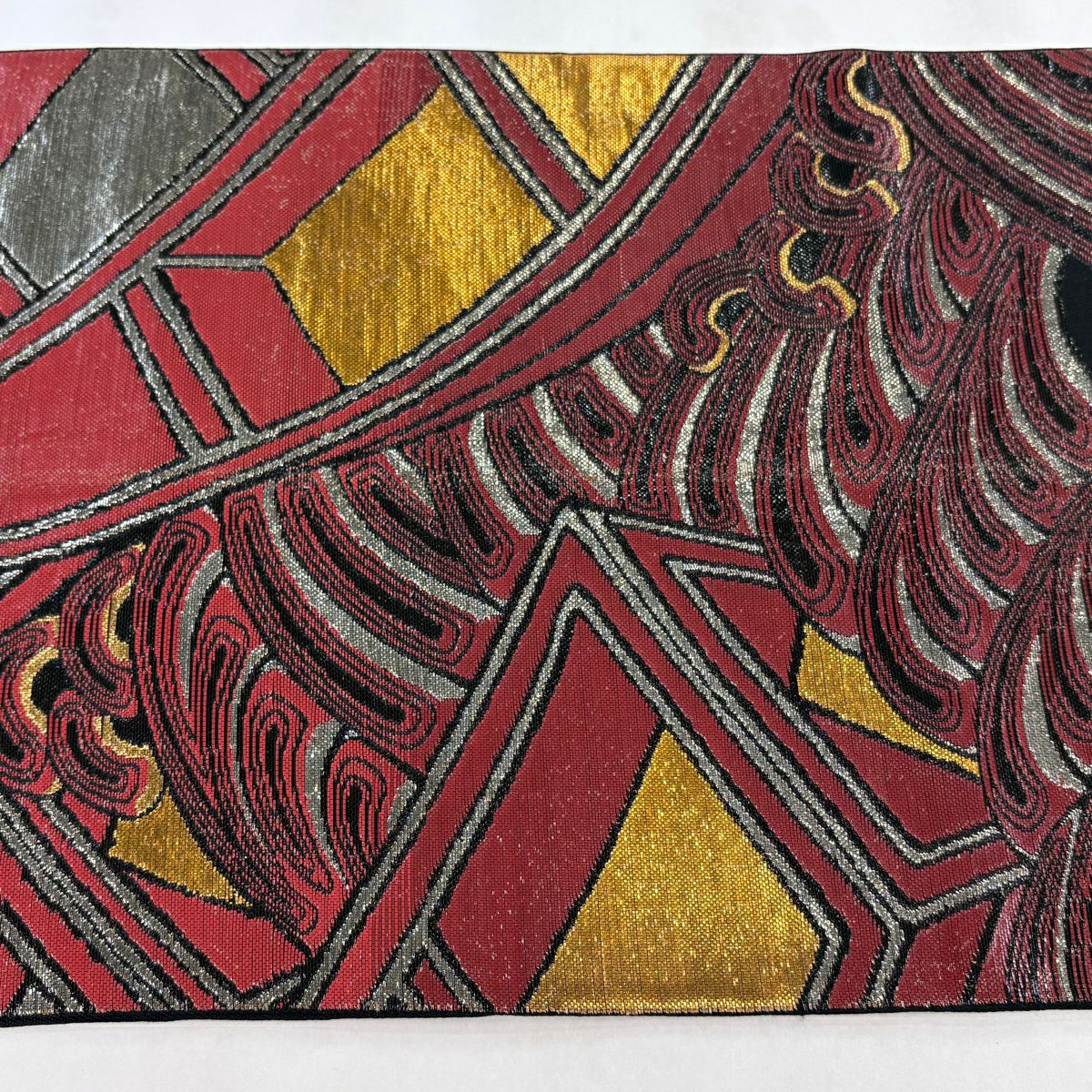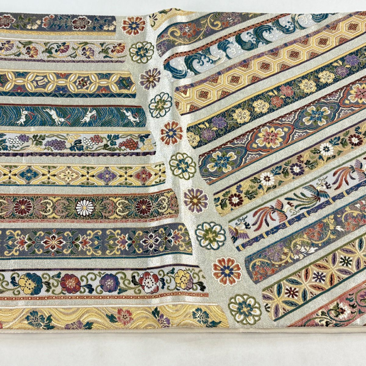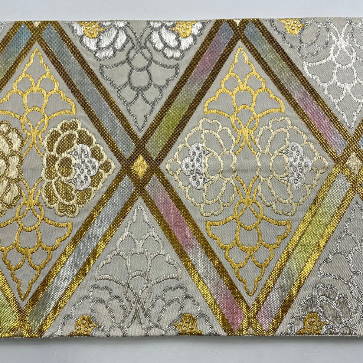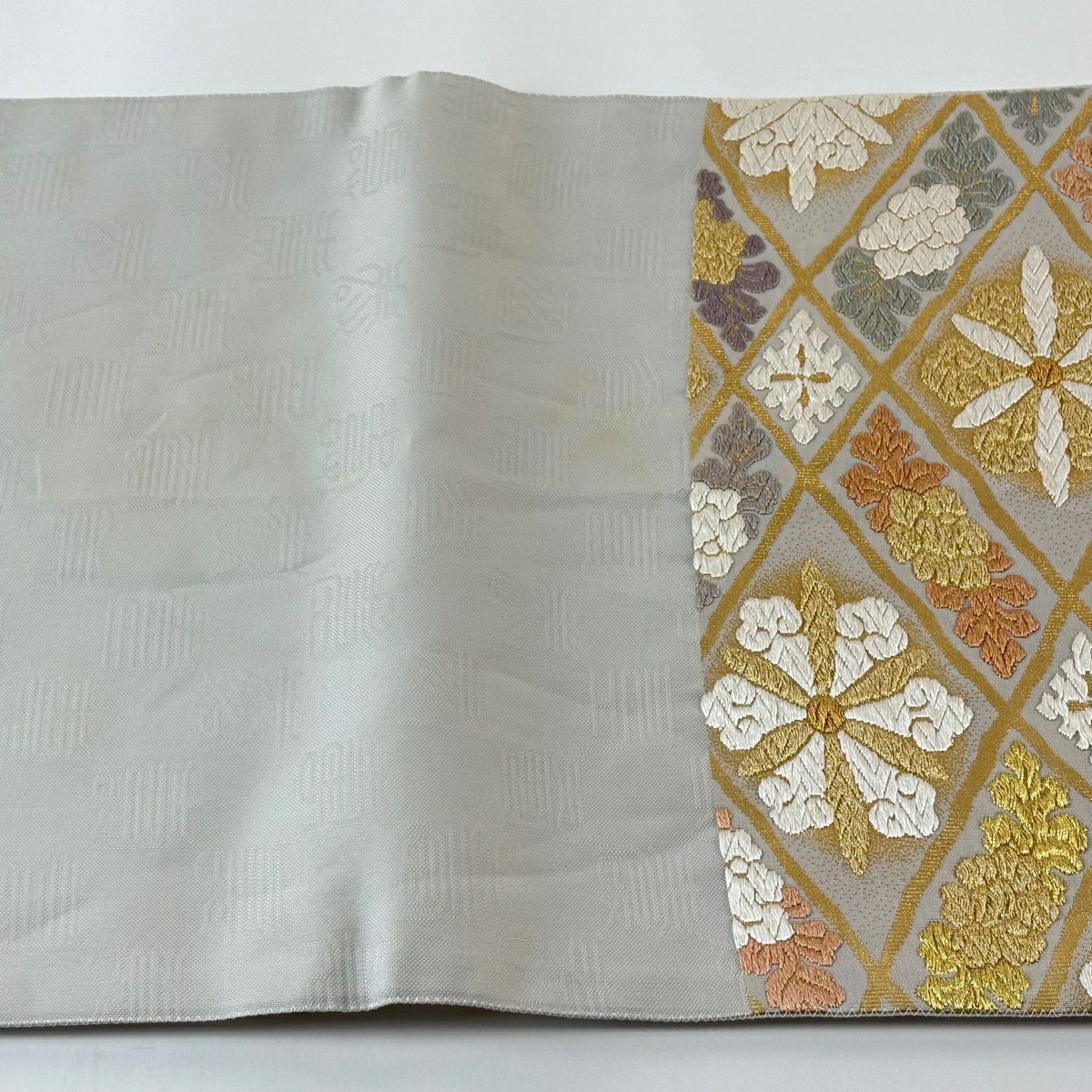 【美品】 開き名古屋帯 逸品 龍村美術織物 比翼仕立て 紅牙瑞錦 銀糸 灰色 正絹