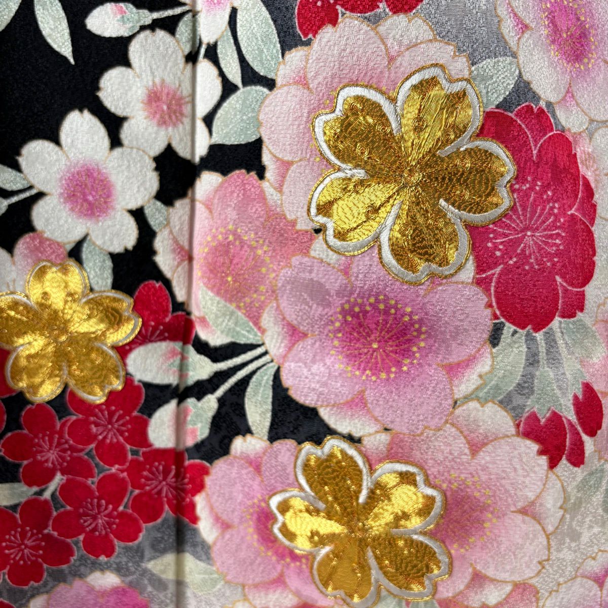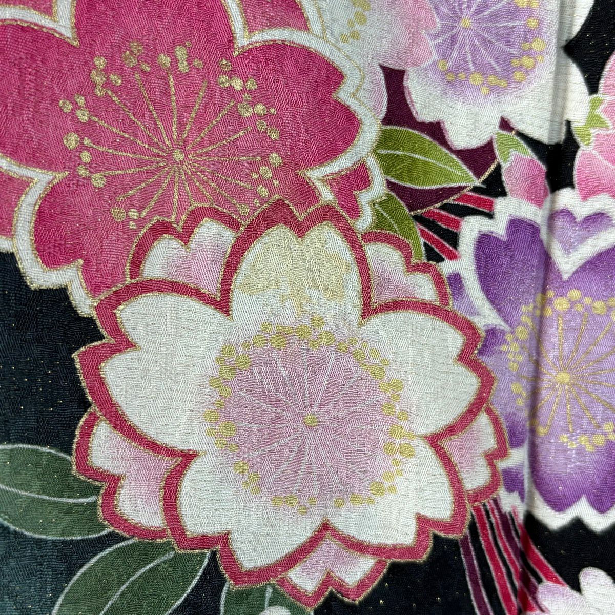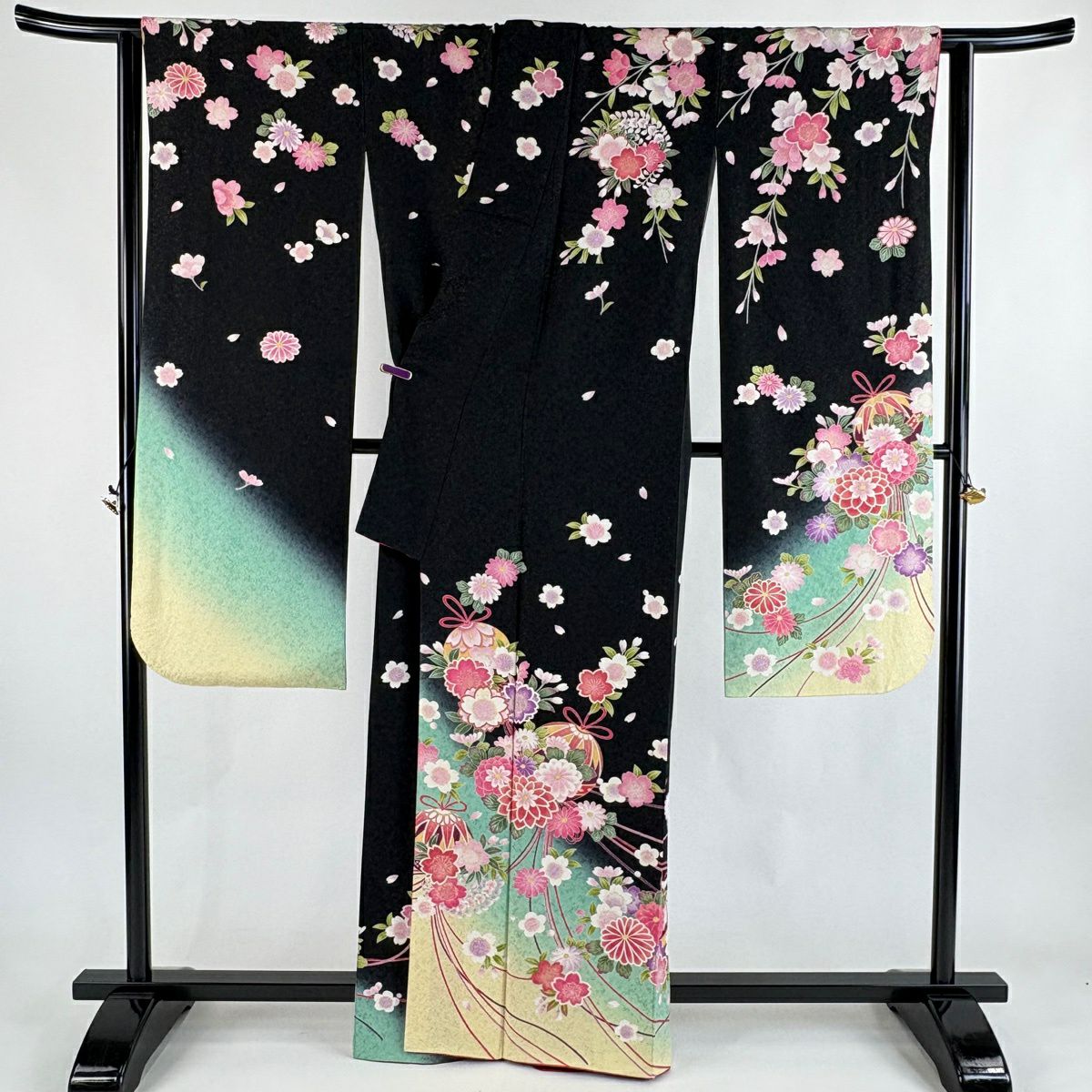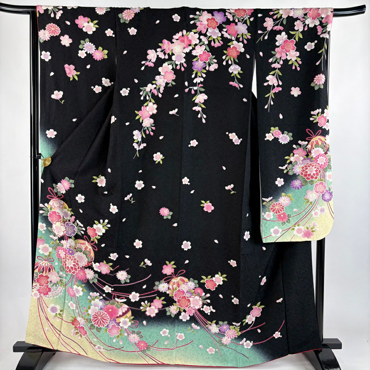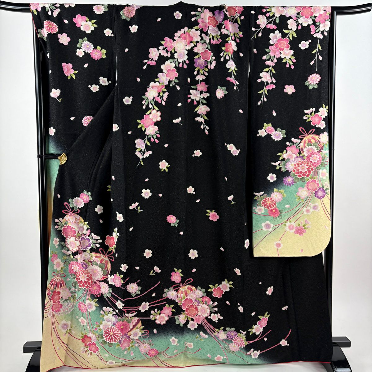振袖 身丈164cm 裄丈67.5cm L 袷 薬玉 桜 金通し 金彩 黒 正絹 逸品