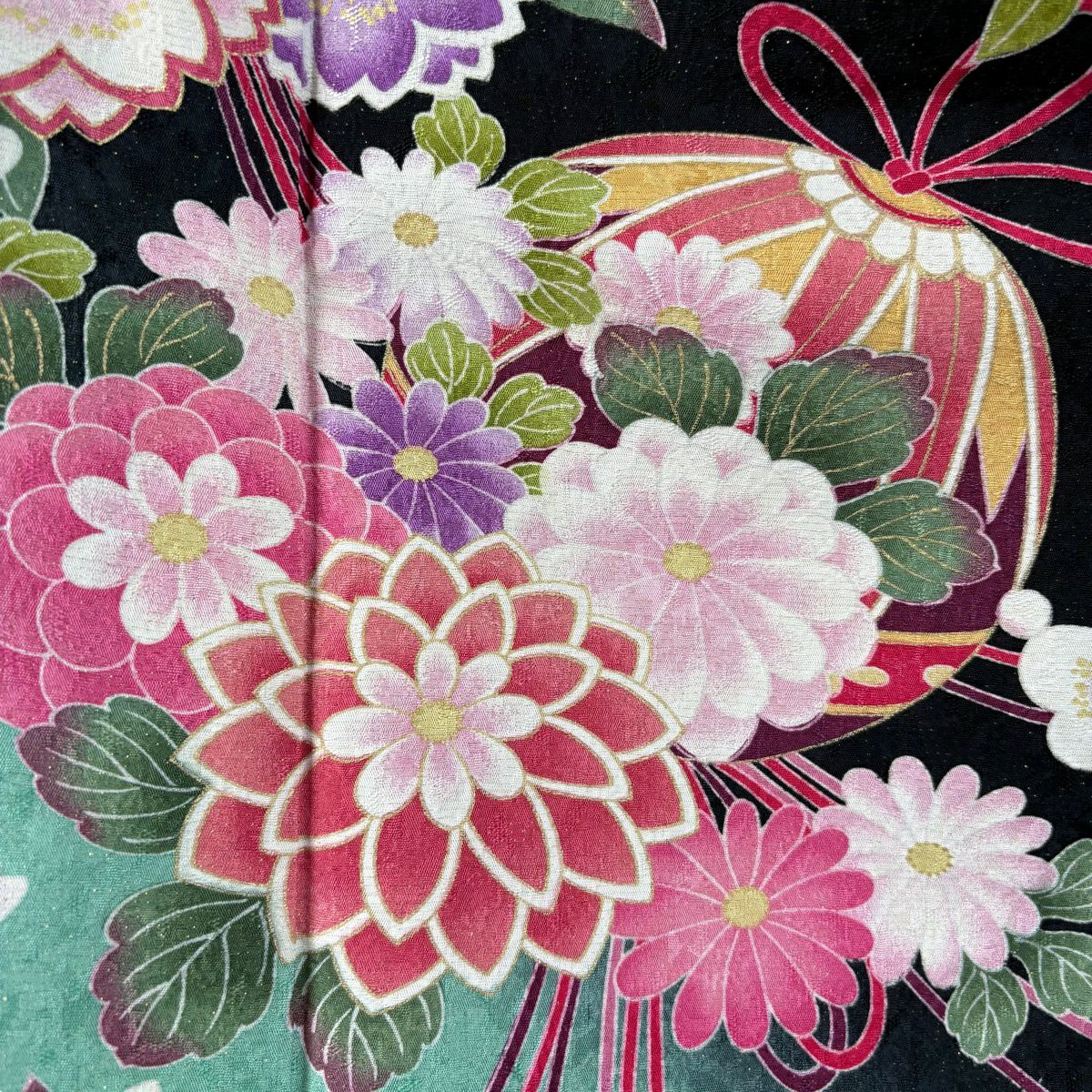 振袖 身丈167.5cm 裄丈69.5cm L 袷 薬玉 菊 金通し 金彩 黒 正絹 逸品