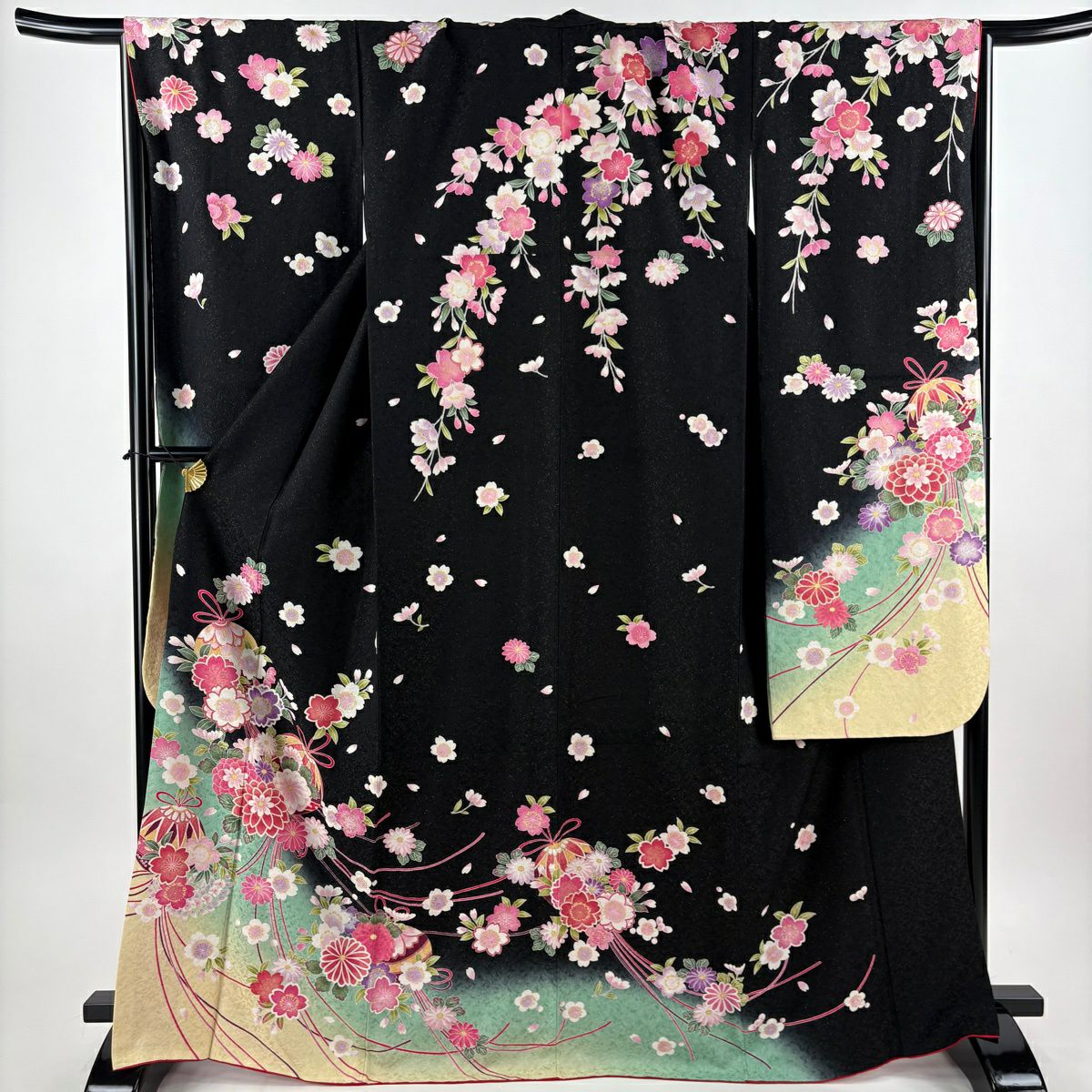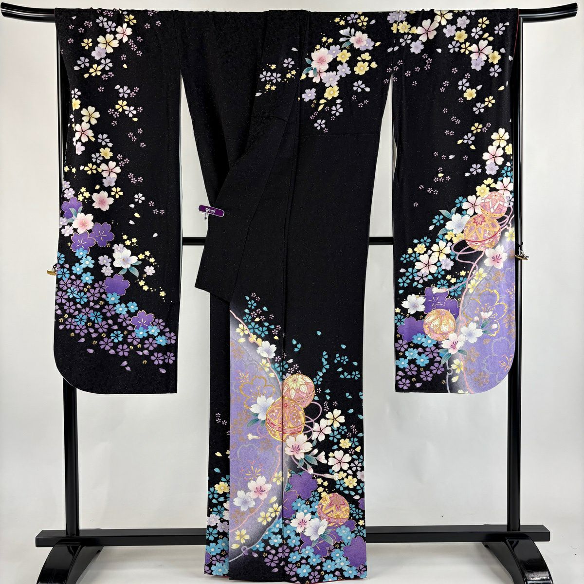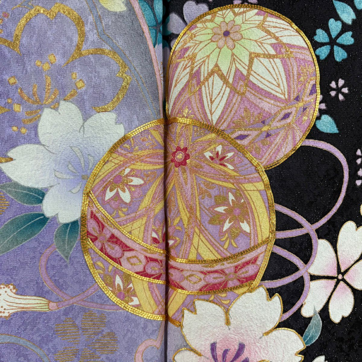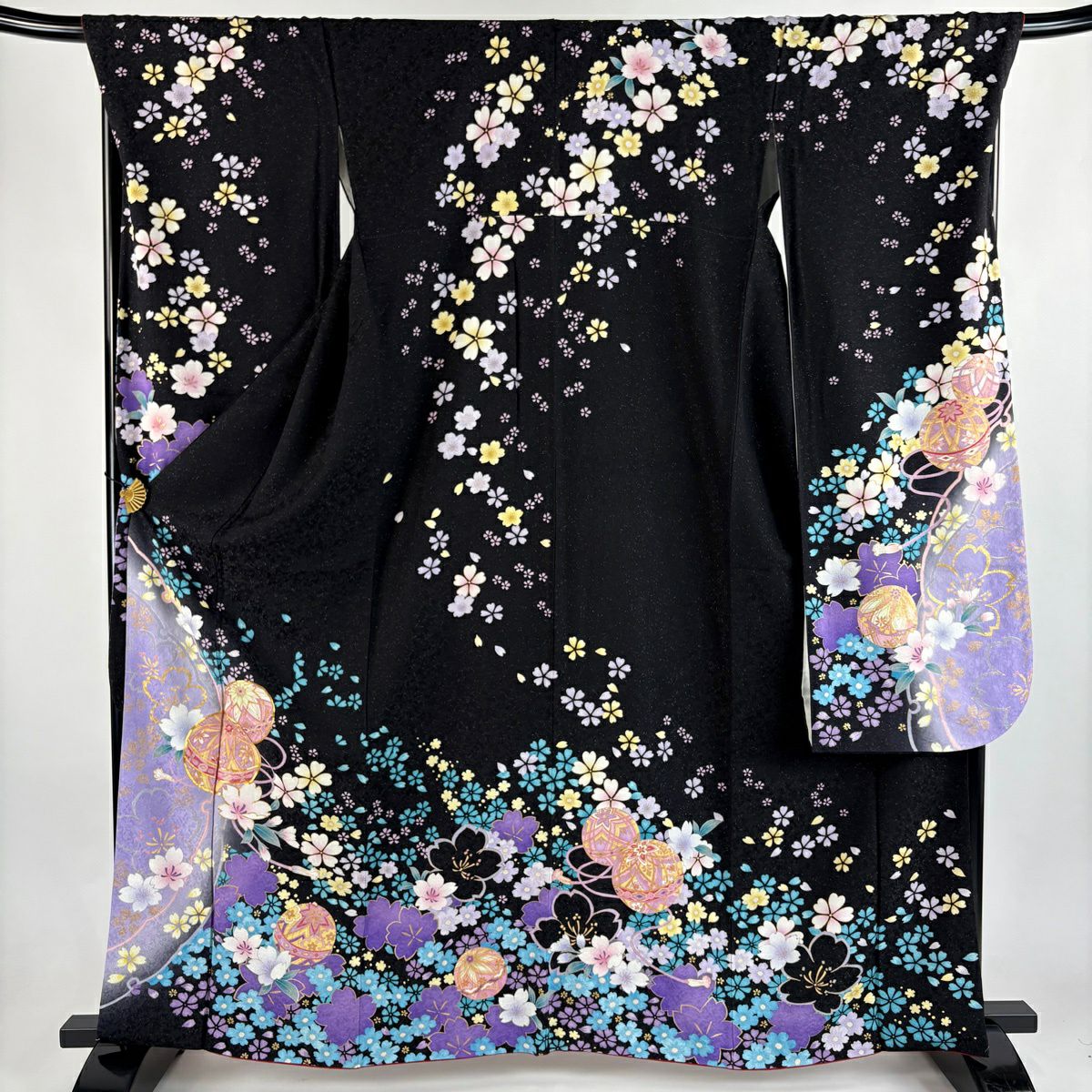 振袖 身丈163.5cm 裄丈71cm L 袷 手鞠 桜 銀通し 金糸 黒 正絹 逸品