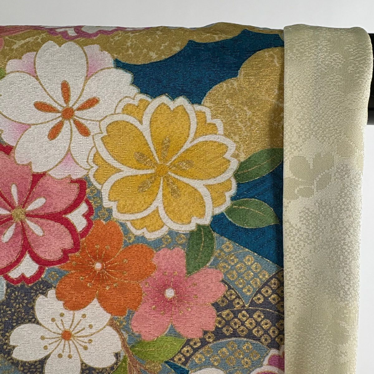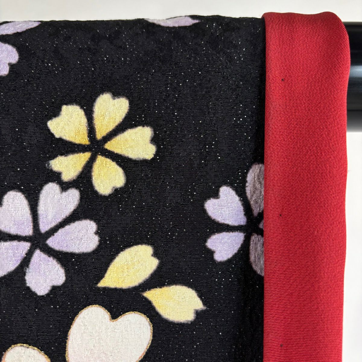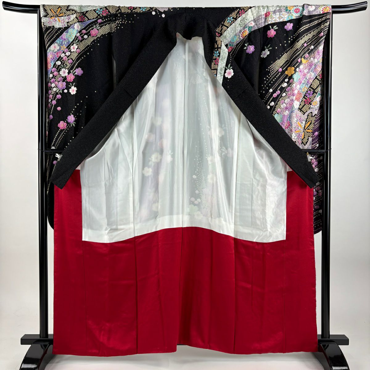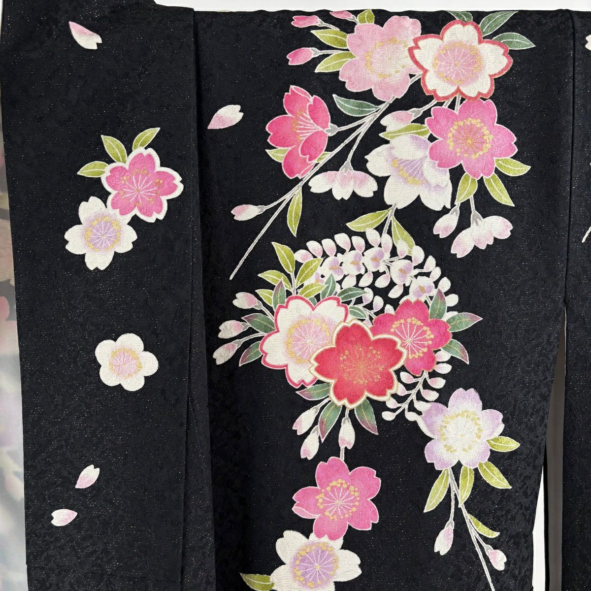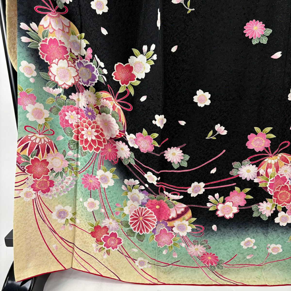 振袖 身丈163.5cm 裄丈71cm L 袷 手鞠 桜 銀通し 金糸 黒 正絹 逸品