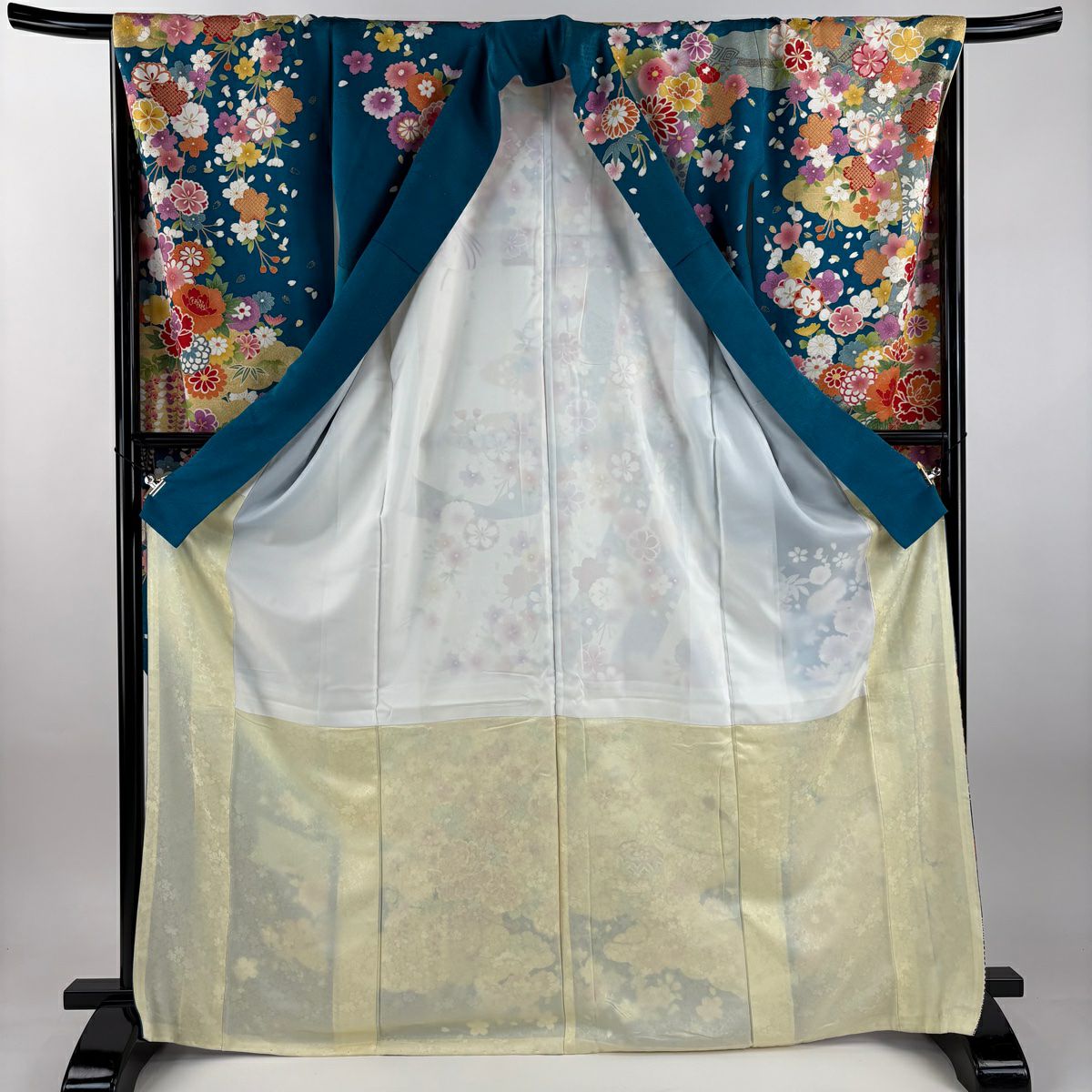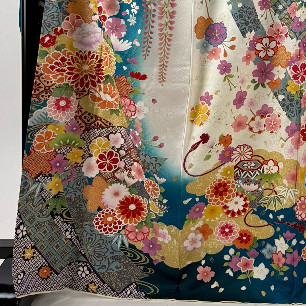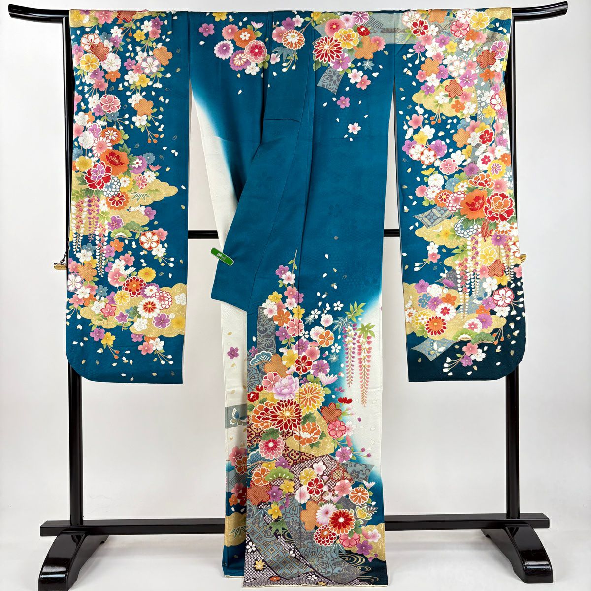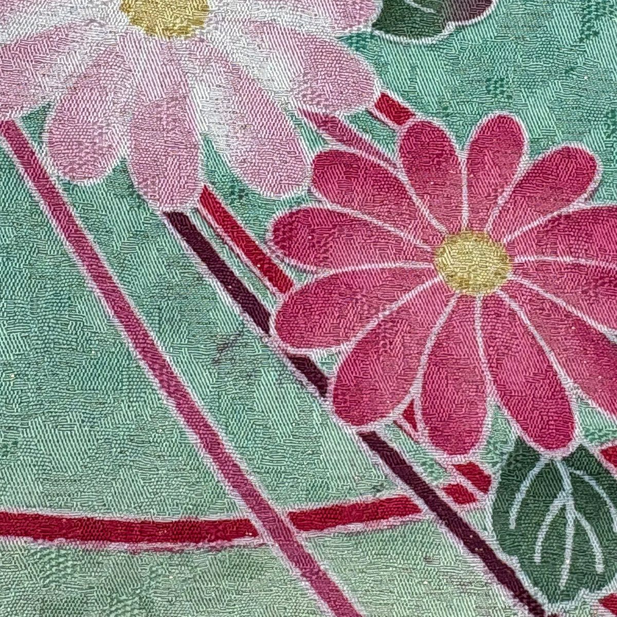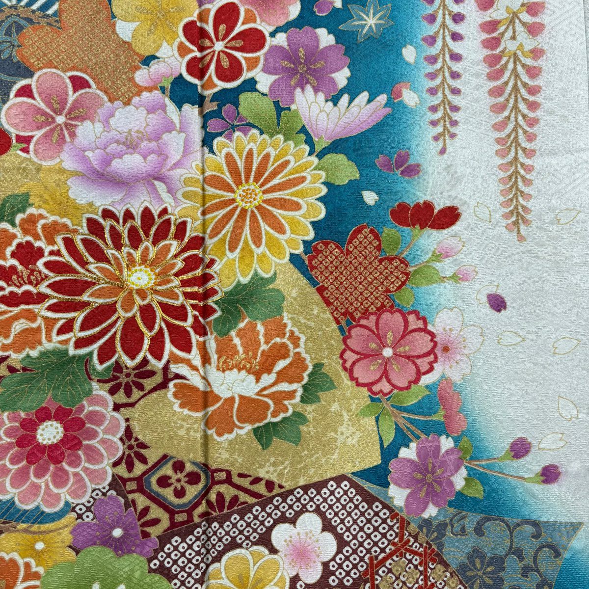 振袖 身丈171cm 裄丈70cm L 袷 草花 熨斗 銀通し 刺繍 青緑 正絹 逸品