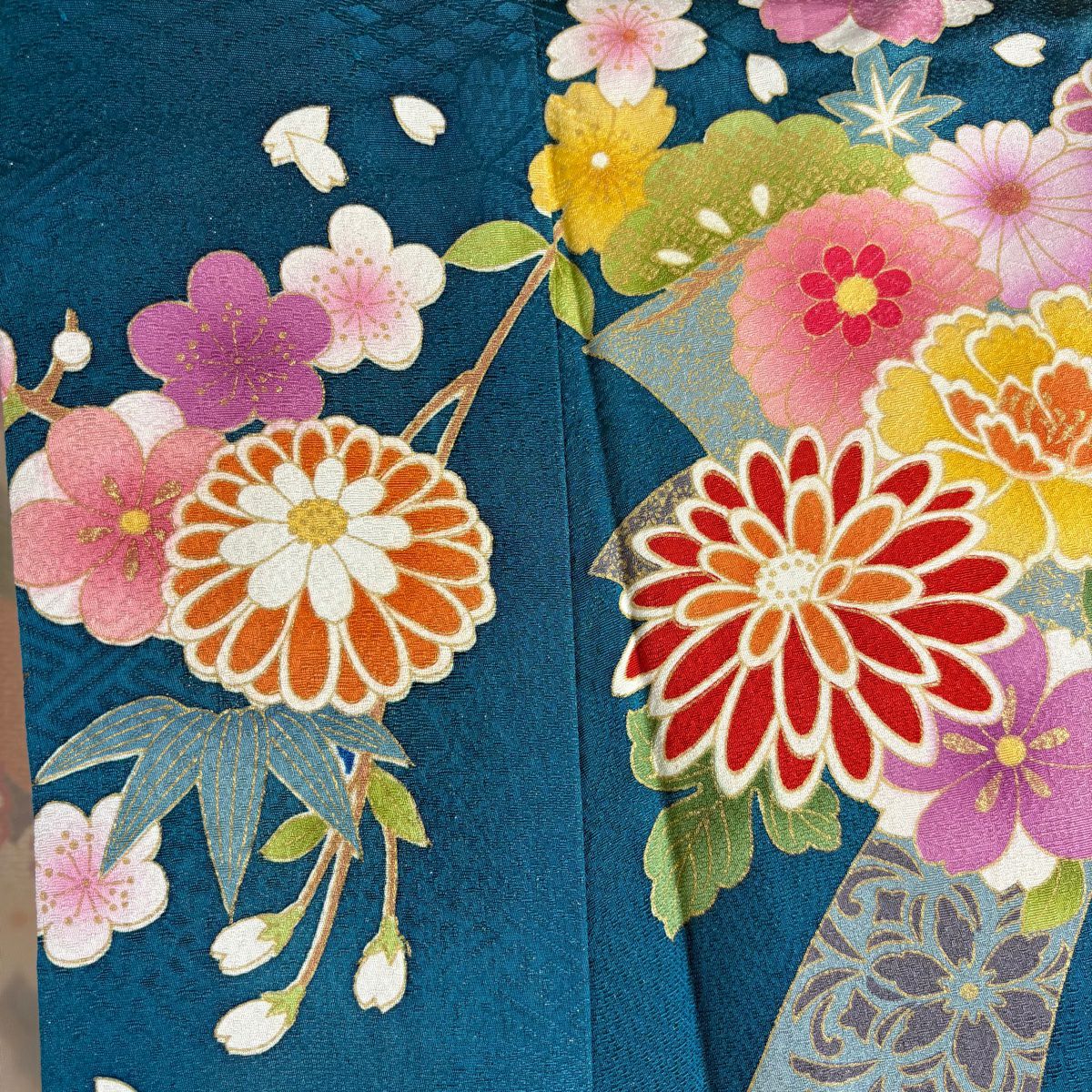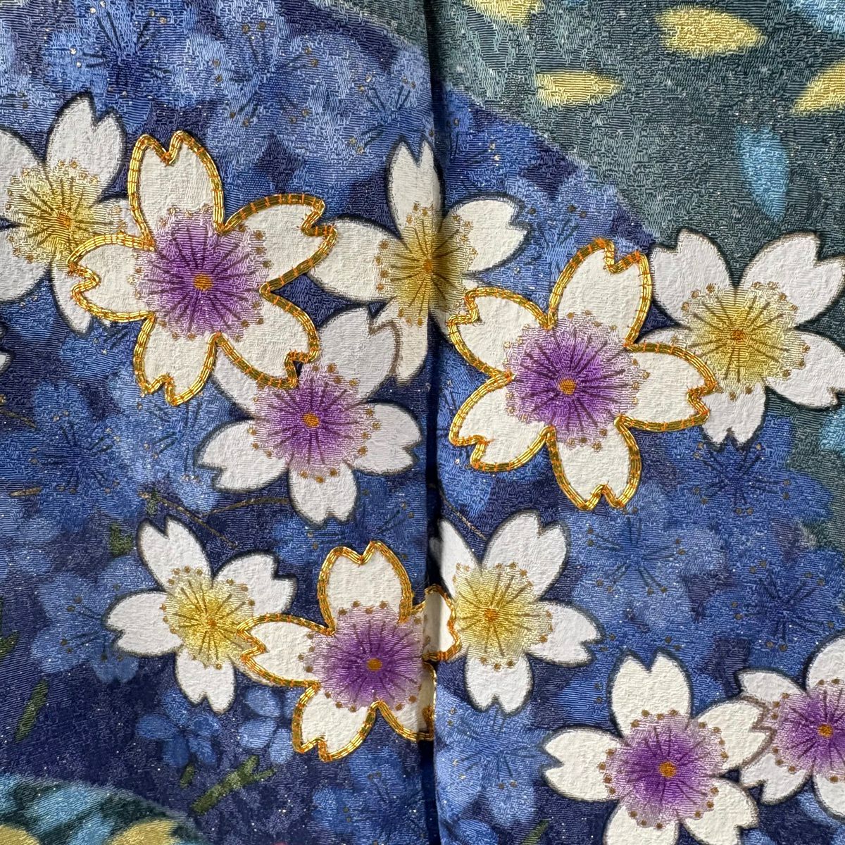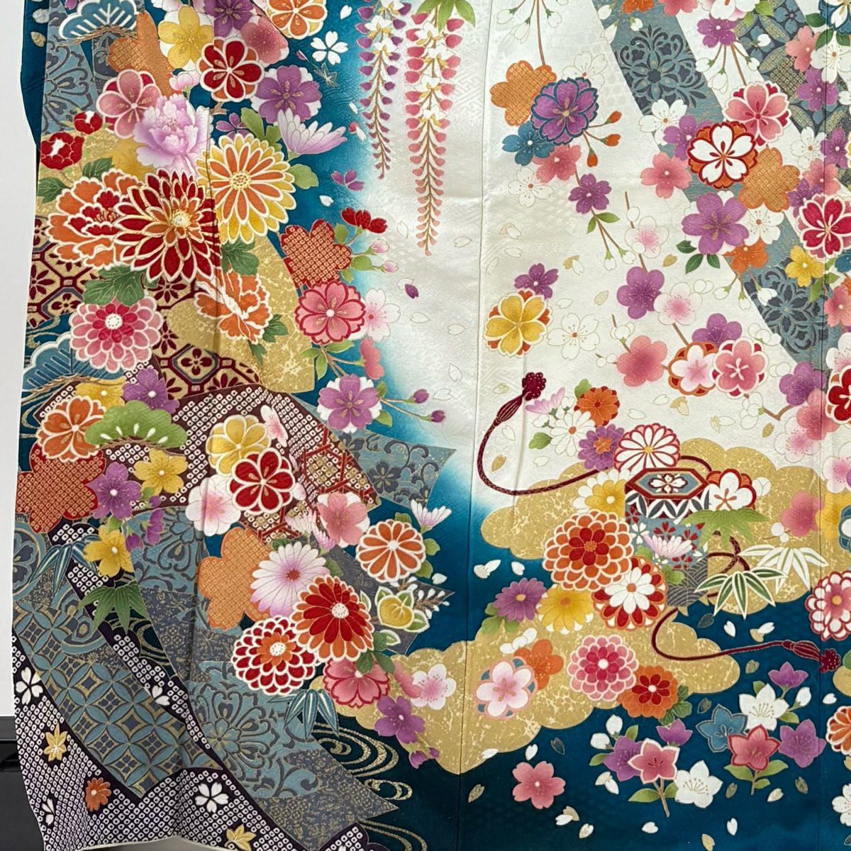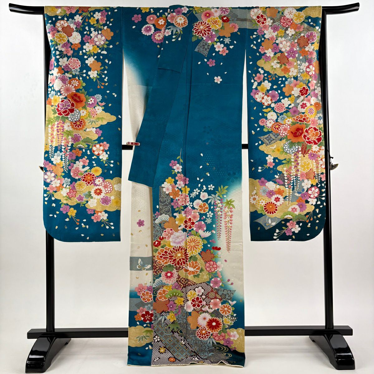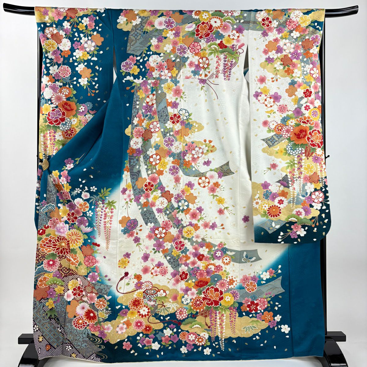 振袖 身丈171cm 裄丈70cm L 袷 草花 熨斗 銀通し 刺繍 青緑 正絹 逸品