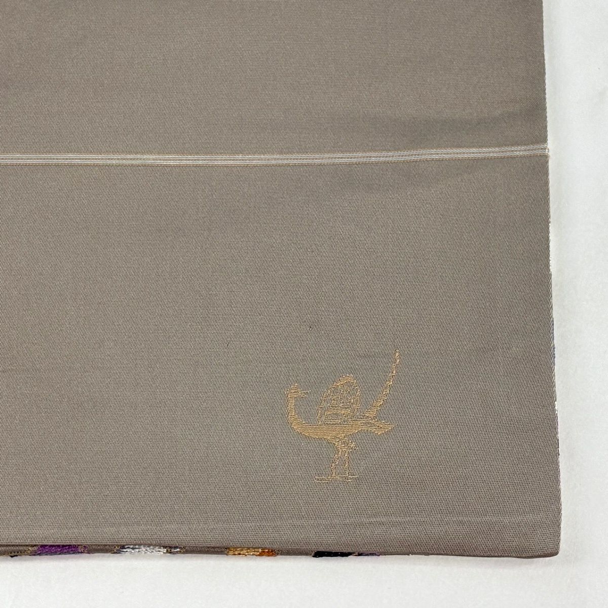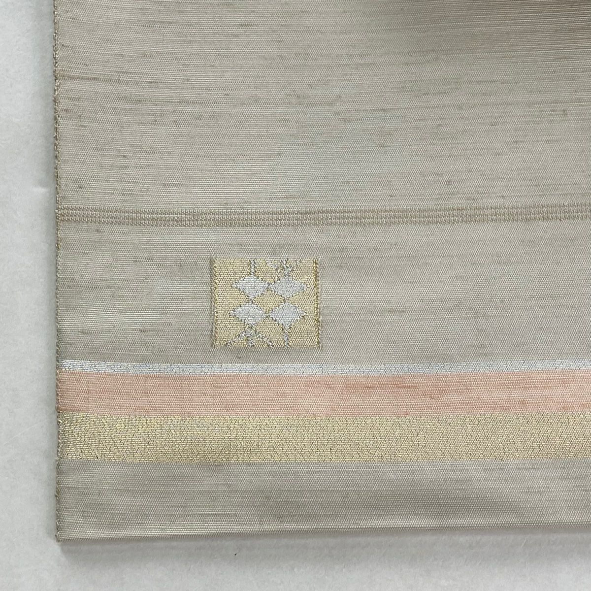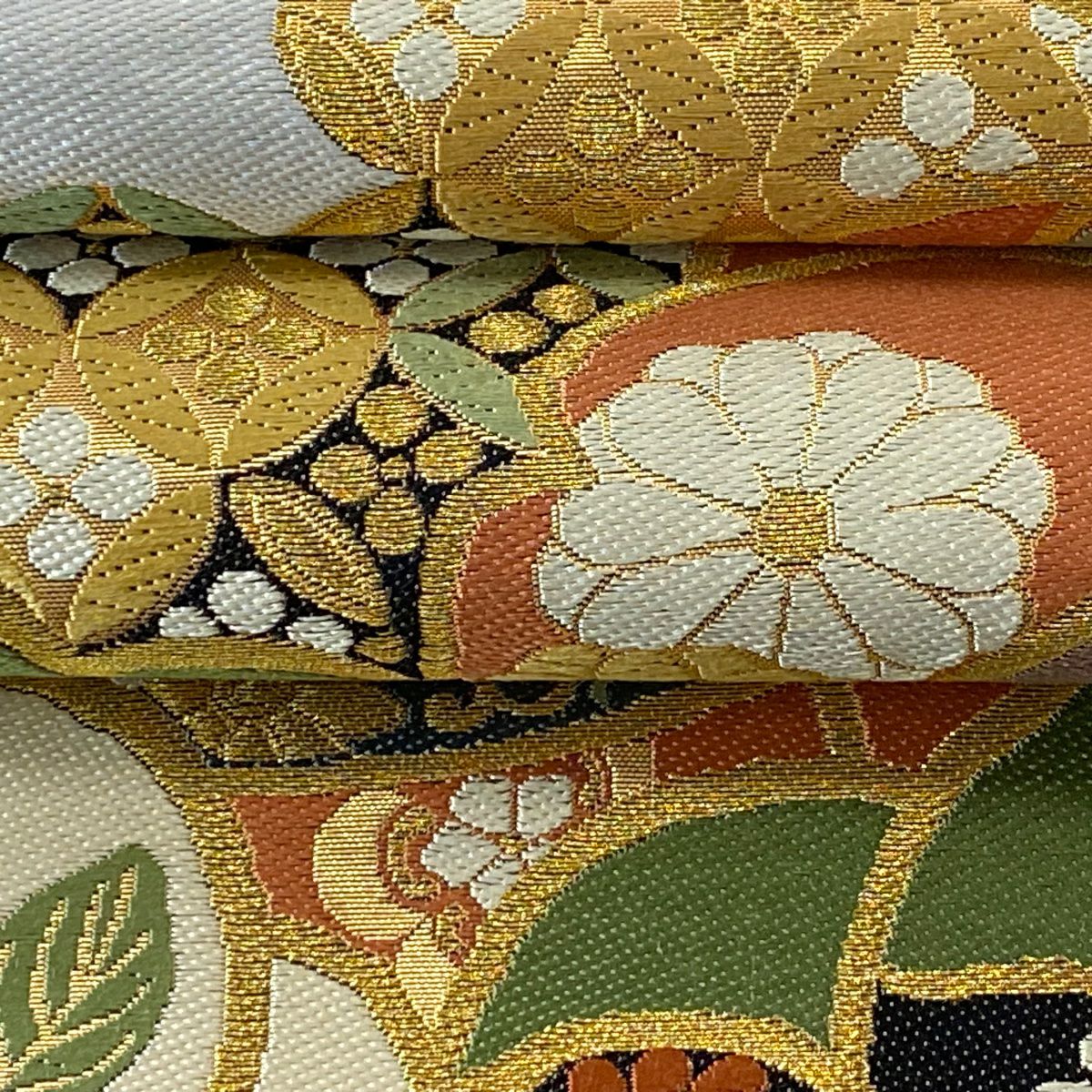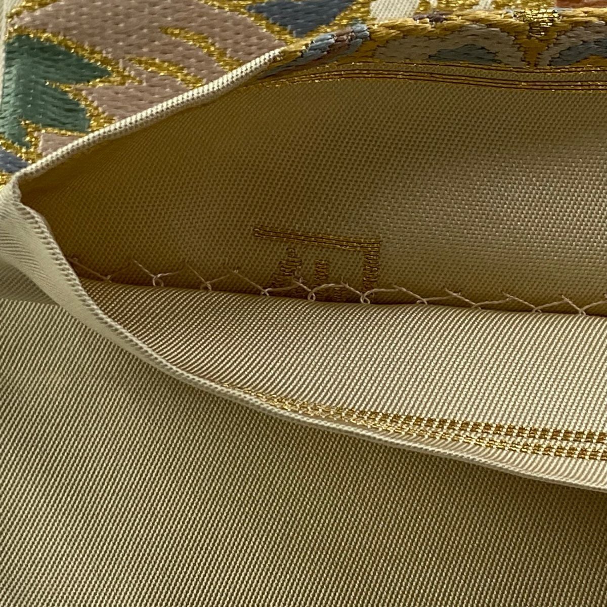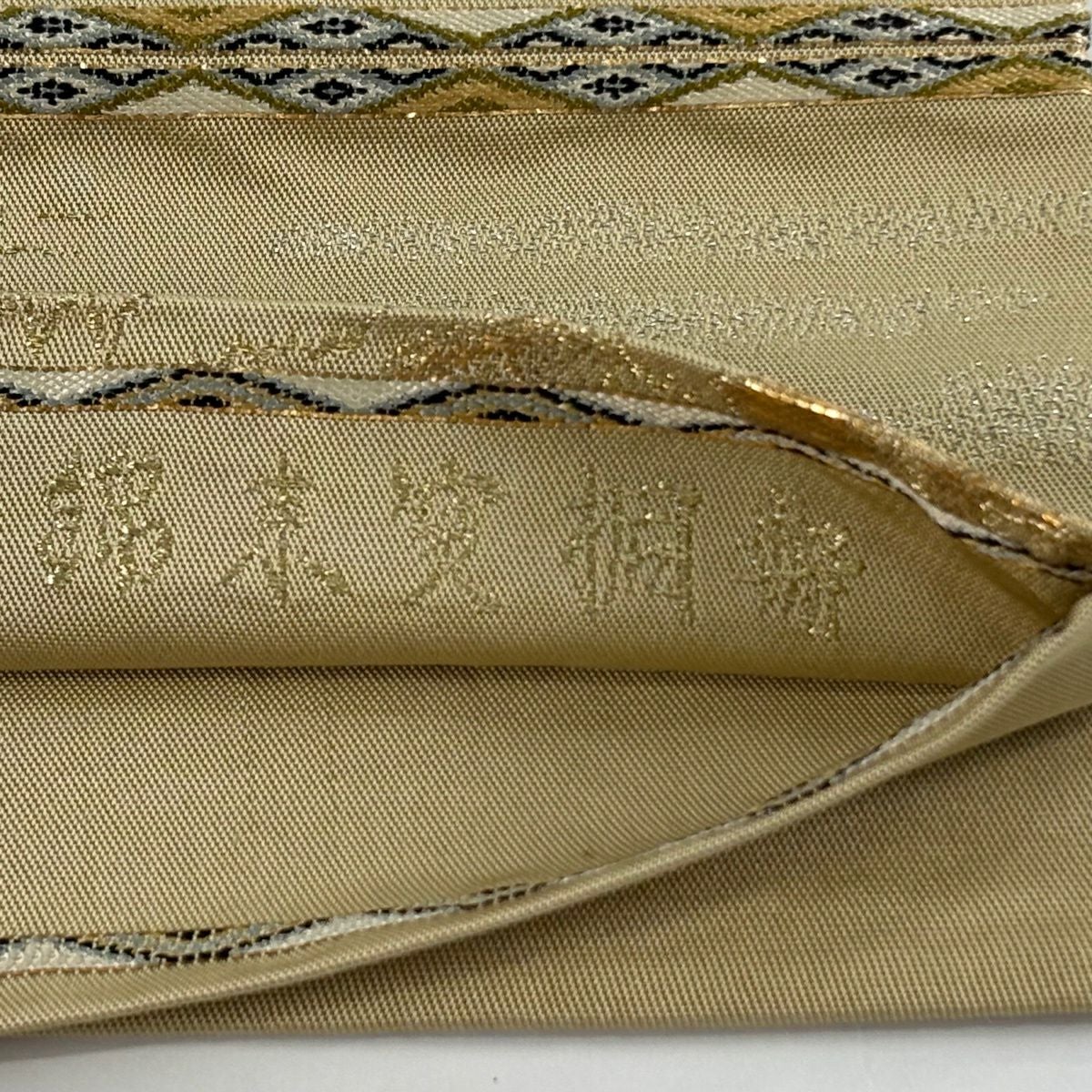 袋帯 逸品 龍村平蔵 落款あり 幾何学模様 金銀糸 箔 ベージュ お太鼓柄 正絹