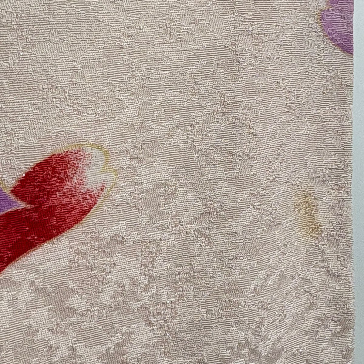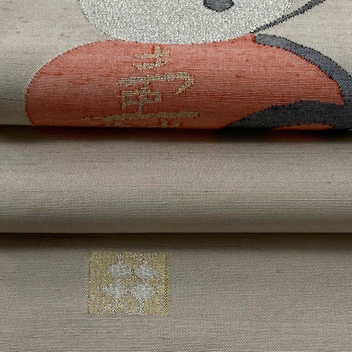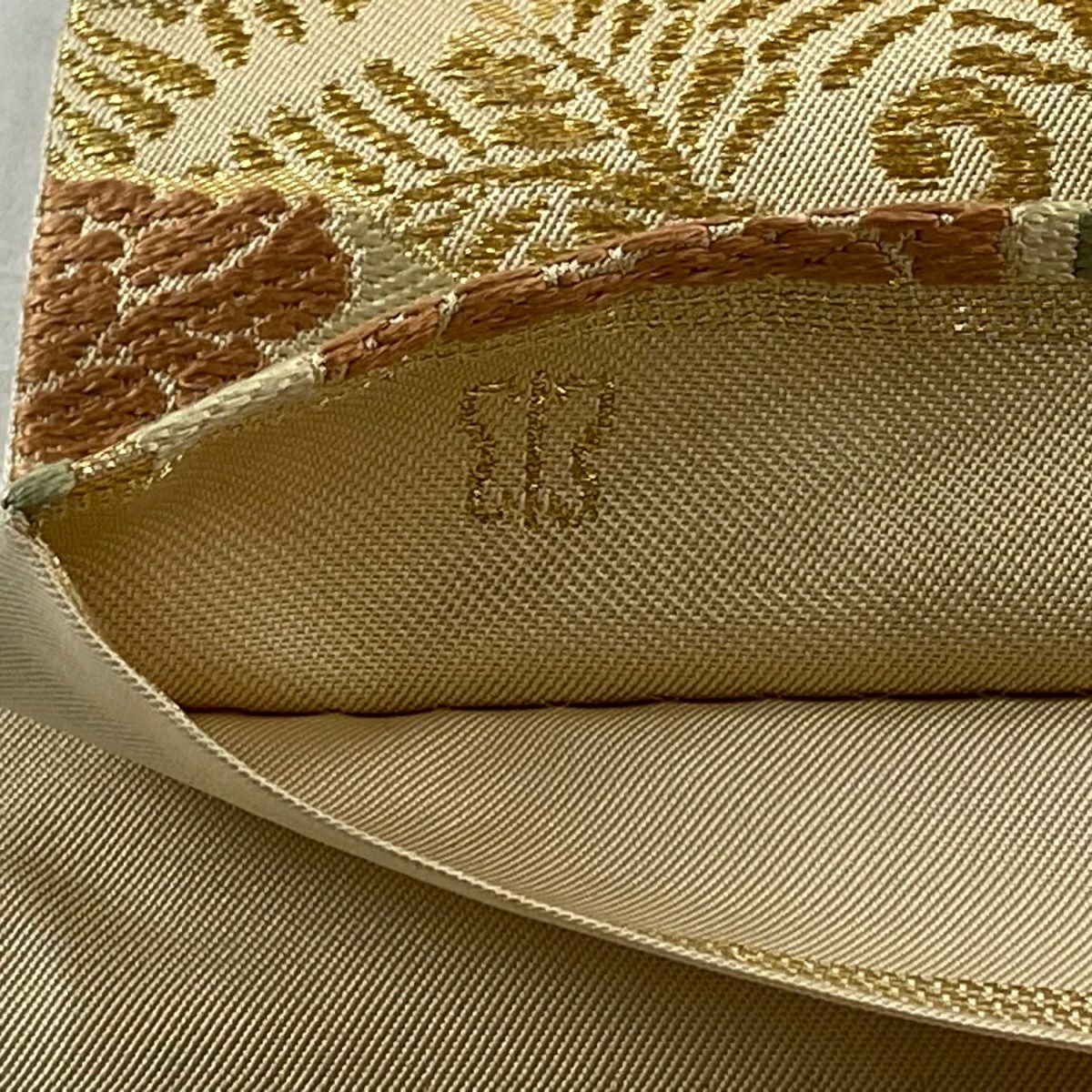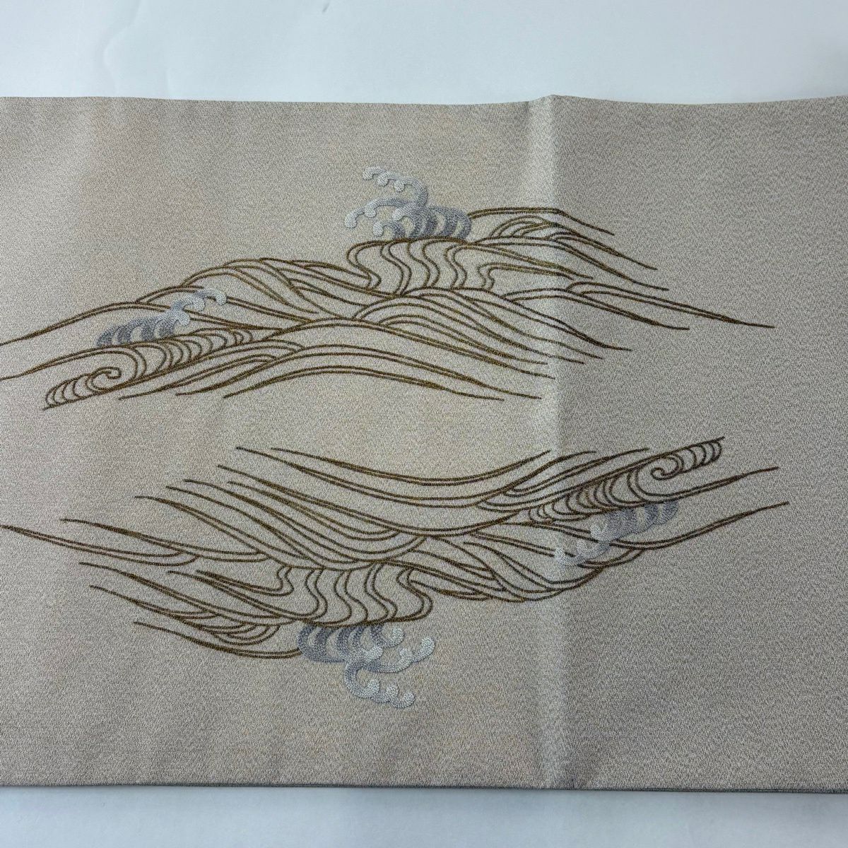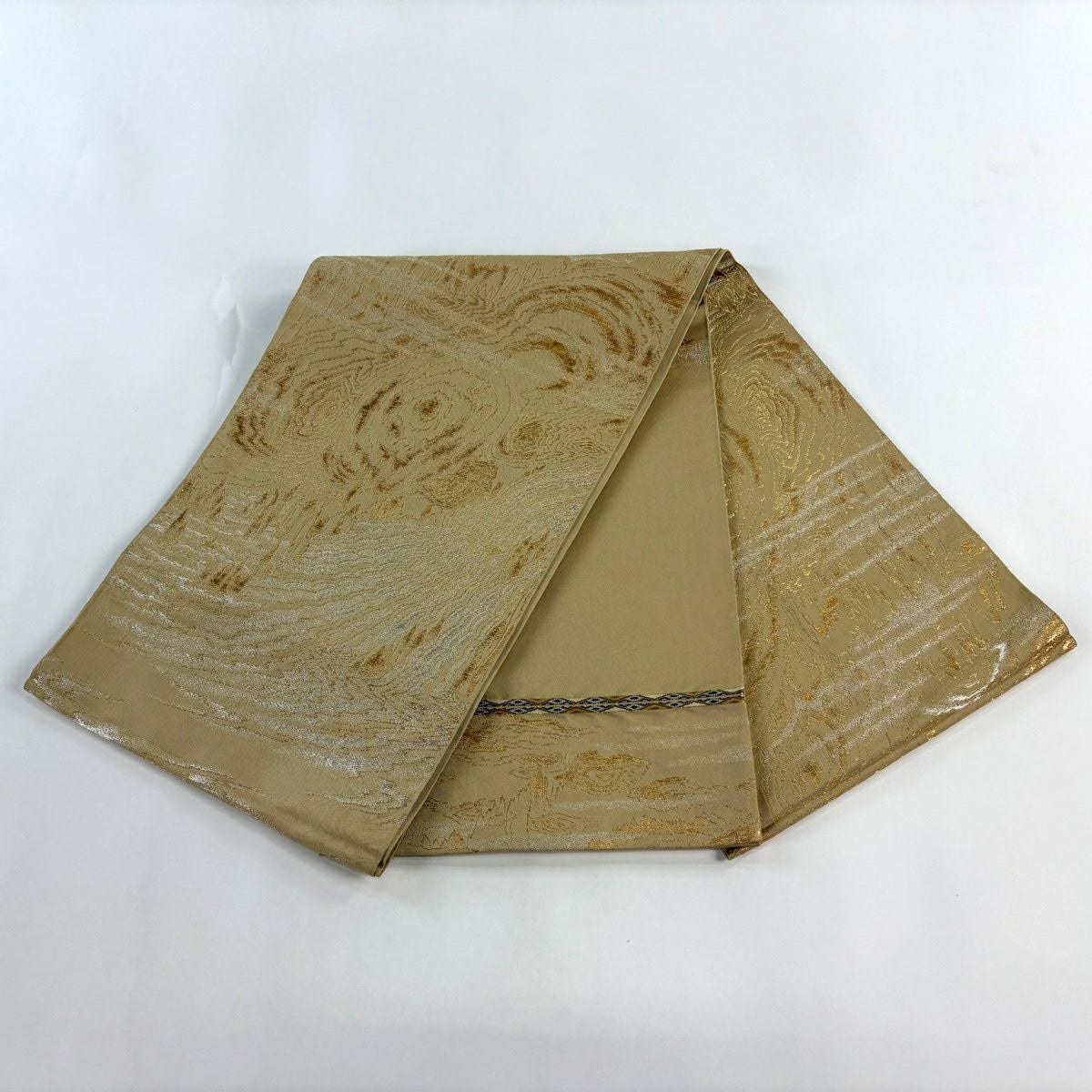 袋帯 逸品 龍村平蔵 落款あり 幾何学模様 金銀糸 箔 ベージュ お太鼓柄 正絹