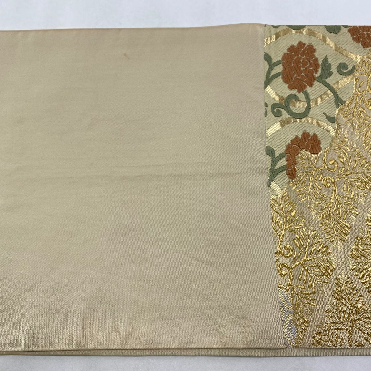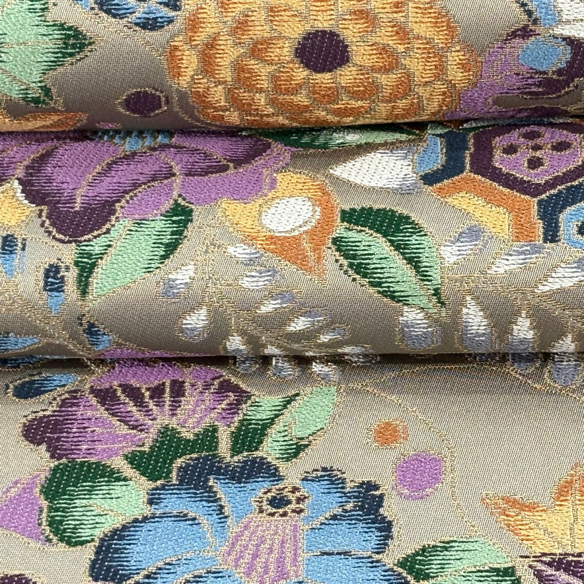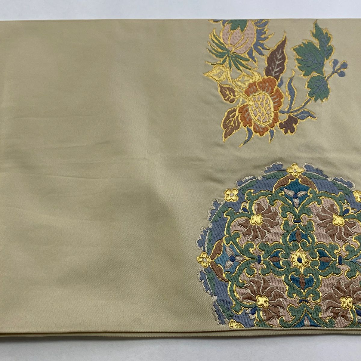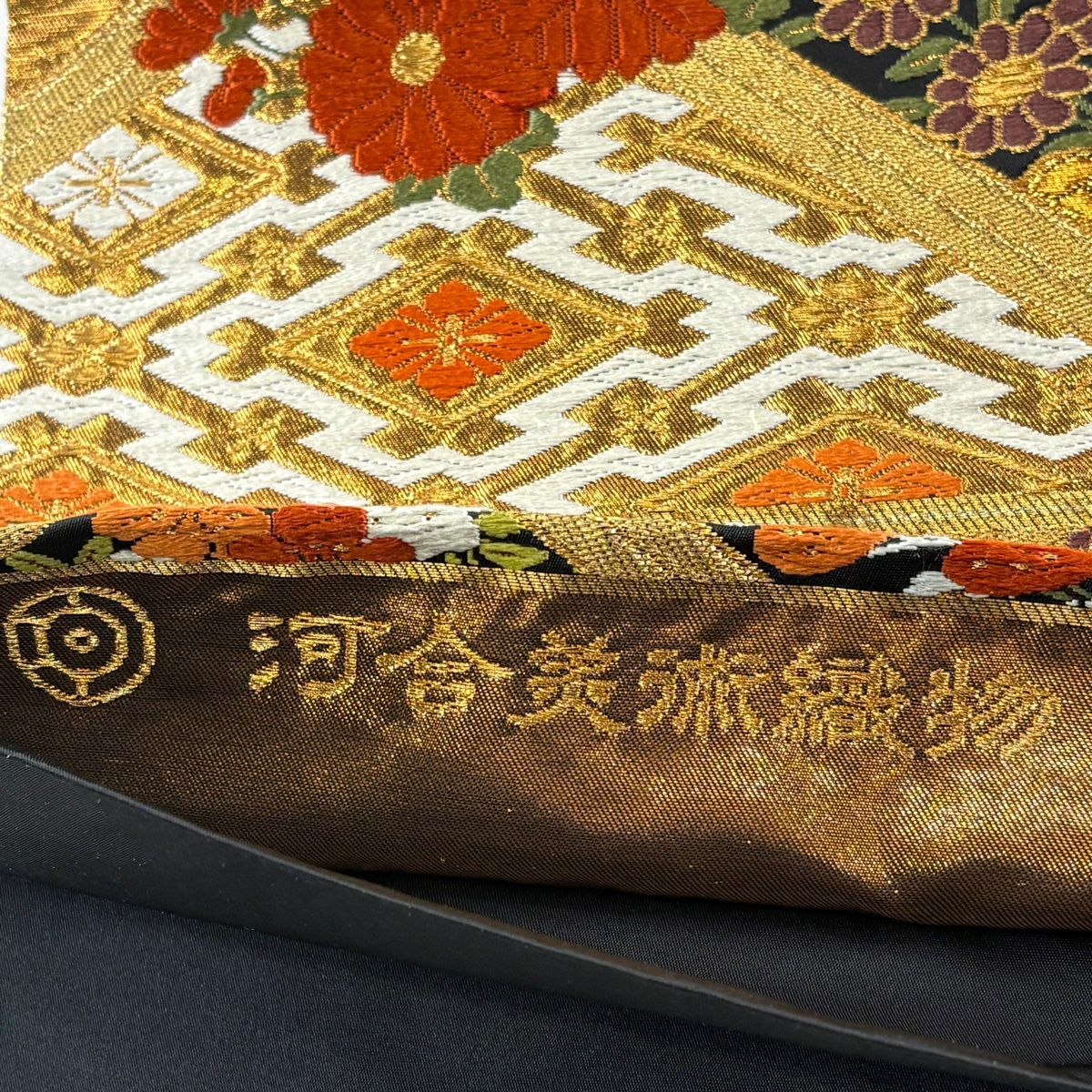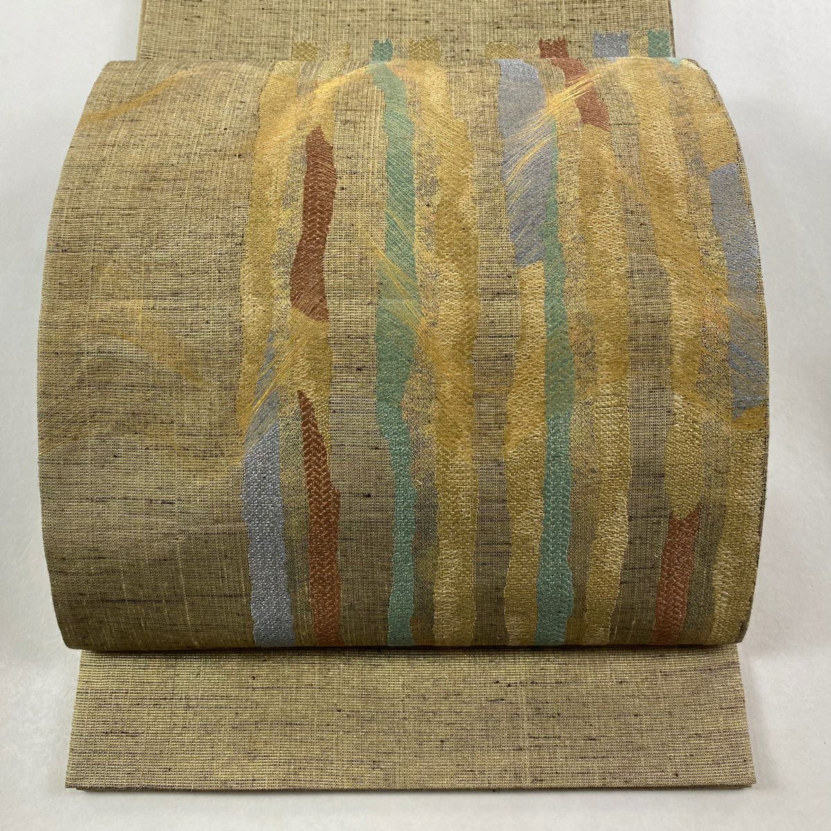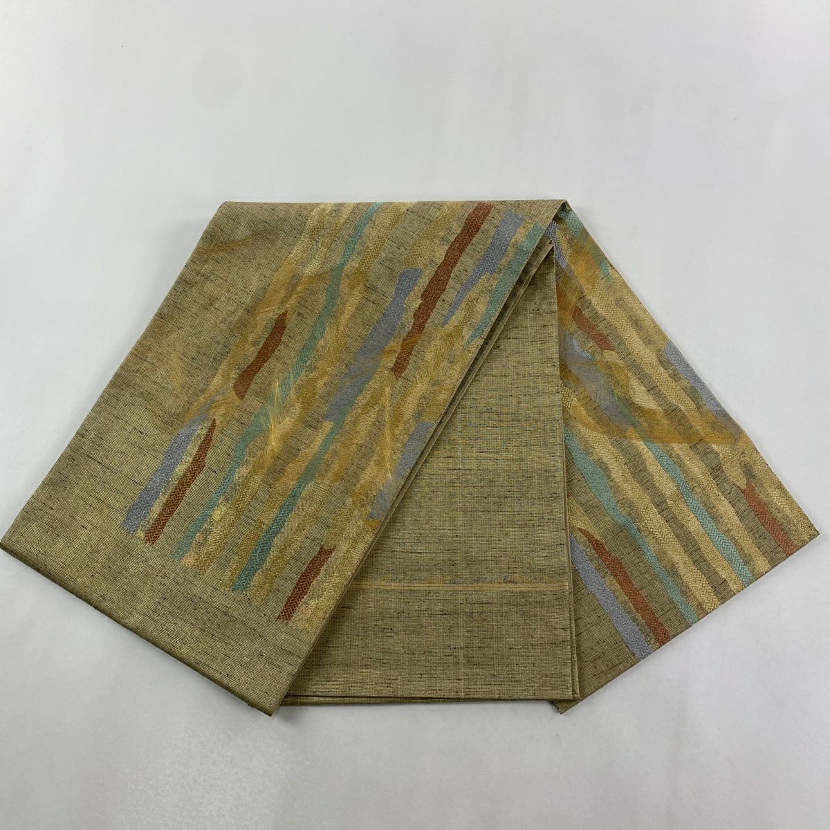 袋帯 逸品 龍村平蔵 落款あり 幾何学模様 金銀糸 箔 ベージュ お太鼓柄 正絹