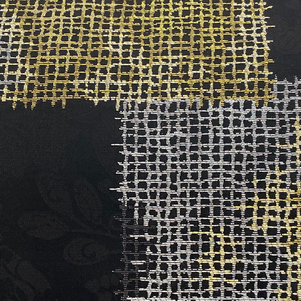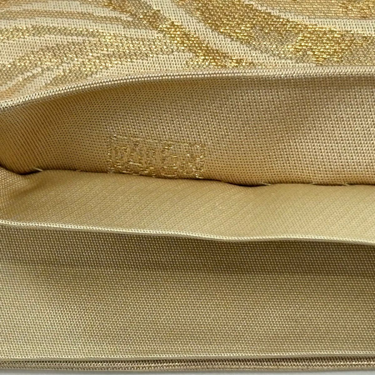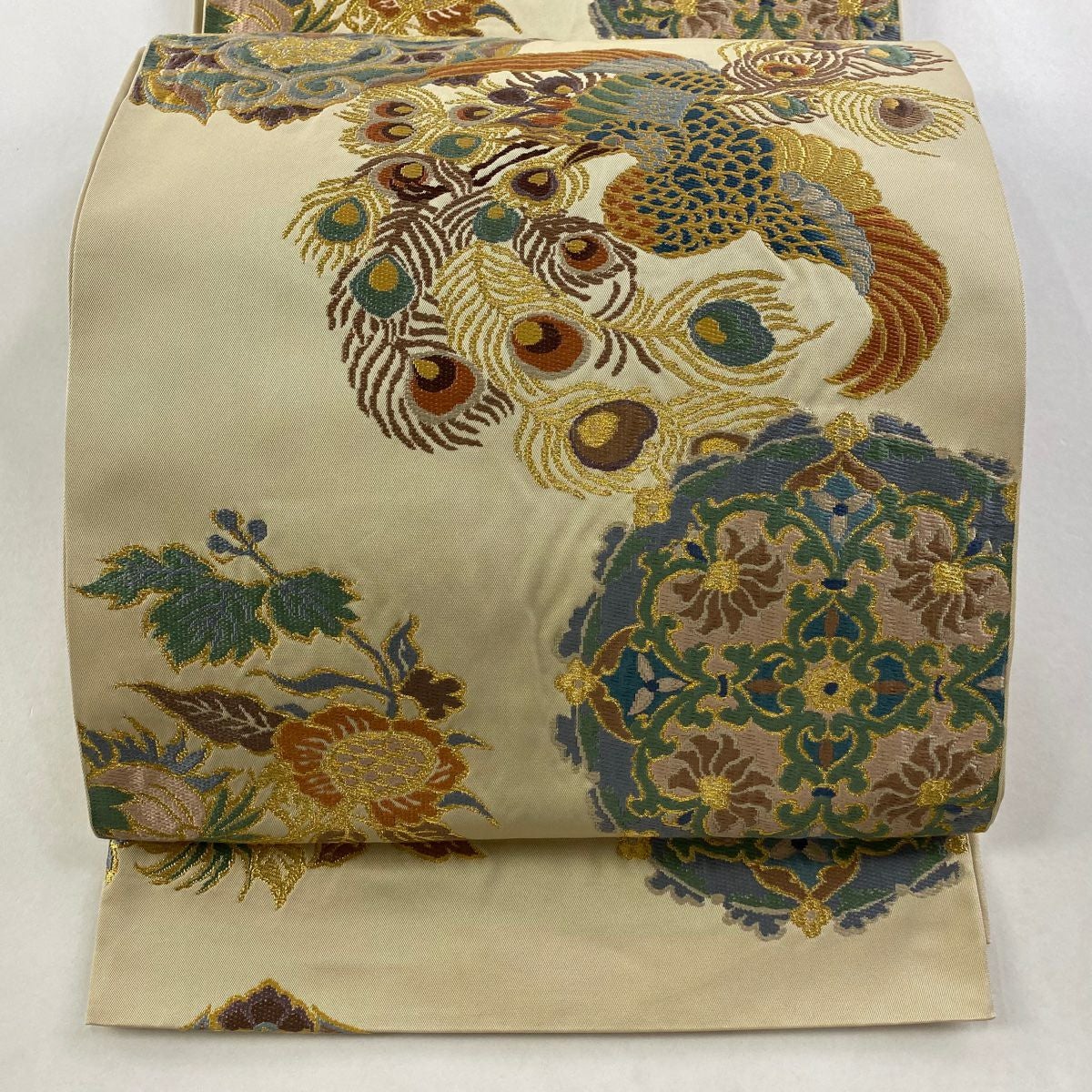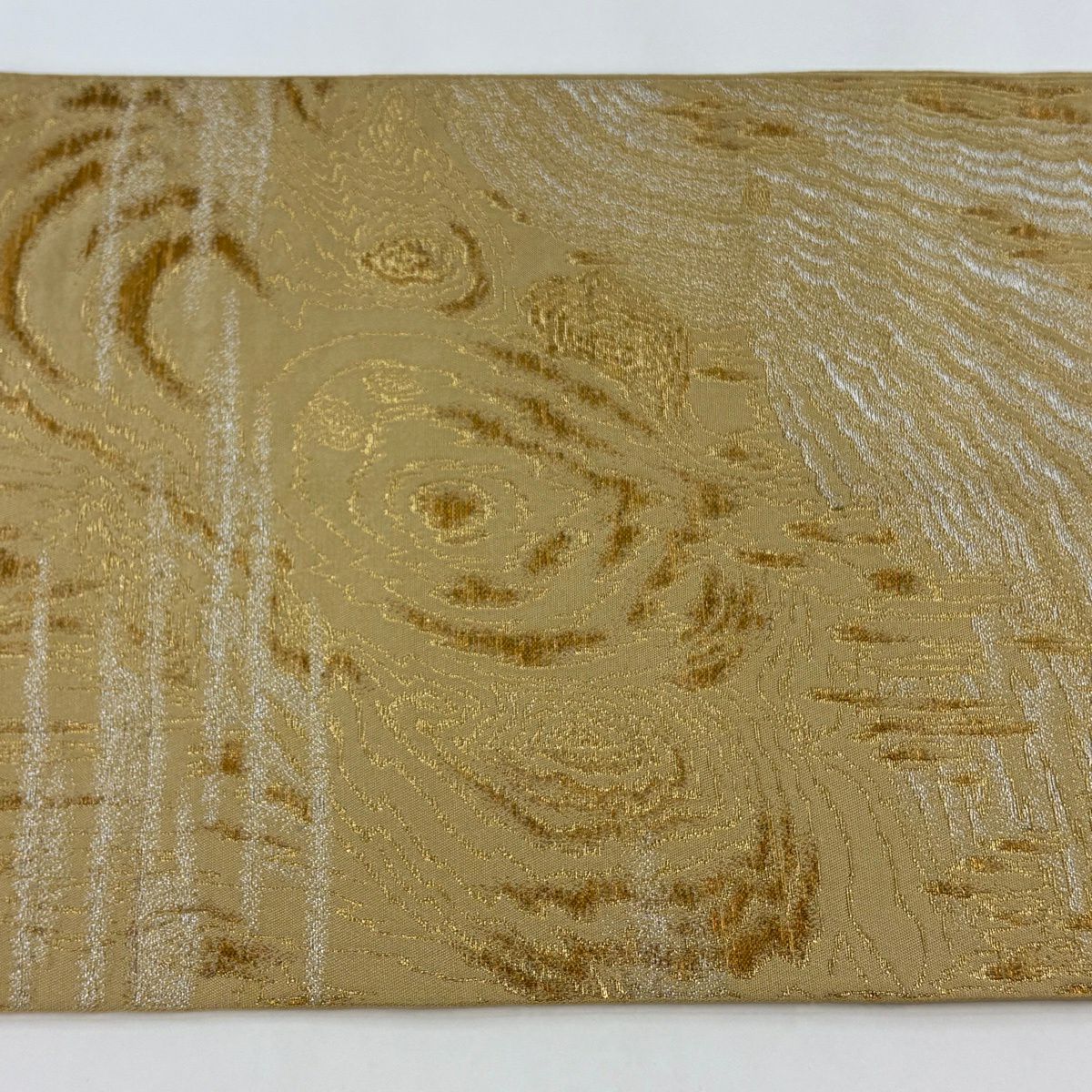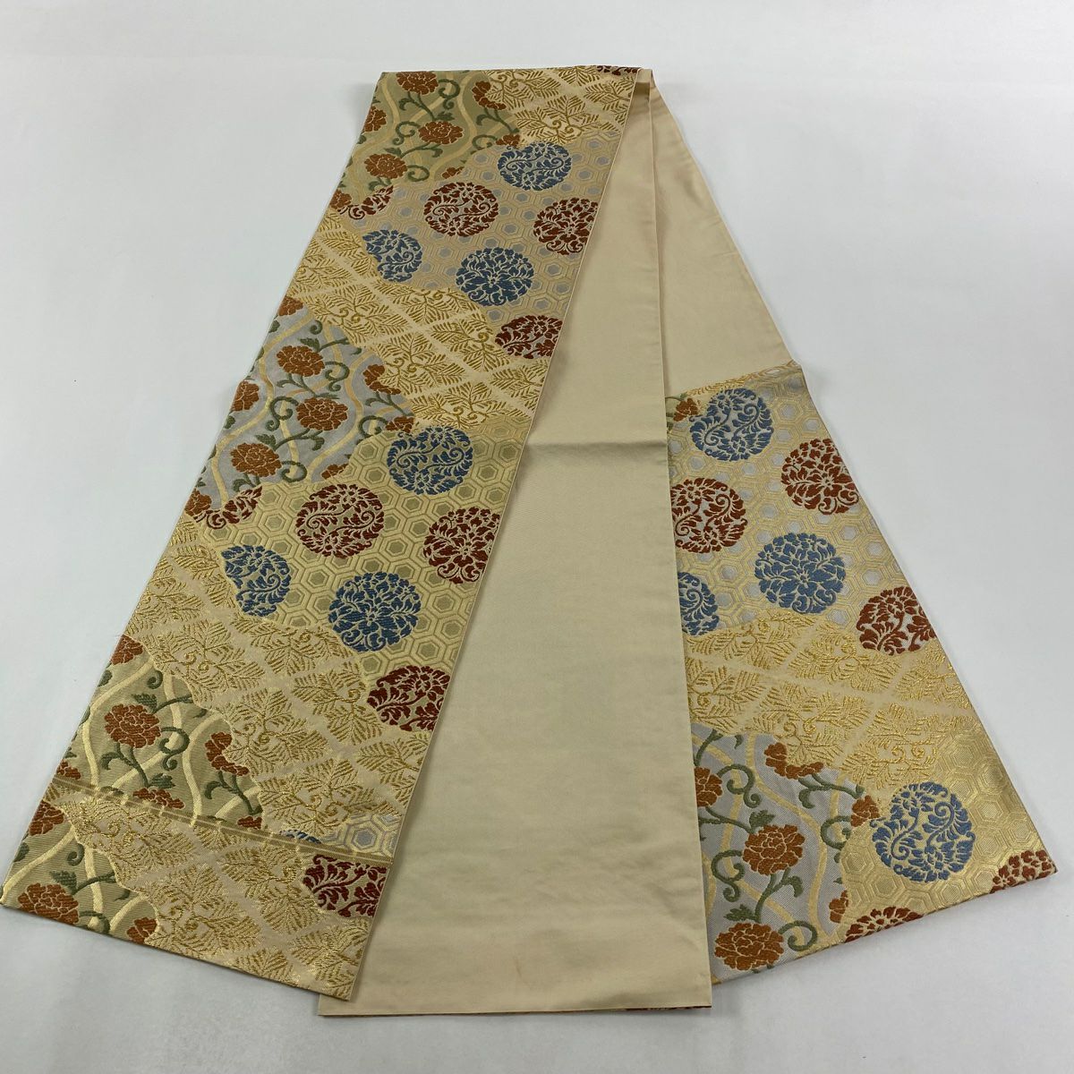袋帯 逸品 龍村平蔵 落款あり 幾何学模様 金銀糸 箔 ベージュ お太鼓柄 正絹