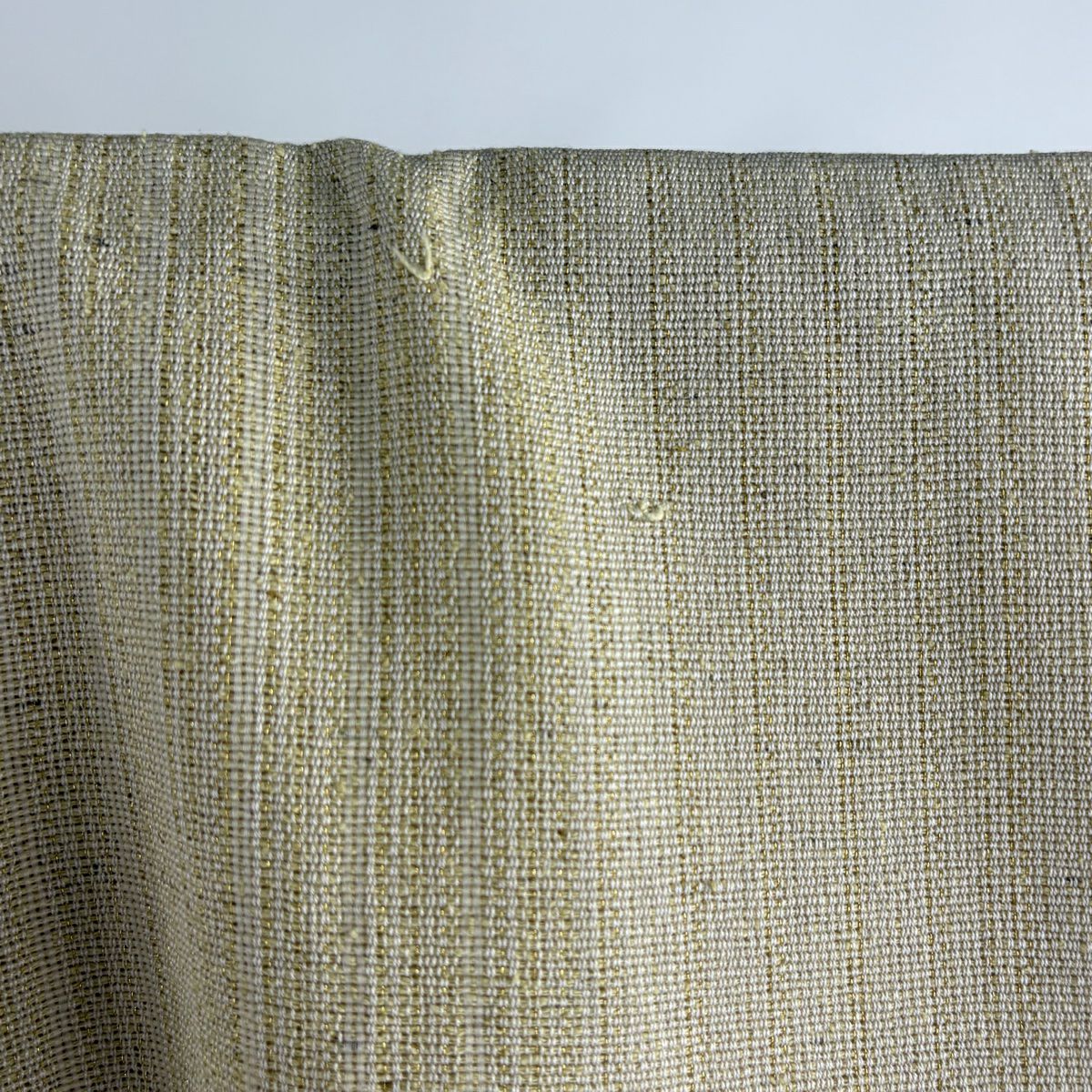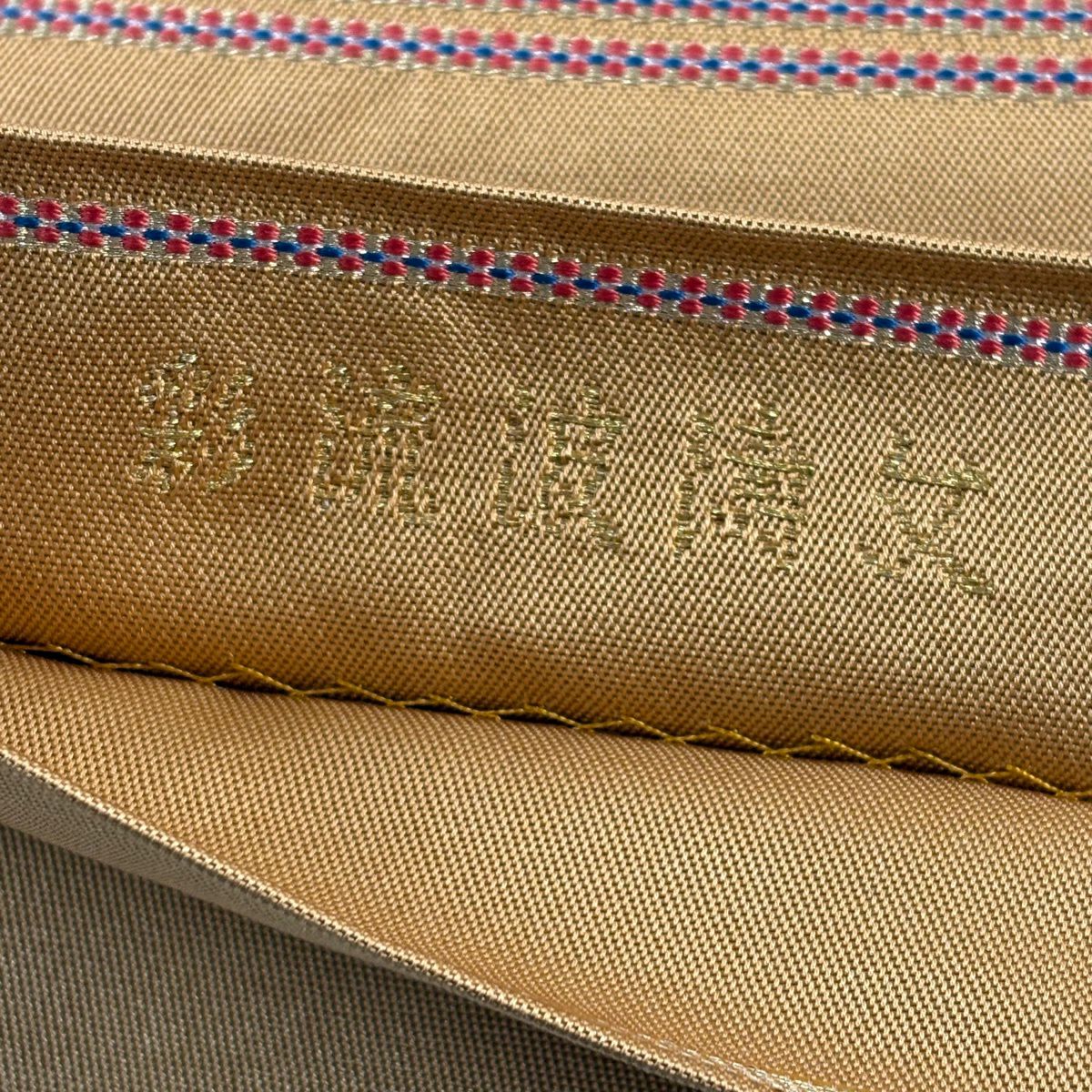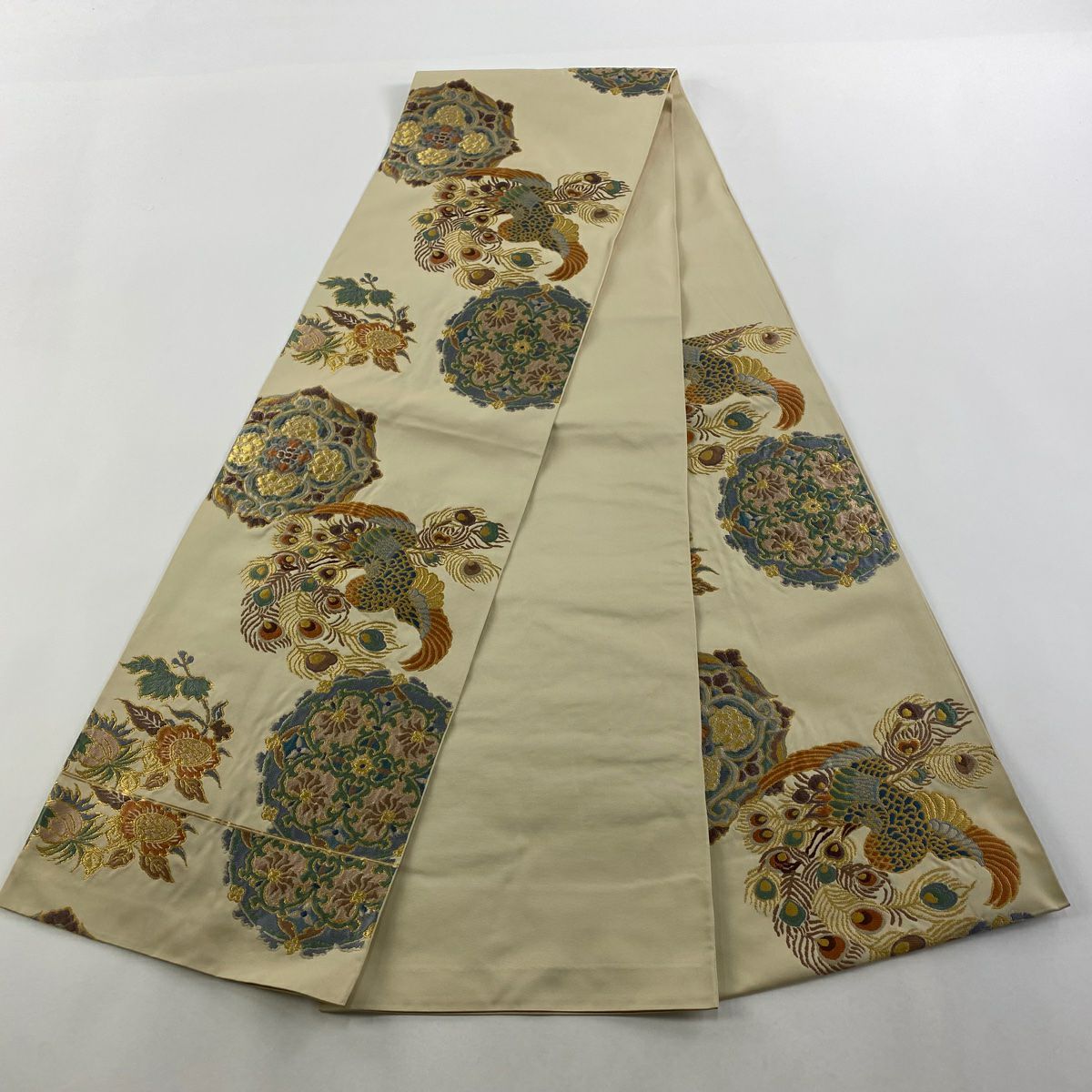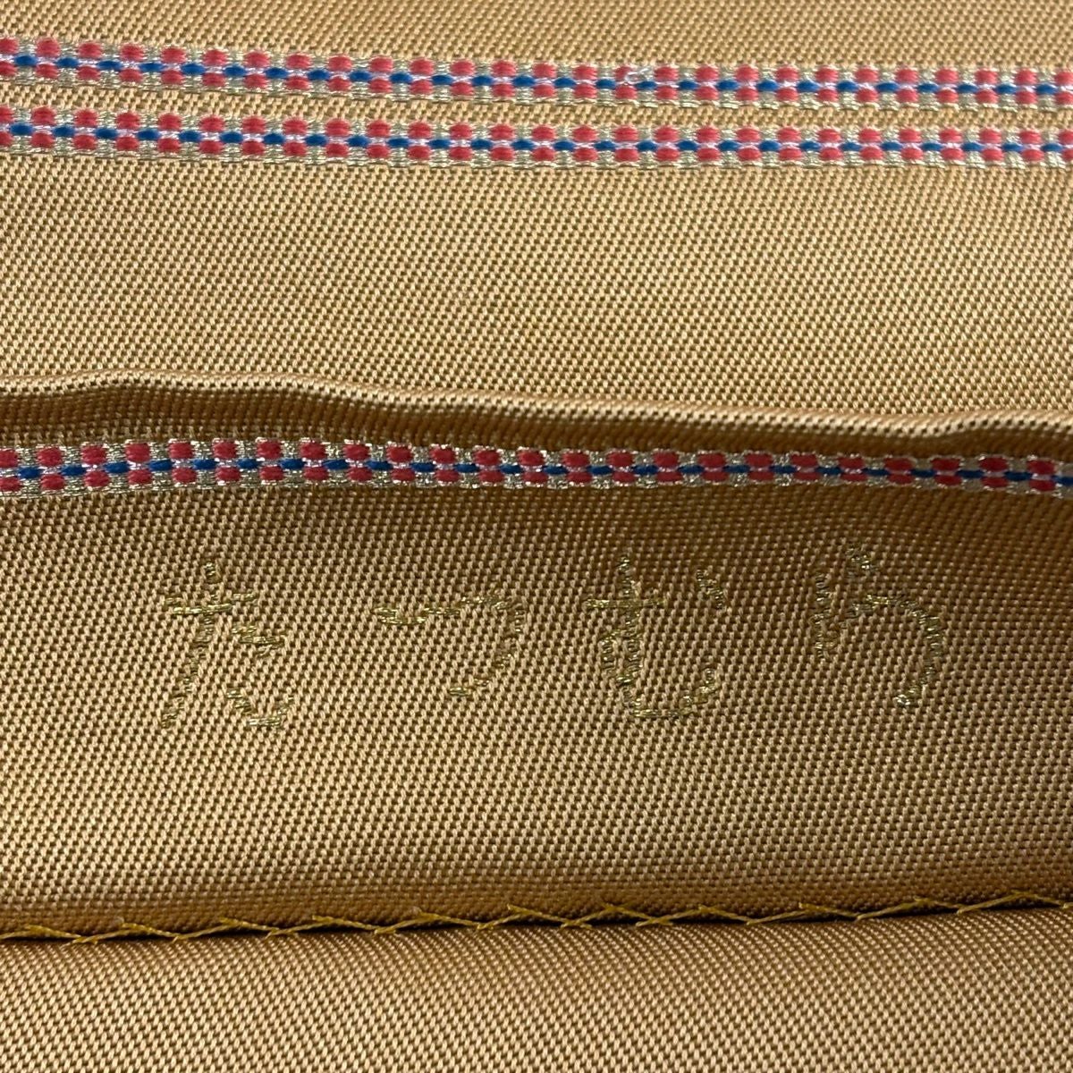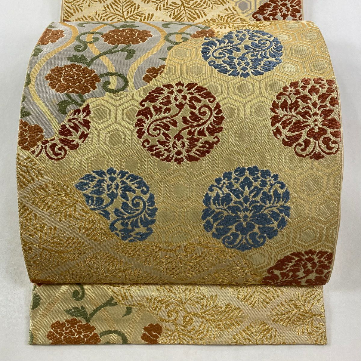 袋帯 逸品 龍村平蔵 落款あり 幾何学模様 金銀糸 箔 ベージュ お太鼓柄 正絹