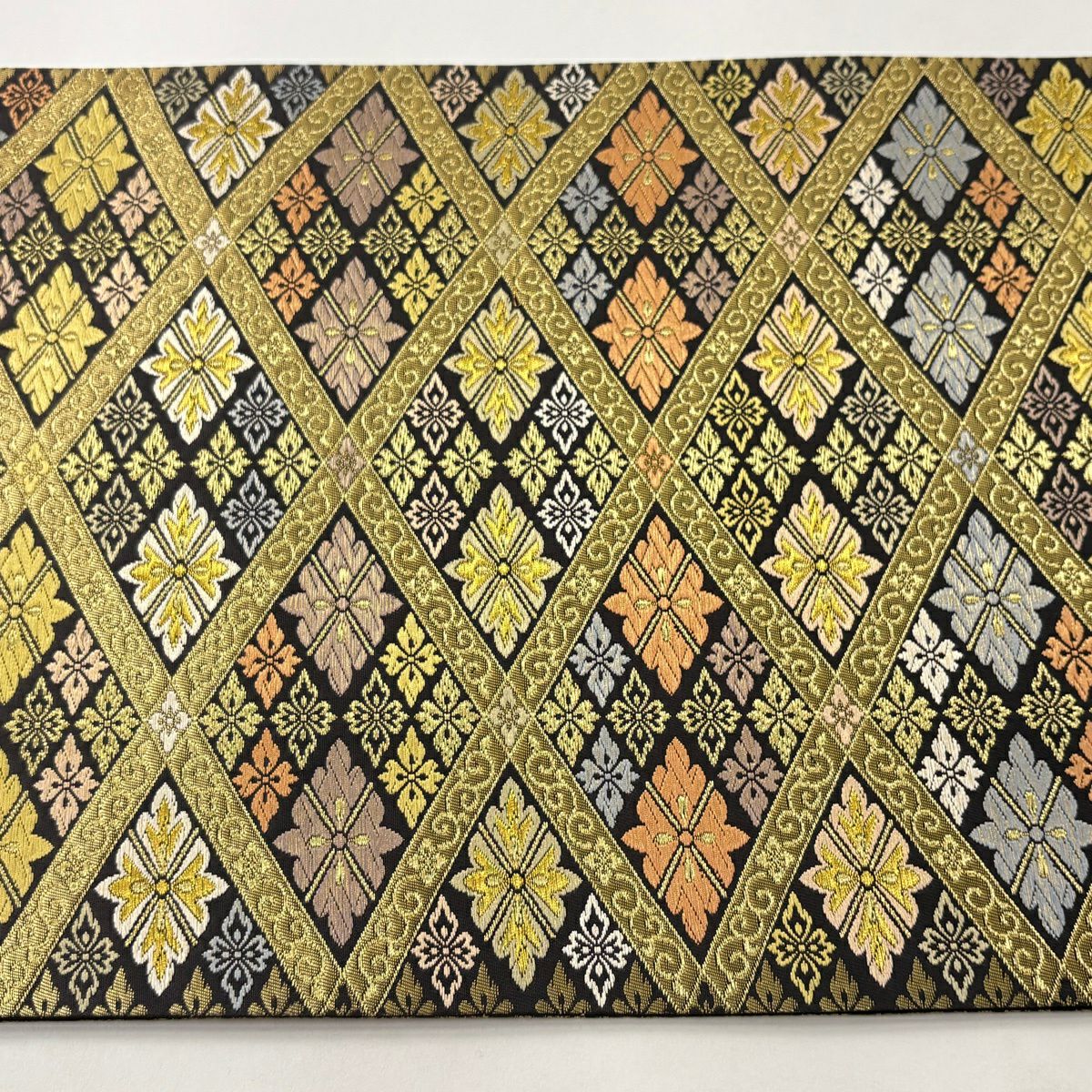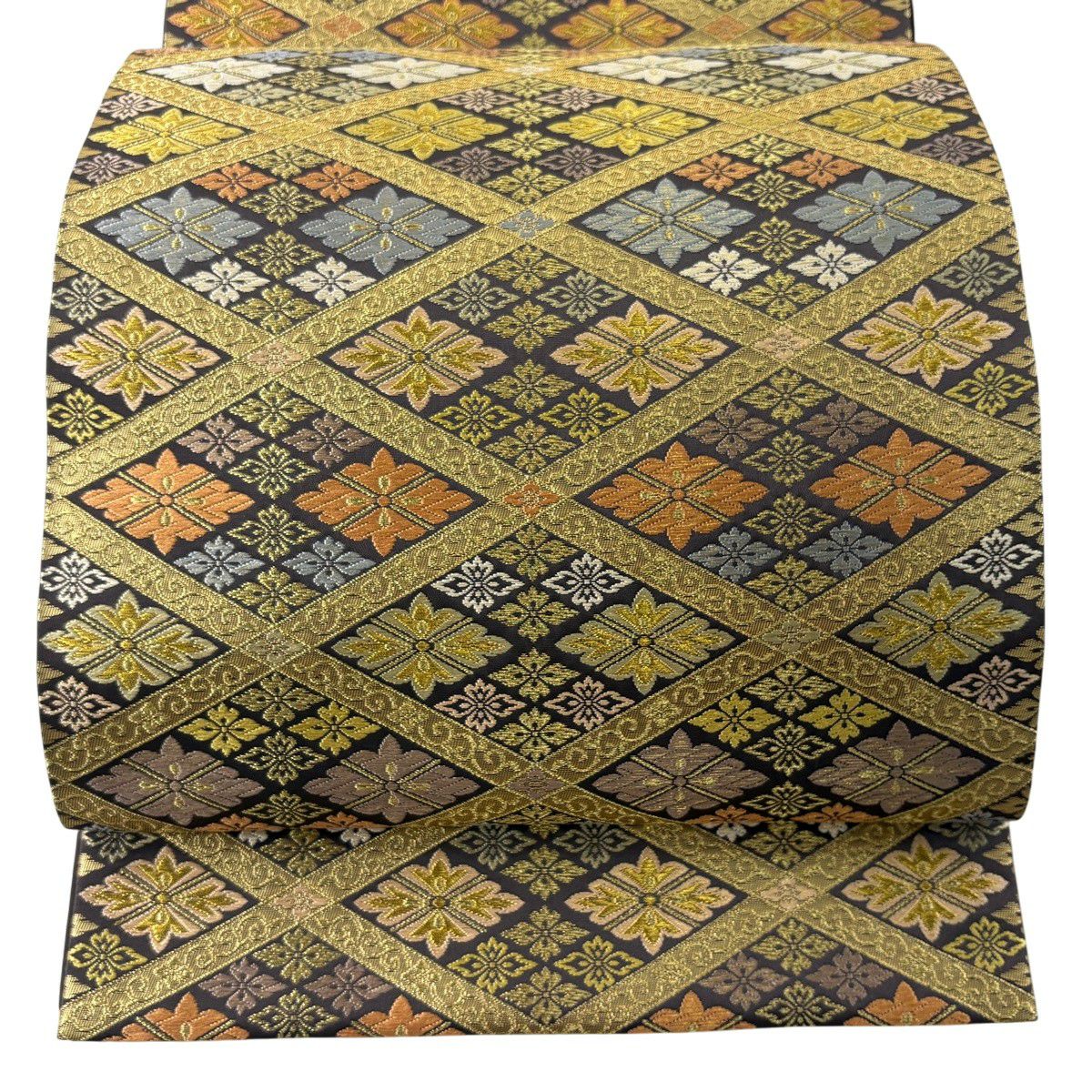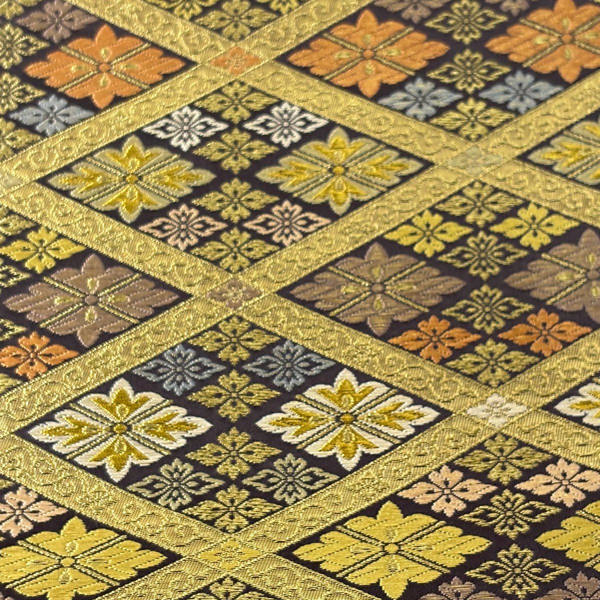 【美品】 袋帯 逸品 落款あり 篠屋宗兵衛 花菱 菱格子 唐織 金糸 金色 六通 正絹