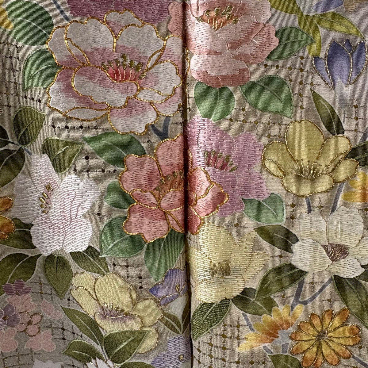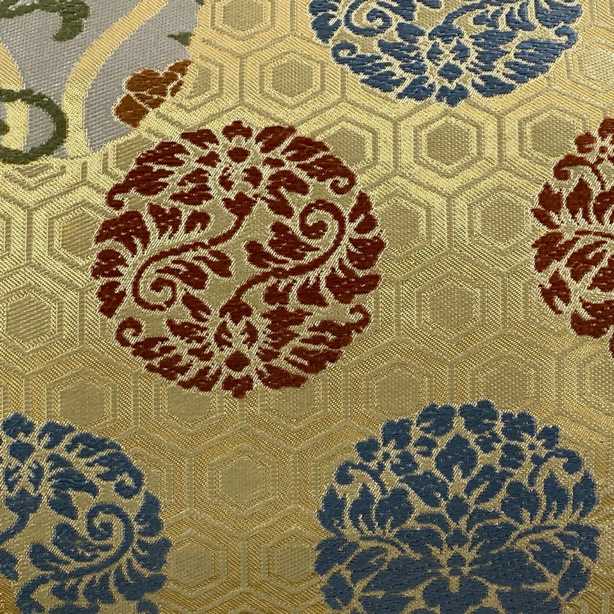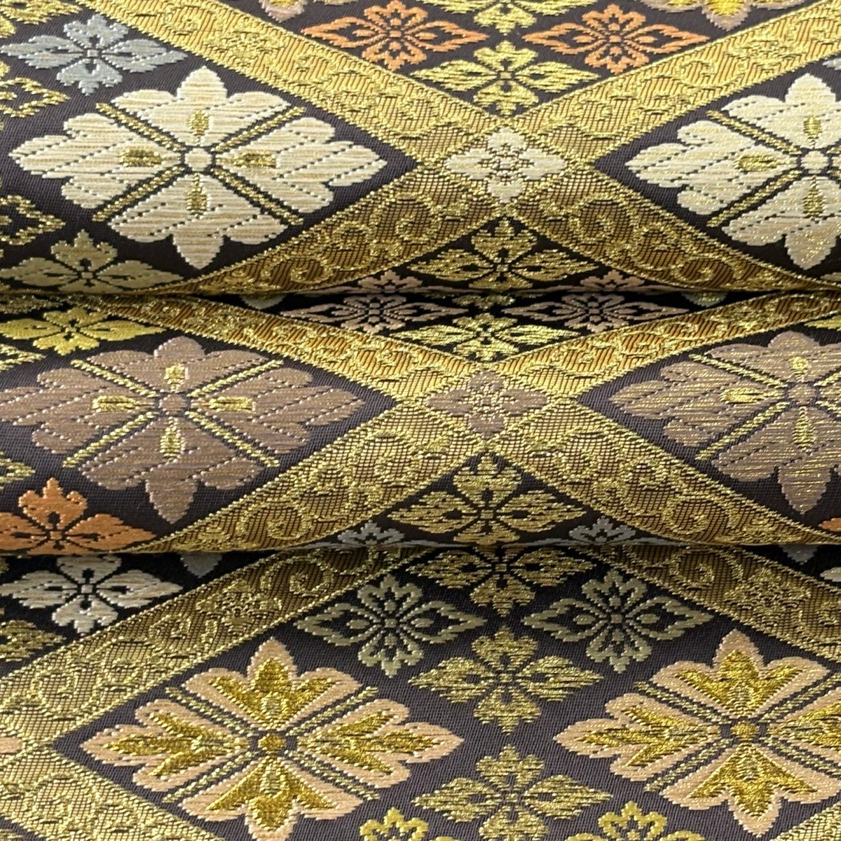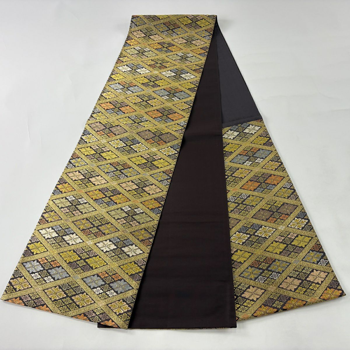 【美品】 袋帯 逸品 落款あり 篠屋宗兵衛 花菱 菱格子 唐織 金糸 金色 六通 正絹