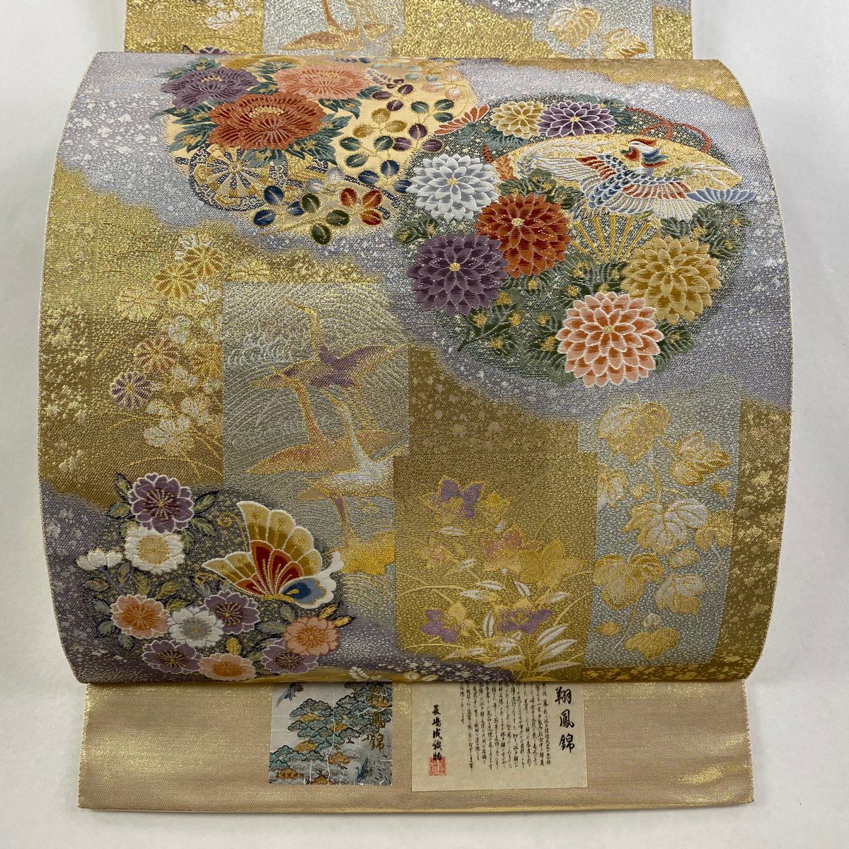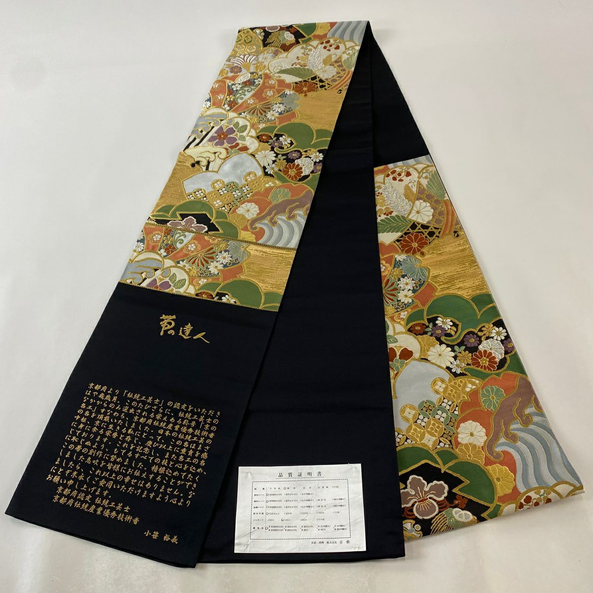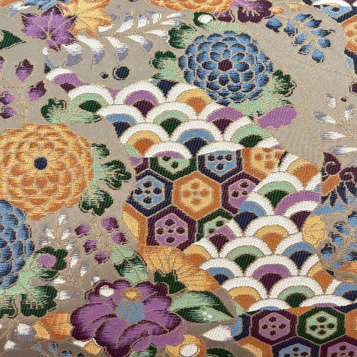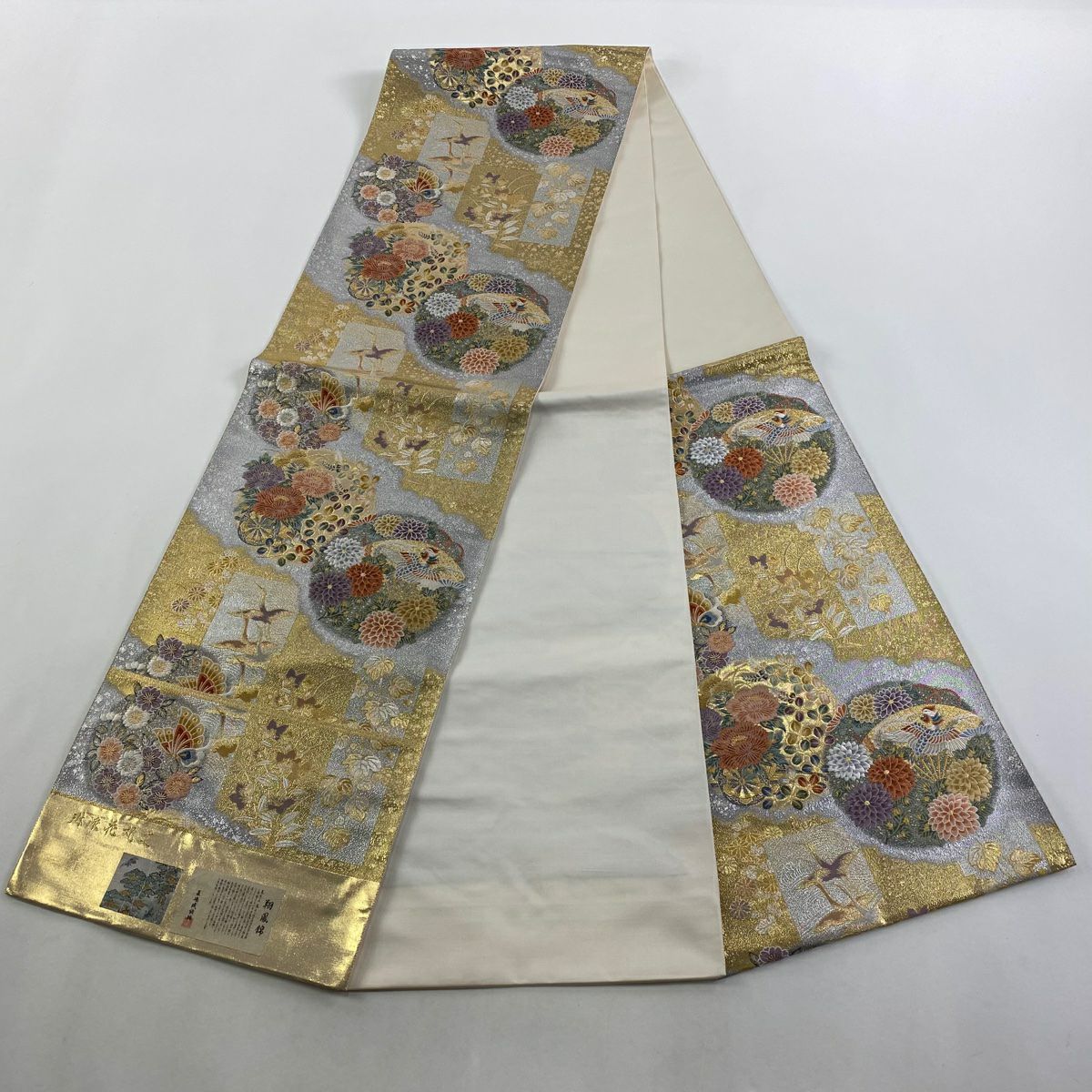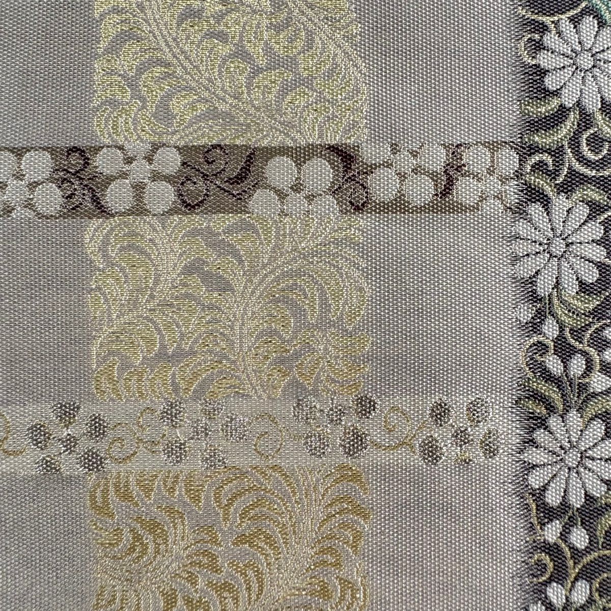 【美品】 袋帯 逸品 白綾苑大庭 落款あり 証紙あり 菊 青海波 箔 灰色 六通 正絹