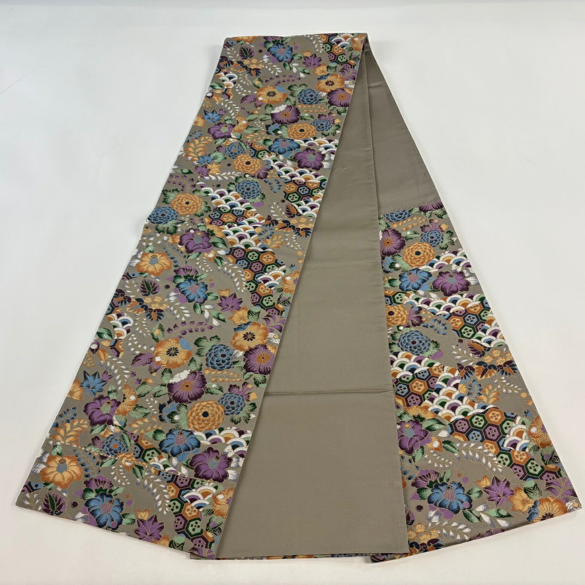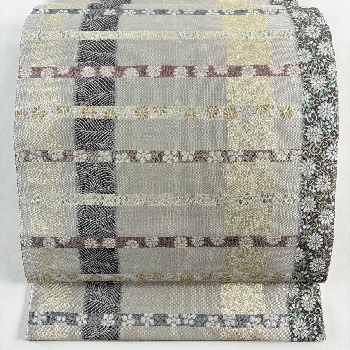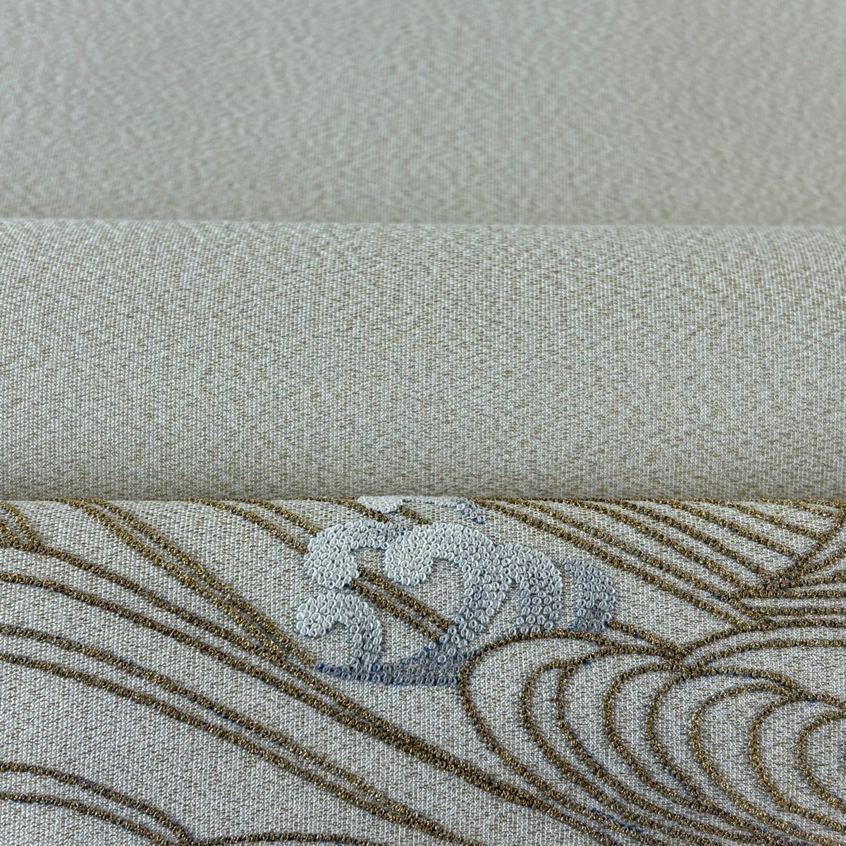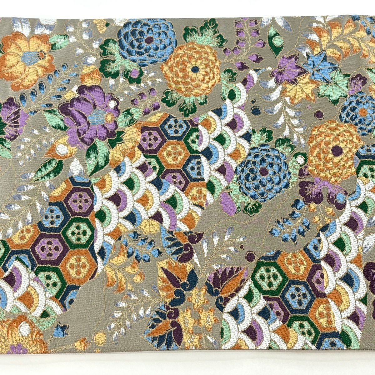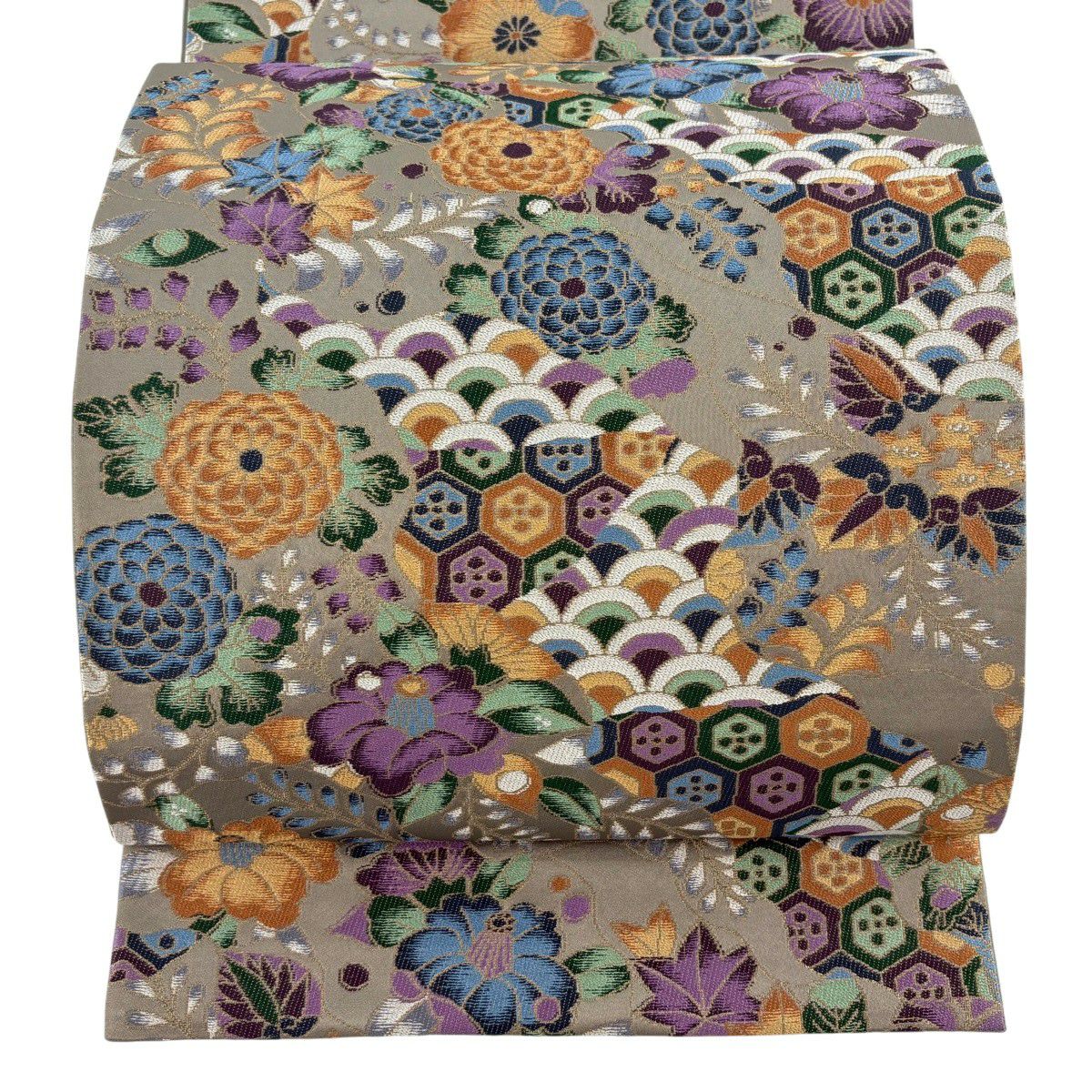 【美品】 袋帯 逸品 白綾苑大庭 落款あり 証紙あり 菊 青海波 箔 灰色 六通 正絹