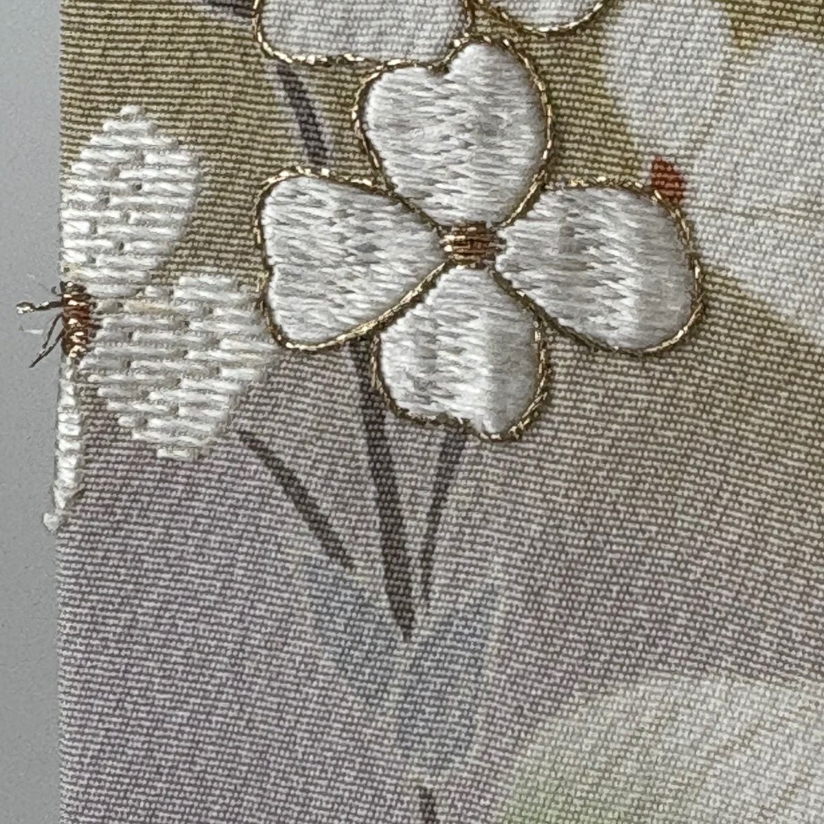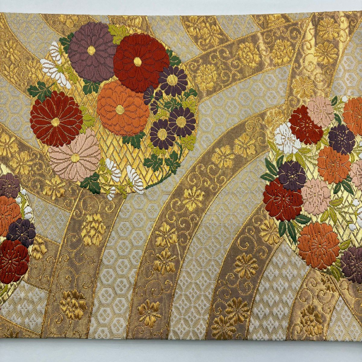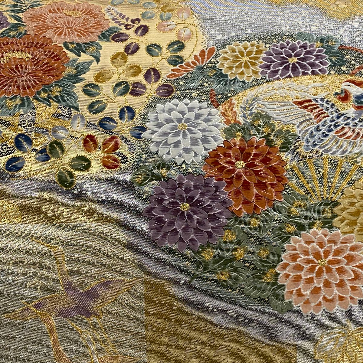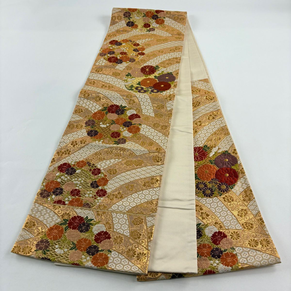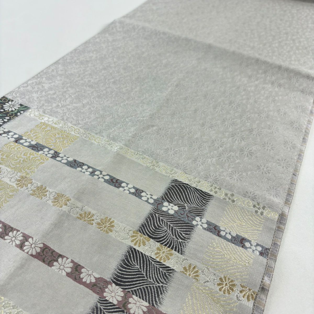 【美品】 袋帯 逸品 白綾苑大庭 落款あり 証紙あり 菊 青海波 箔 灰色 六通 正絹