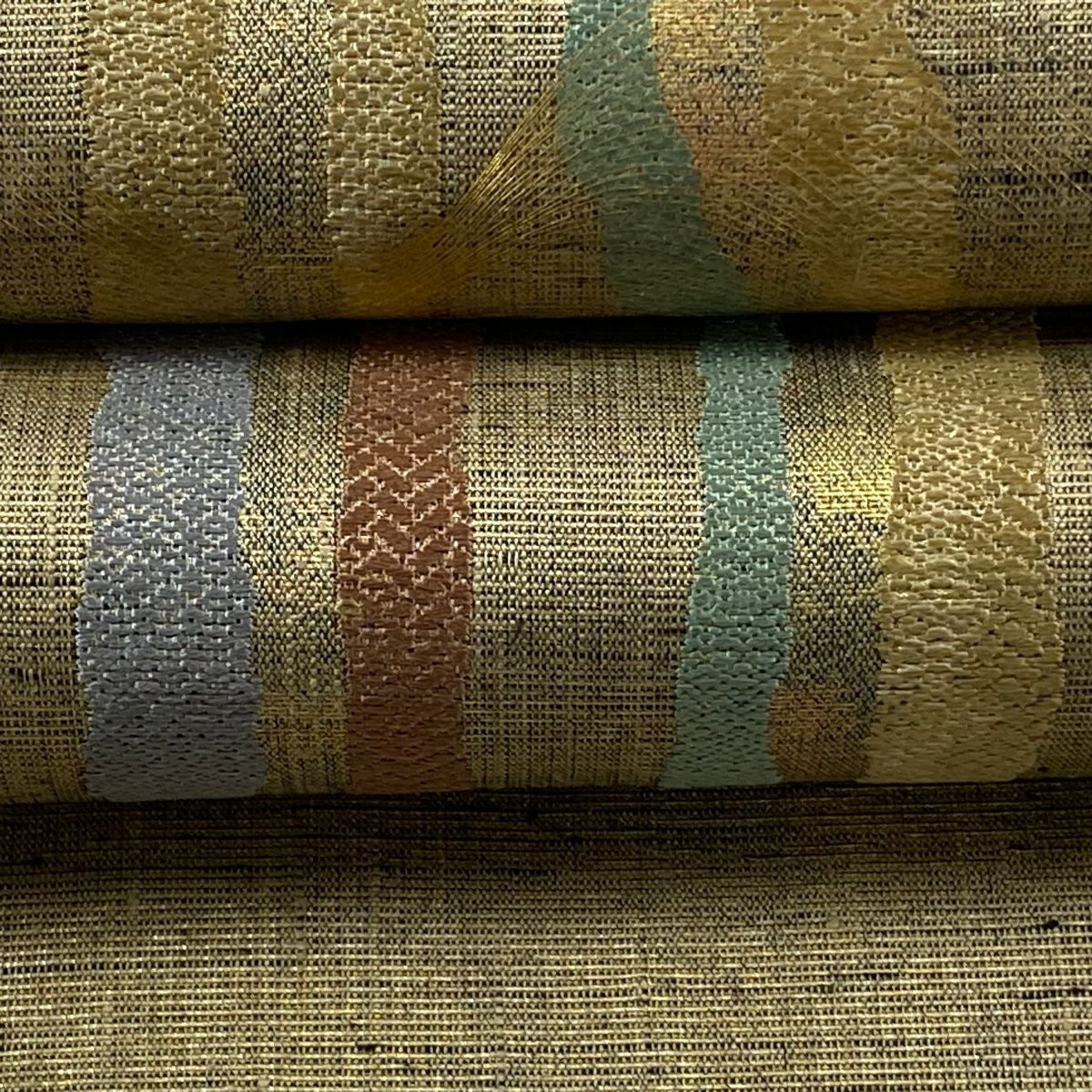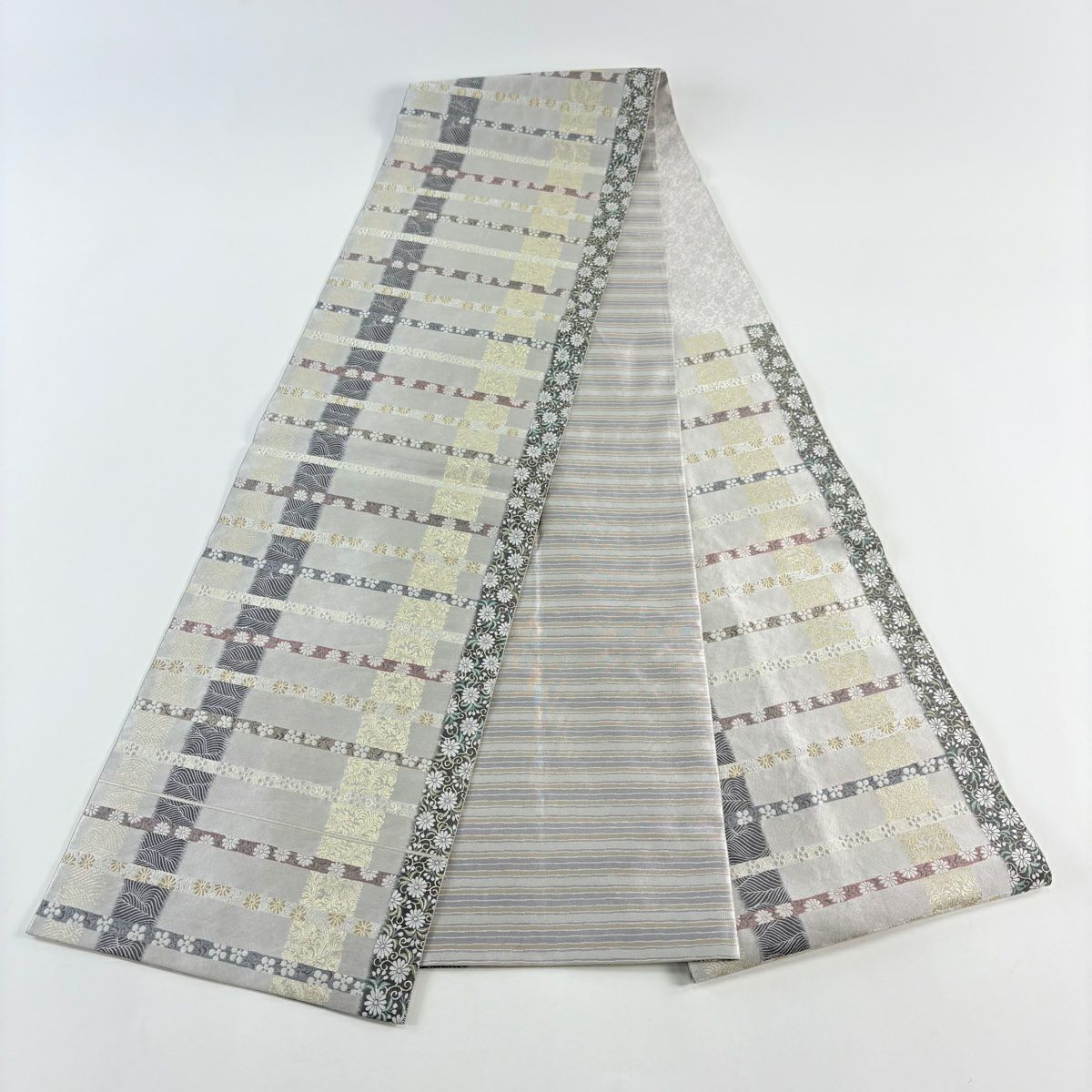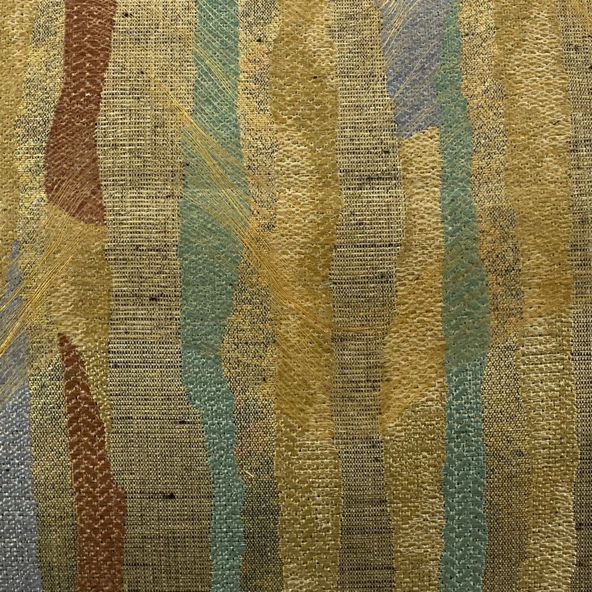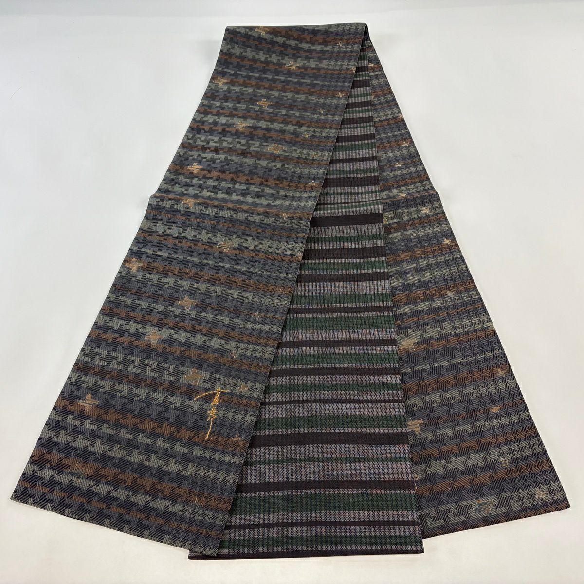【美品】 袋帯 逸品 斉藤上太郎 落款あり 段縞 幾何学模様 金糸 灰緑 全通 正絹