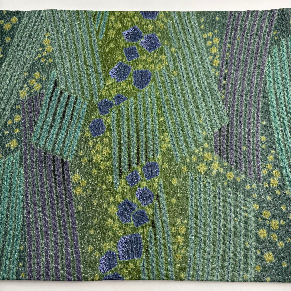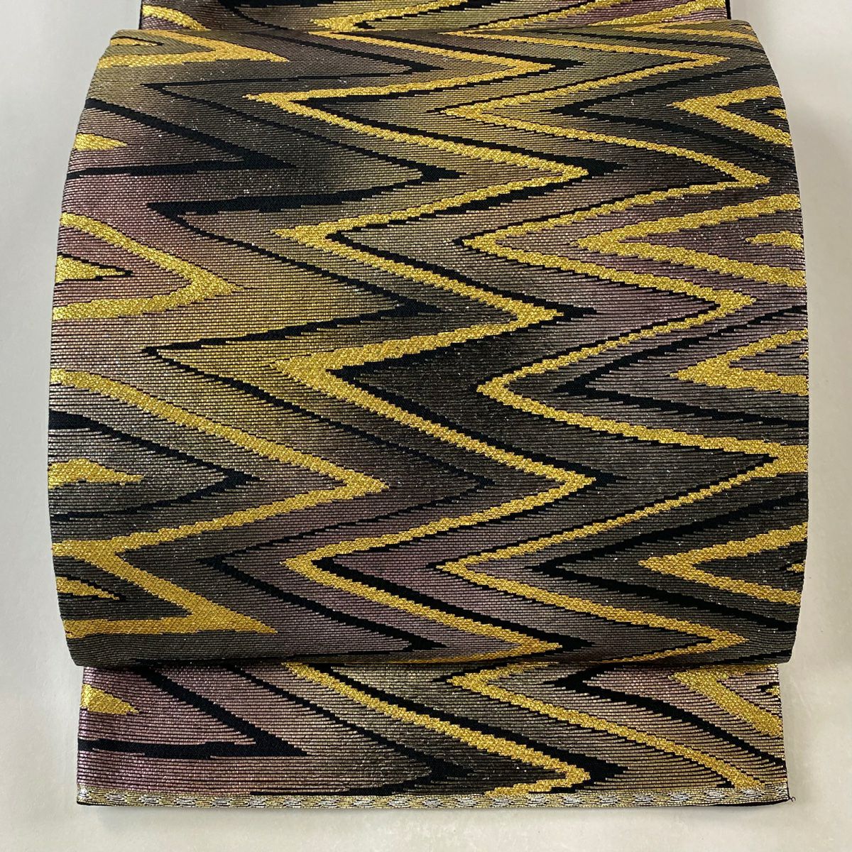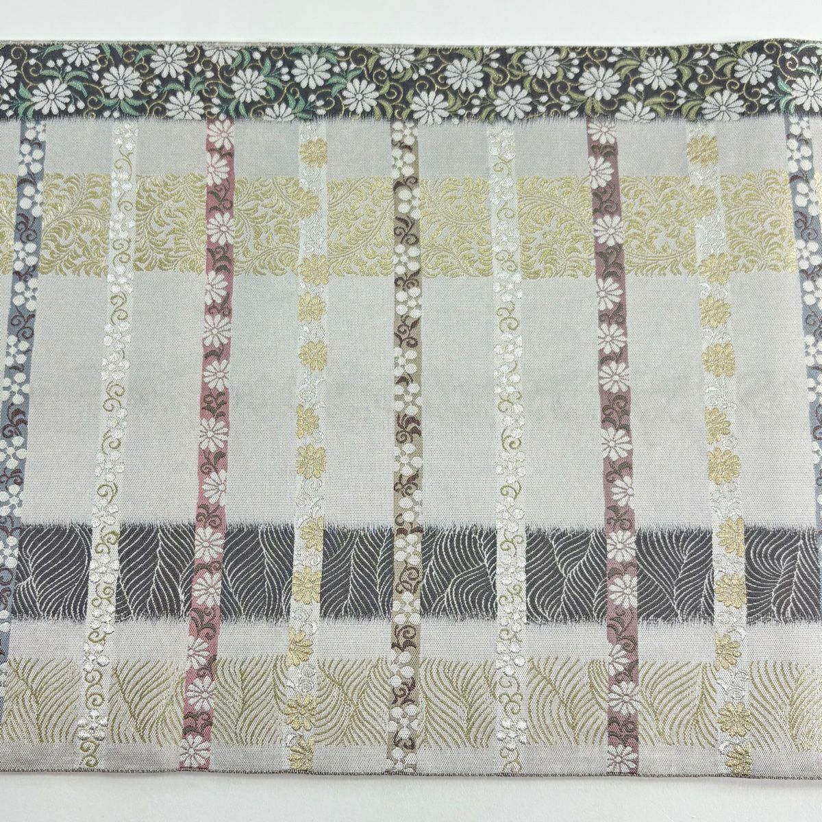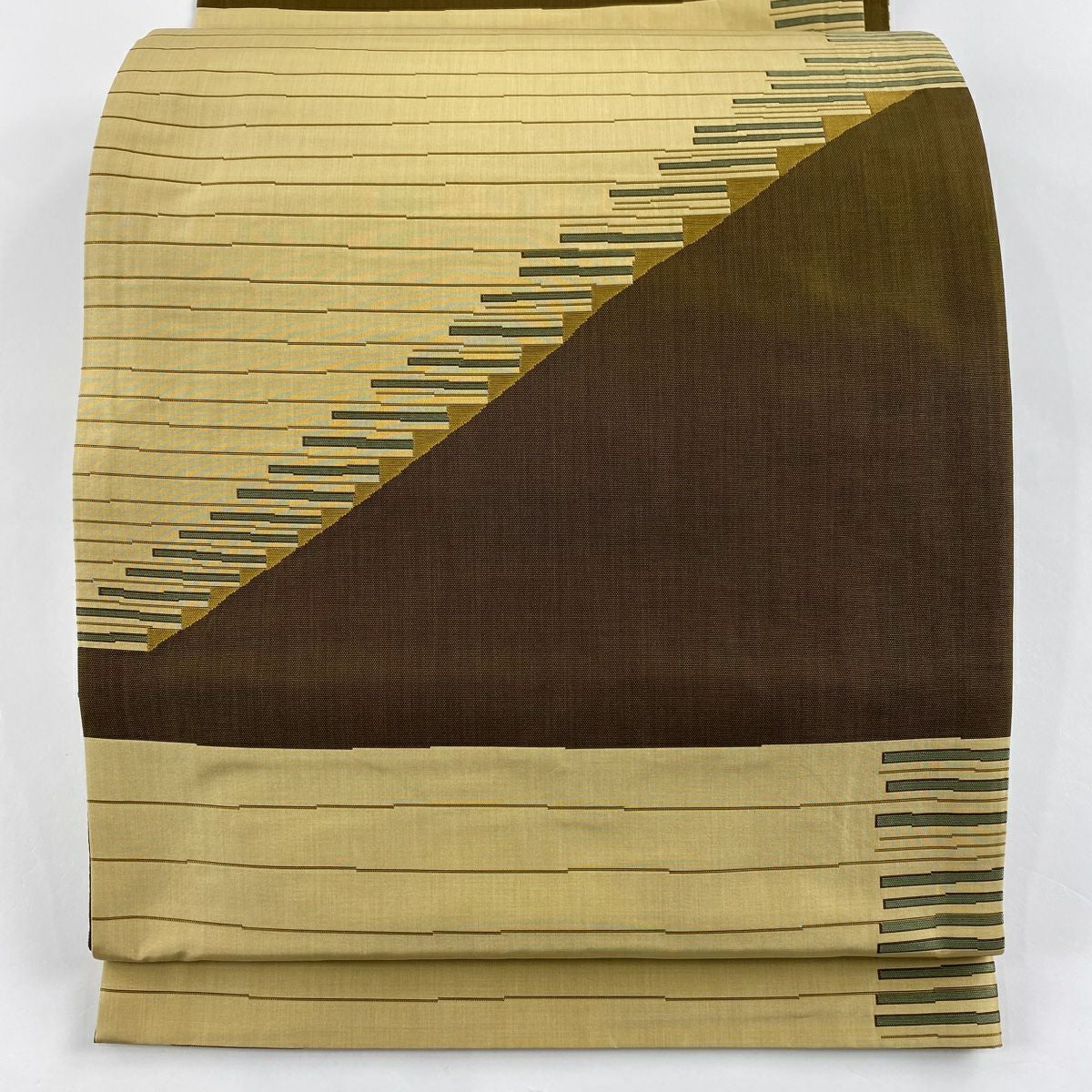 【美品】 袋帯 逸品 斉藤上太郎 落款あり 段縞 幾何学模様 金糸 灰緑 全通 正絹