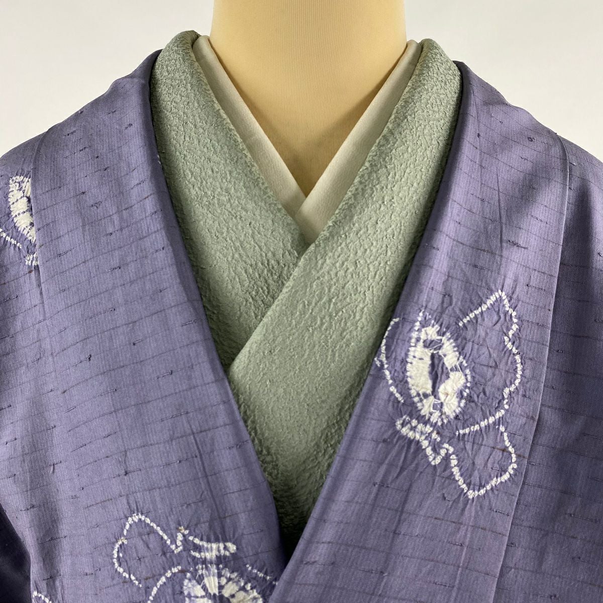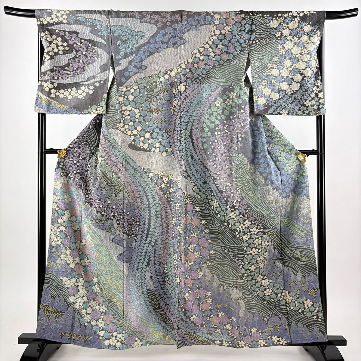 訪問着 身丈160cm 裄丈68cm L 袷 草花 波 金通し 絞り 灰紫 正絹 逸品